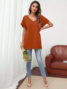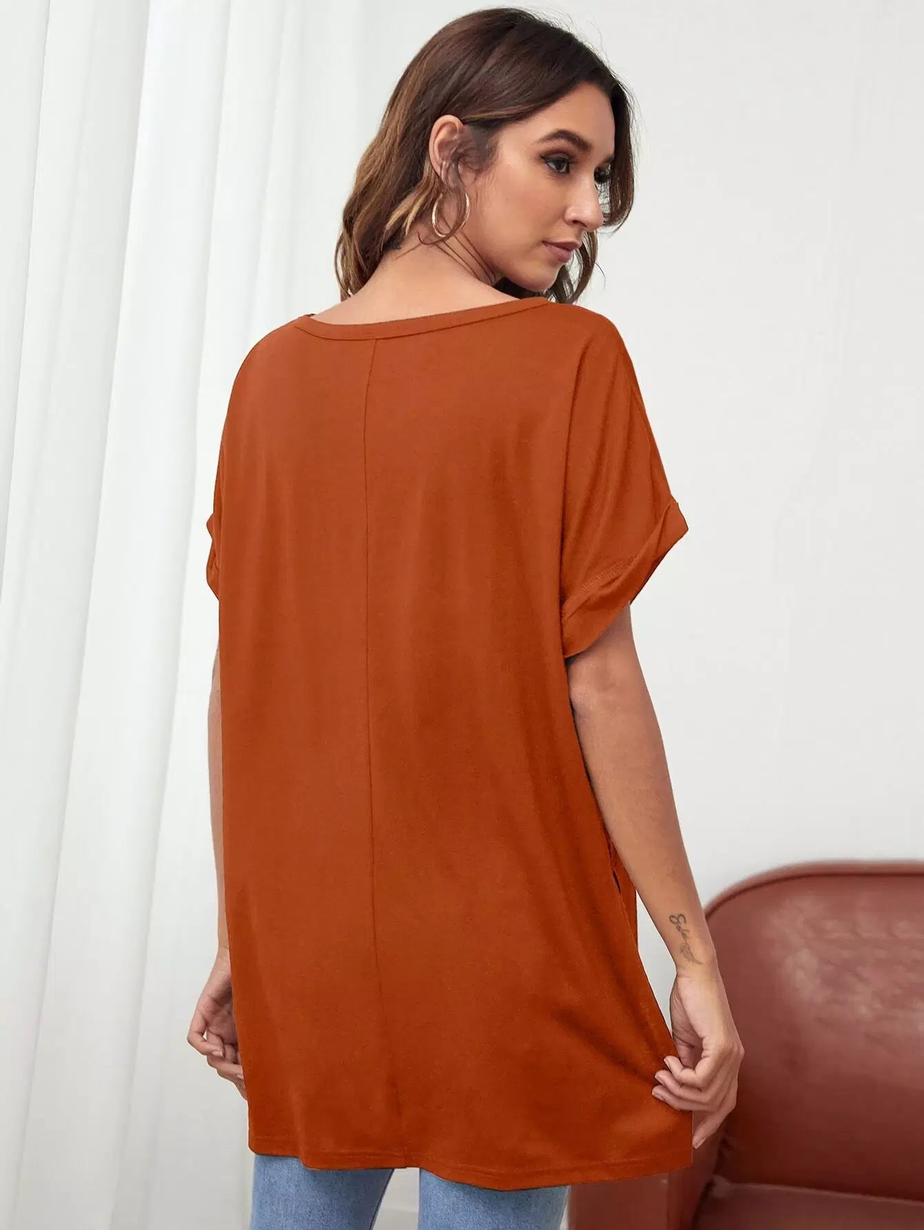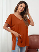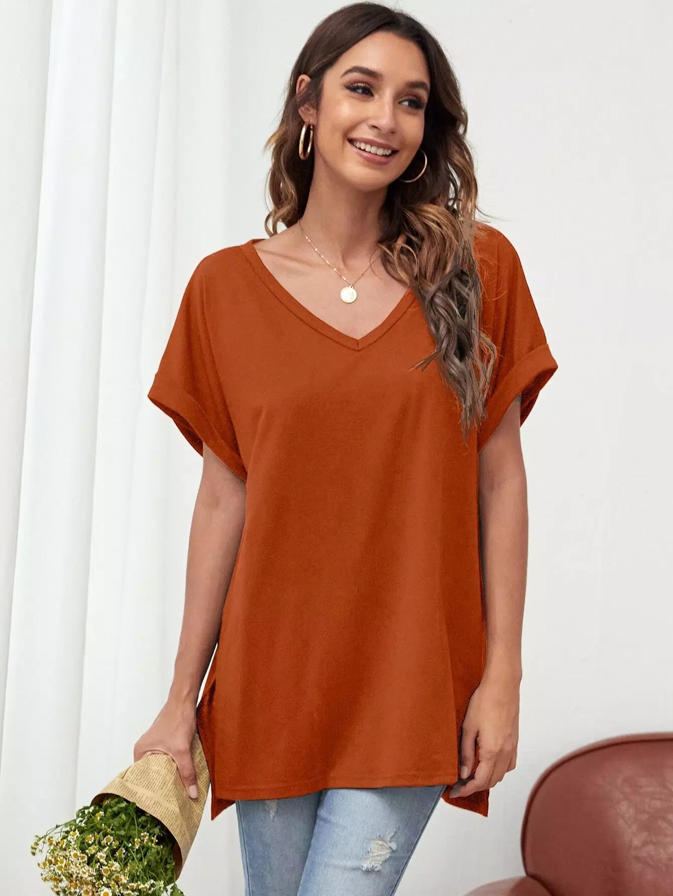 تي شيرت سادة بفتحة رقبة على شكل حرف V وحاشية مقسمة