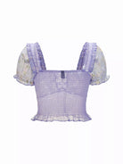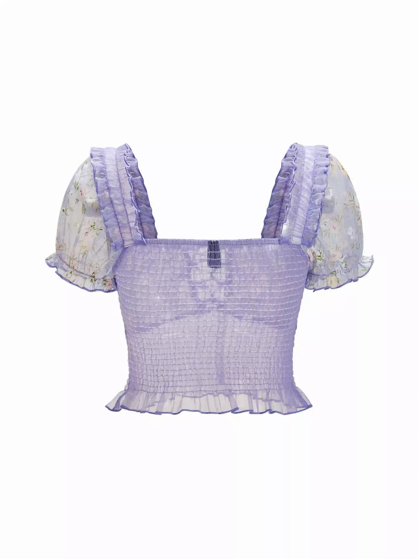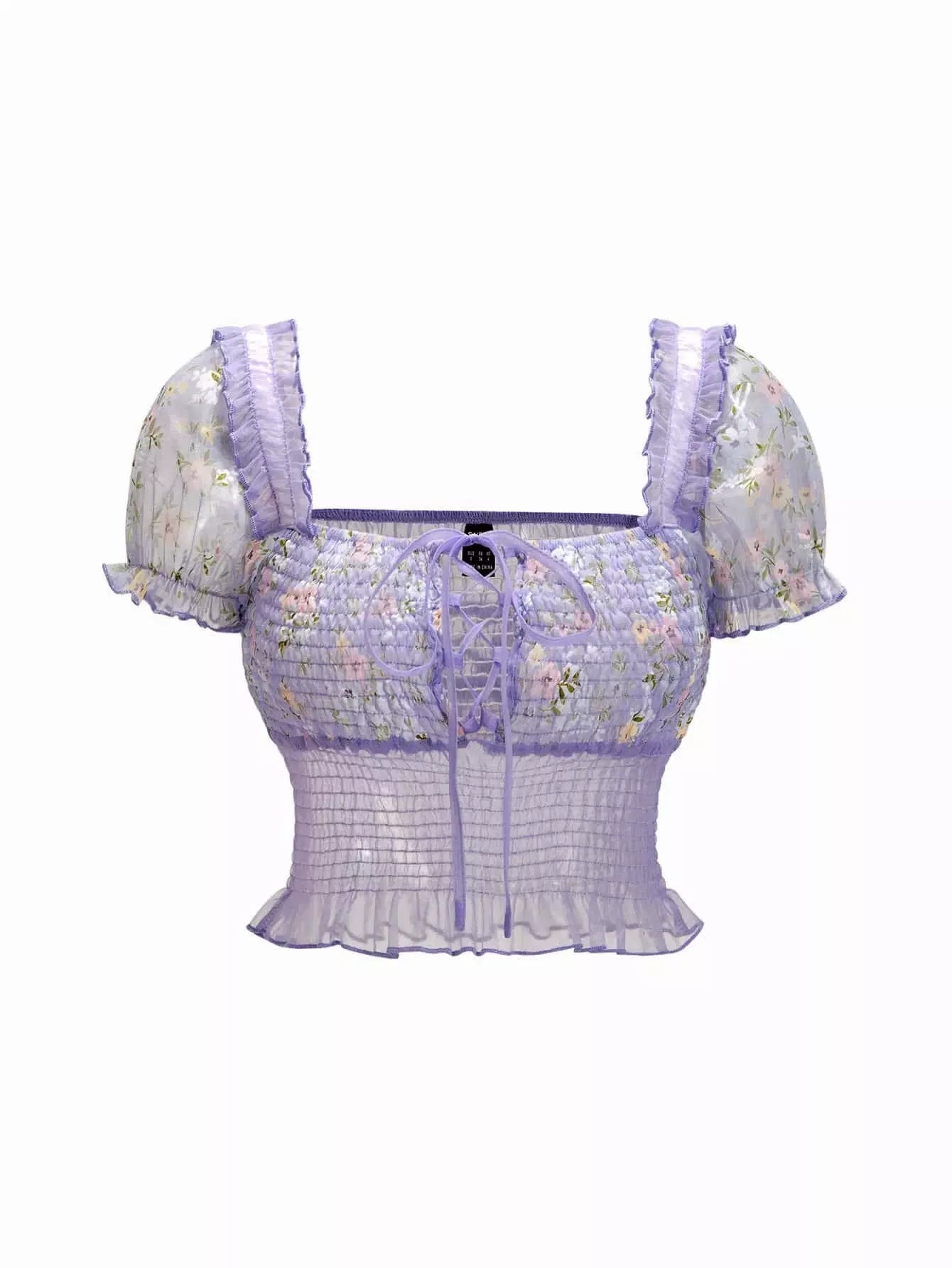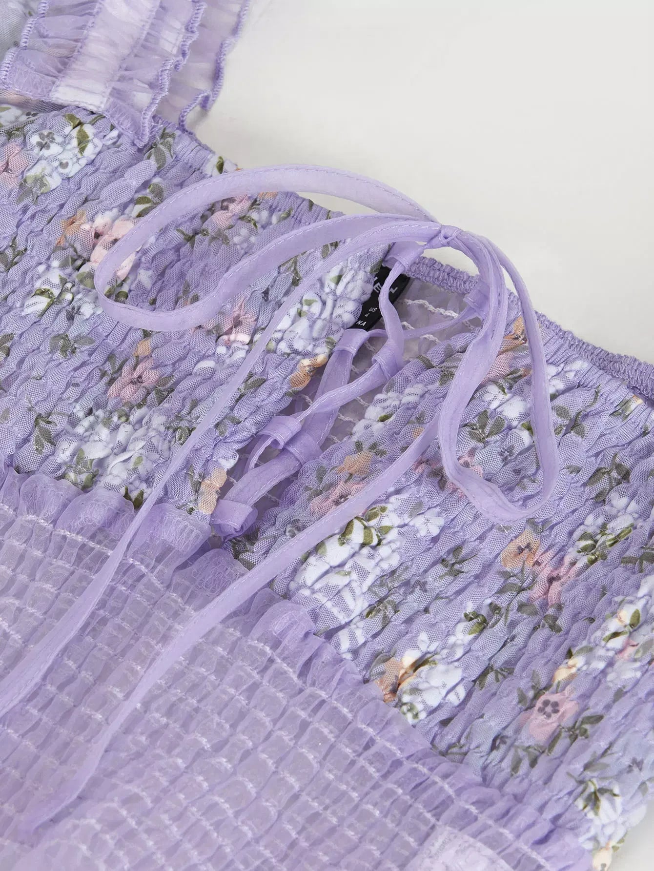 توب أورجانزا بحاشية كشكش مربعة برقبة مربعة بطبعة زهور وربطة عنق أمامية