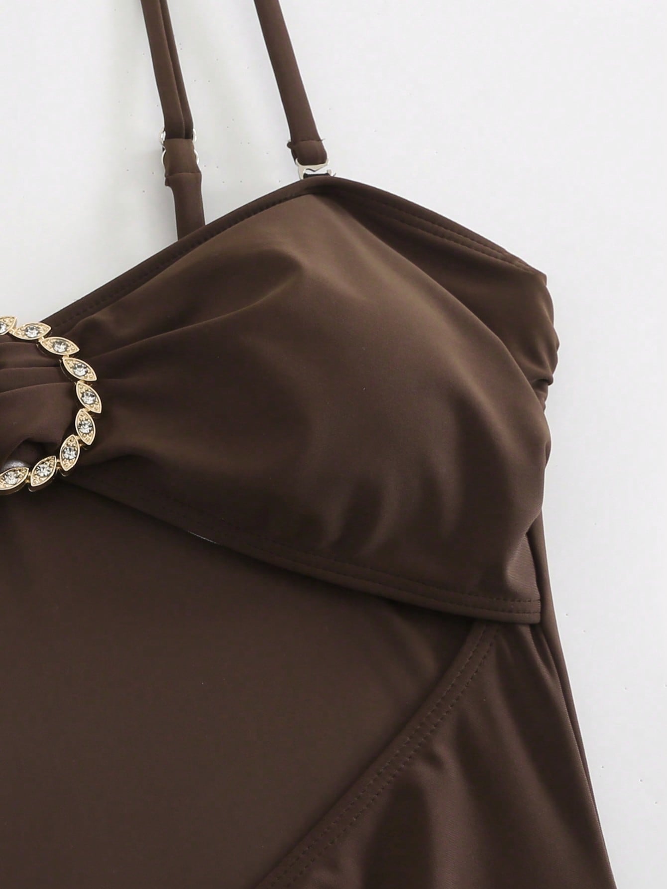 Swim SXY Summer Women Hollow-Out Circle Ring Decor Coffee Brown Removable Spaghetti Strap Swimsuit +