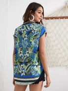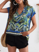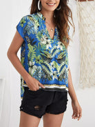 بلوزة بطبعة استوائية برقبة بفتحة رقبة مدببة
