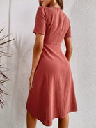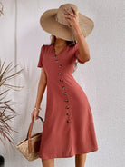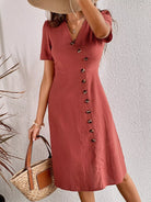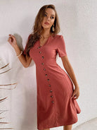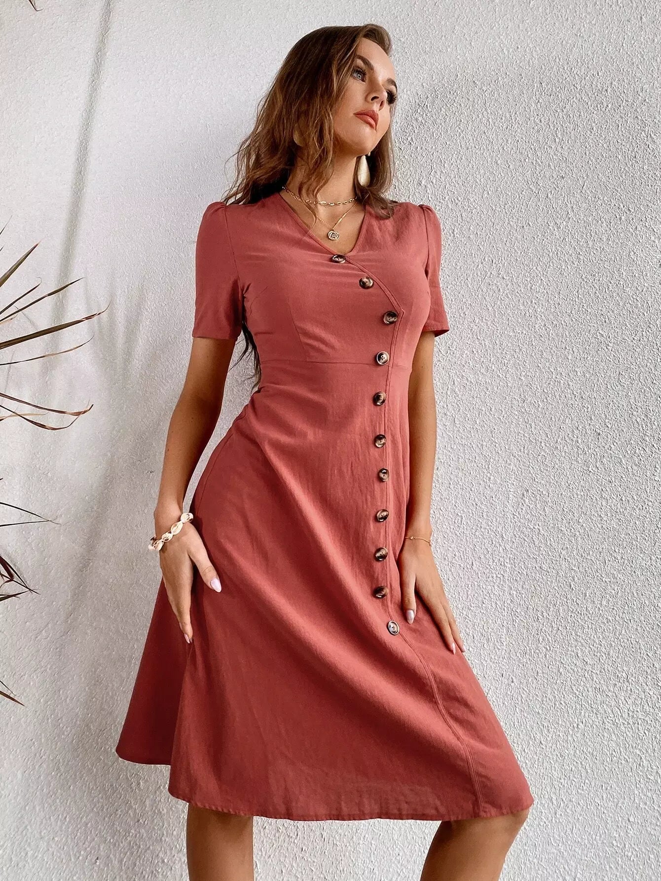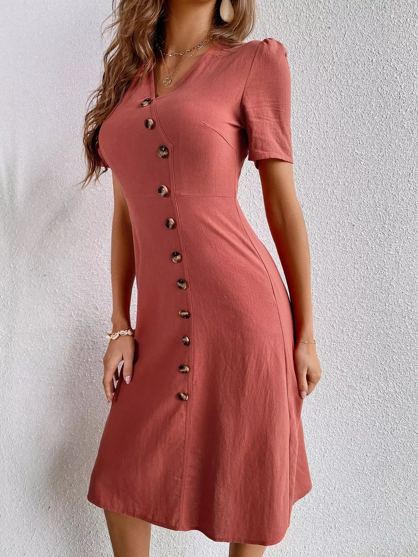 فستان سادة بفتحة رقبة على شكل حرف V وأزرار أمامية