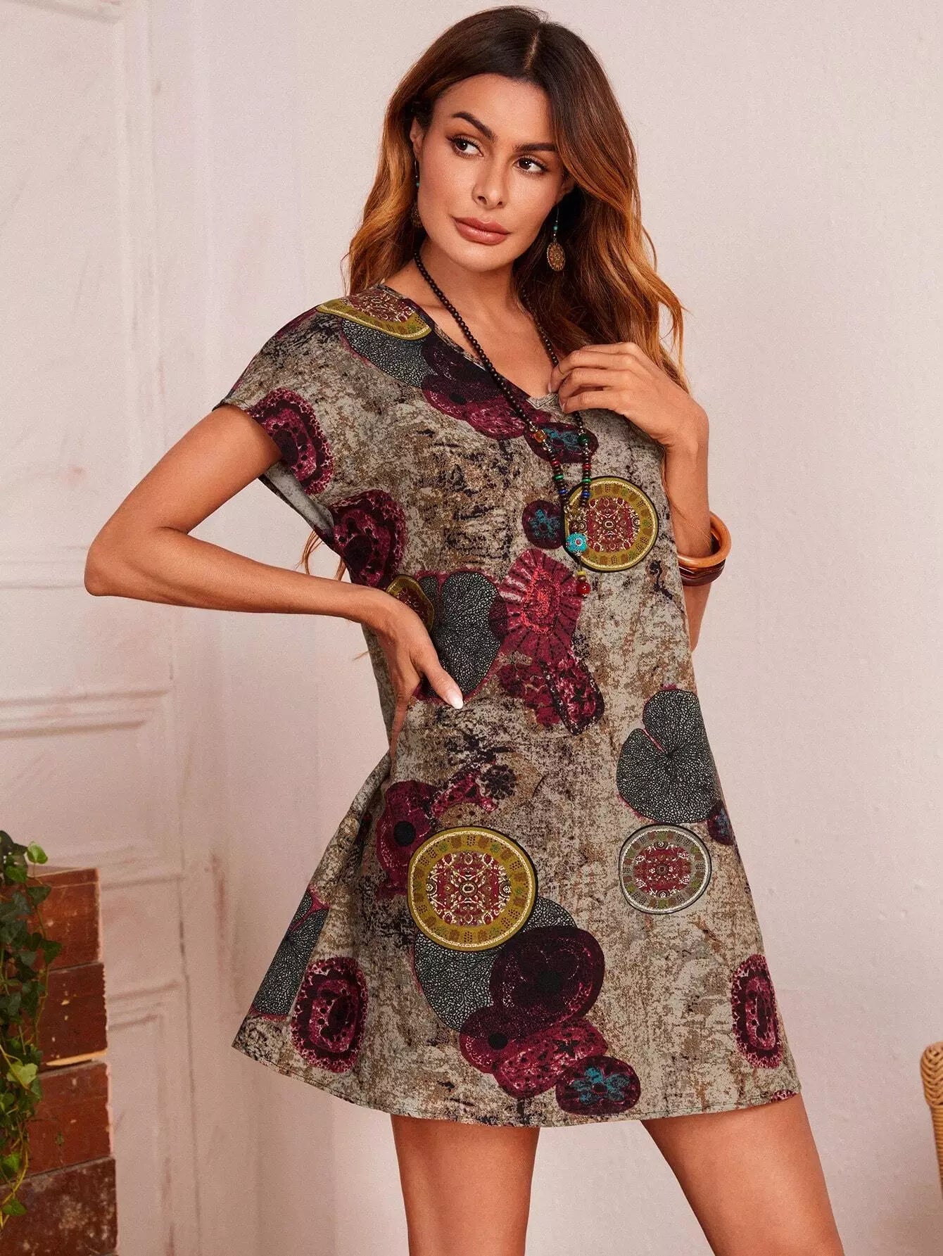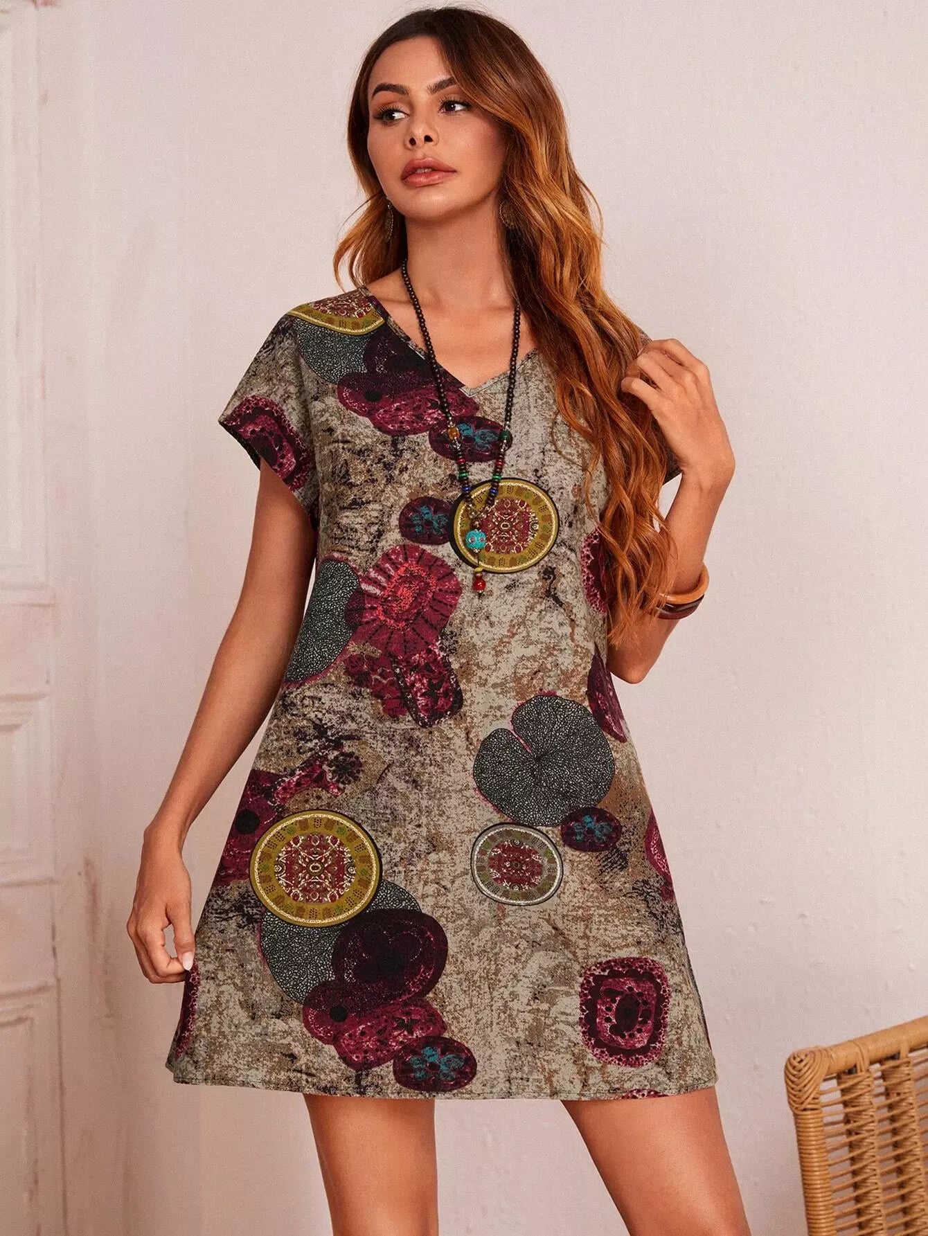 فستان تونيك بطبعة جرافيكية وفتحة رقبة على شكل حرف V