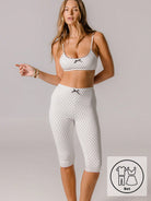 طقم تمرين رياضي من أرالينا ليجروير، توب قصير بنقشة نقاط البولكا وحمالات رفيعة، مع بنطال ضيق كابري بتفاصيل فيونكة