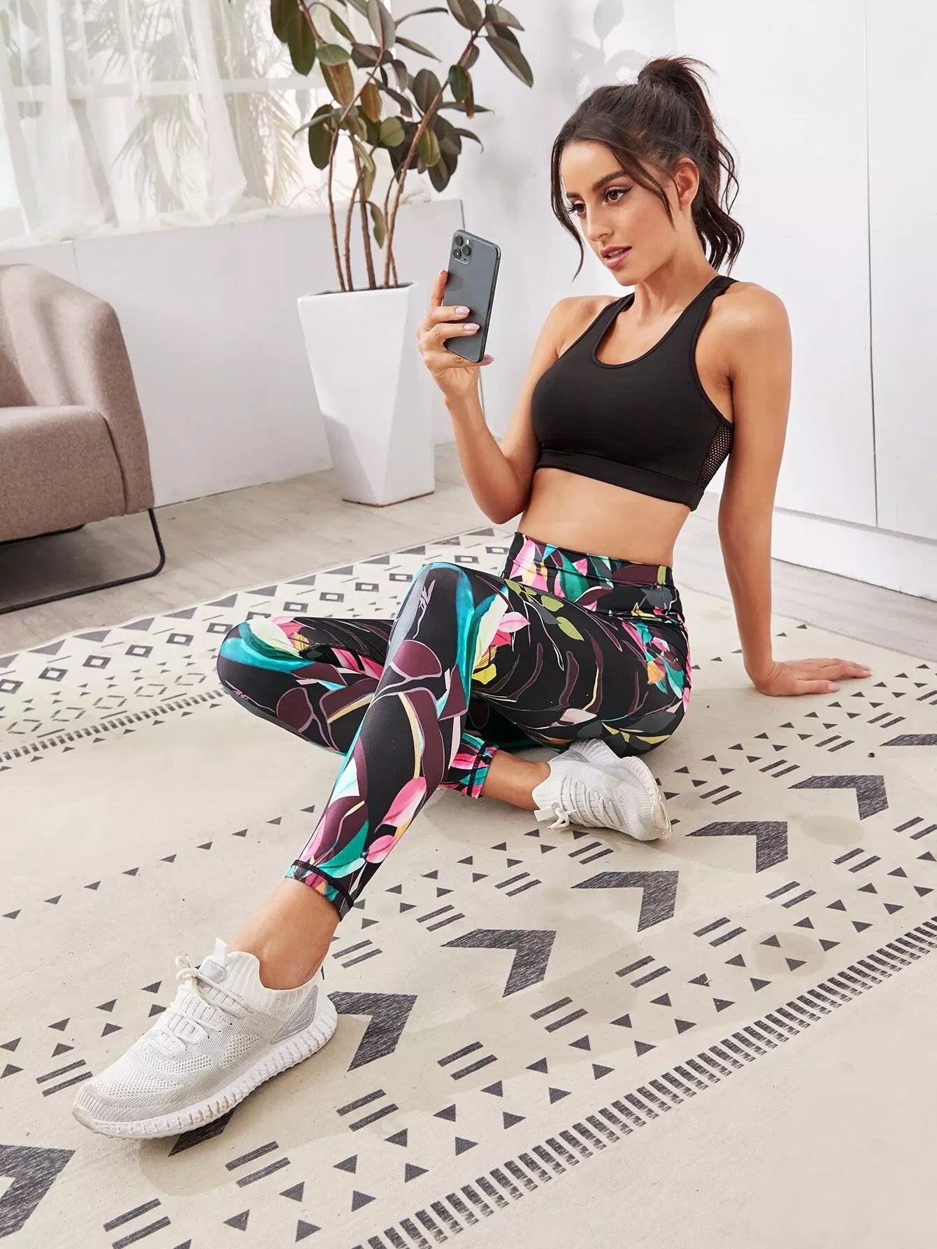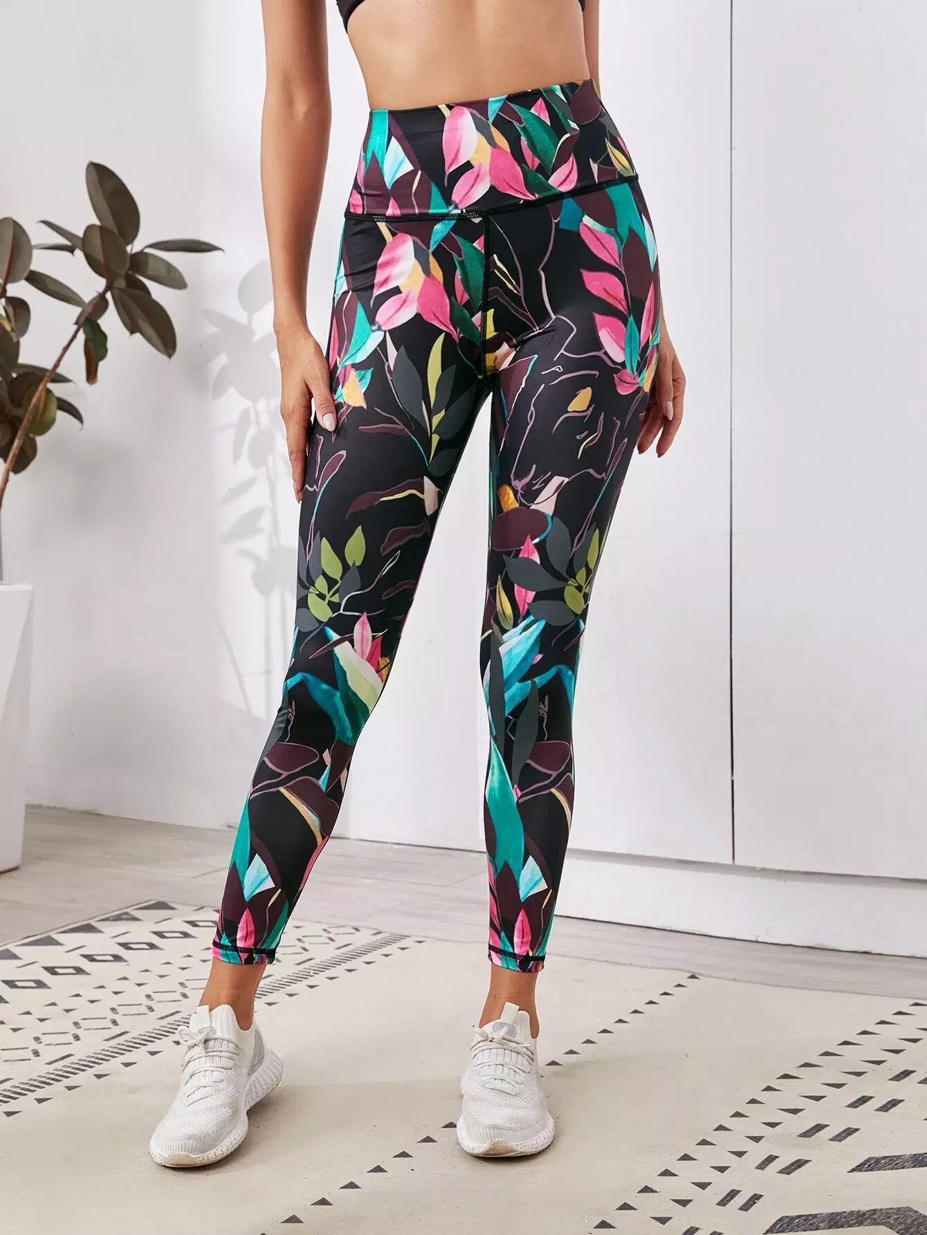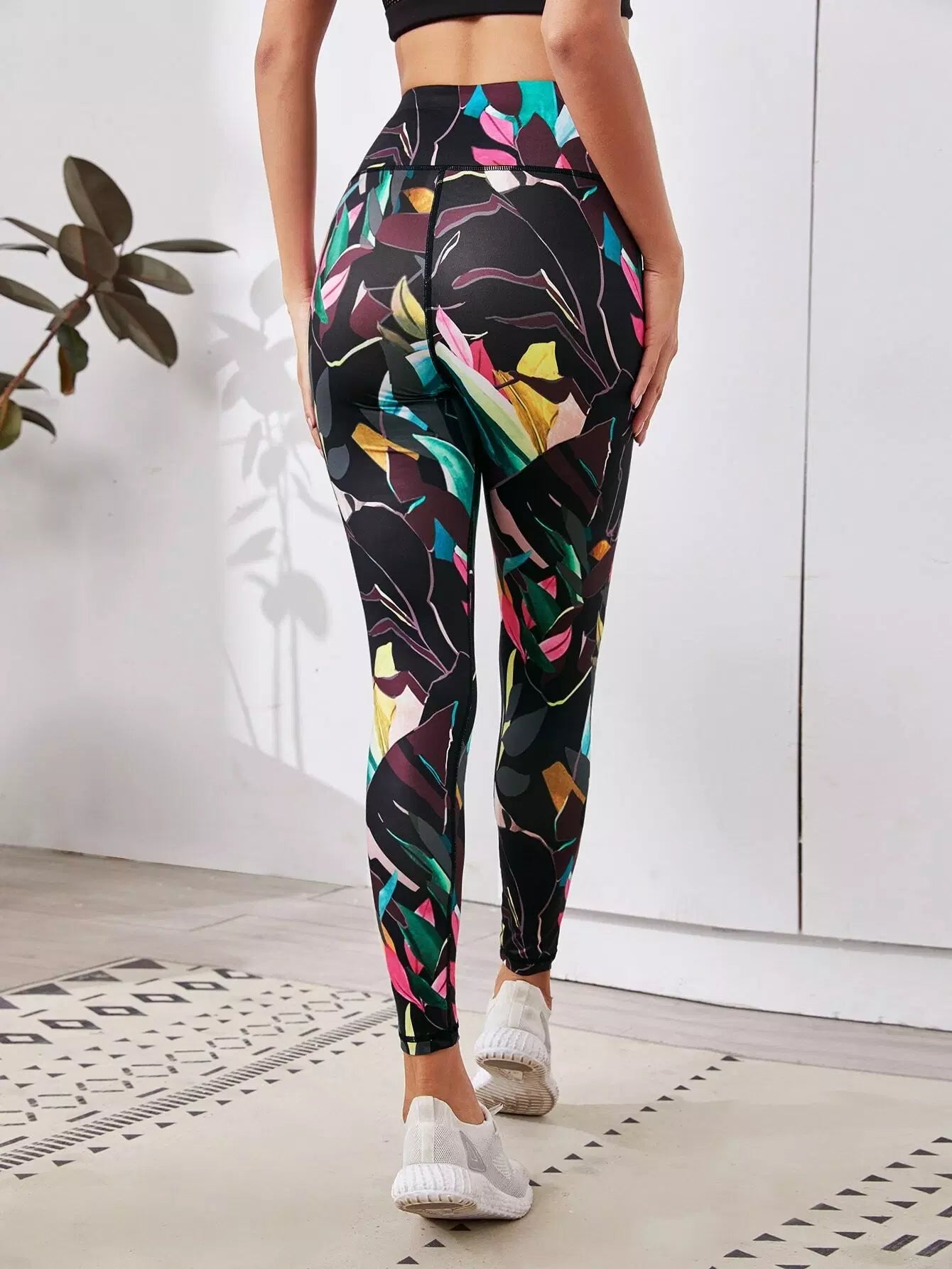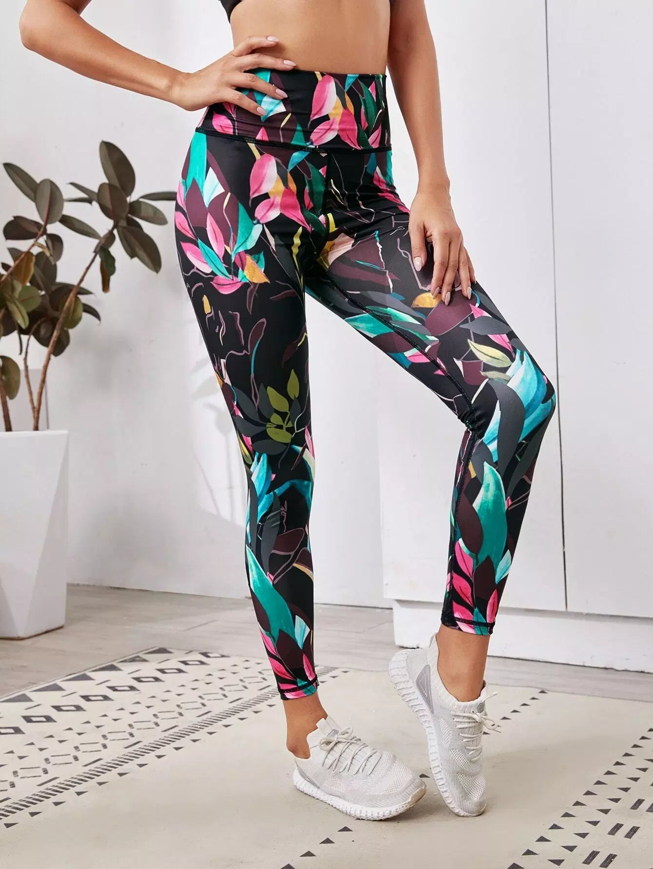بنطلون ضيق رياضي بحزام خصر عريض مطبوع عليه أوراق الشجر بالكامل