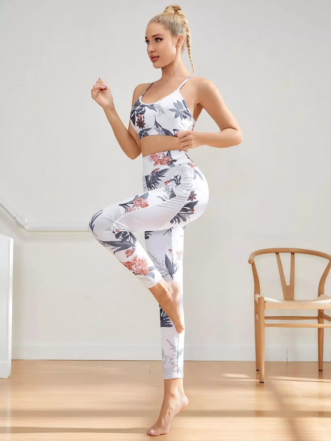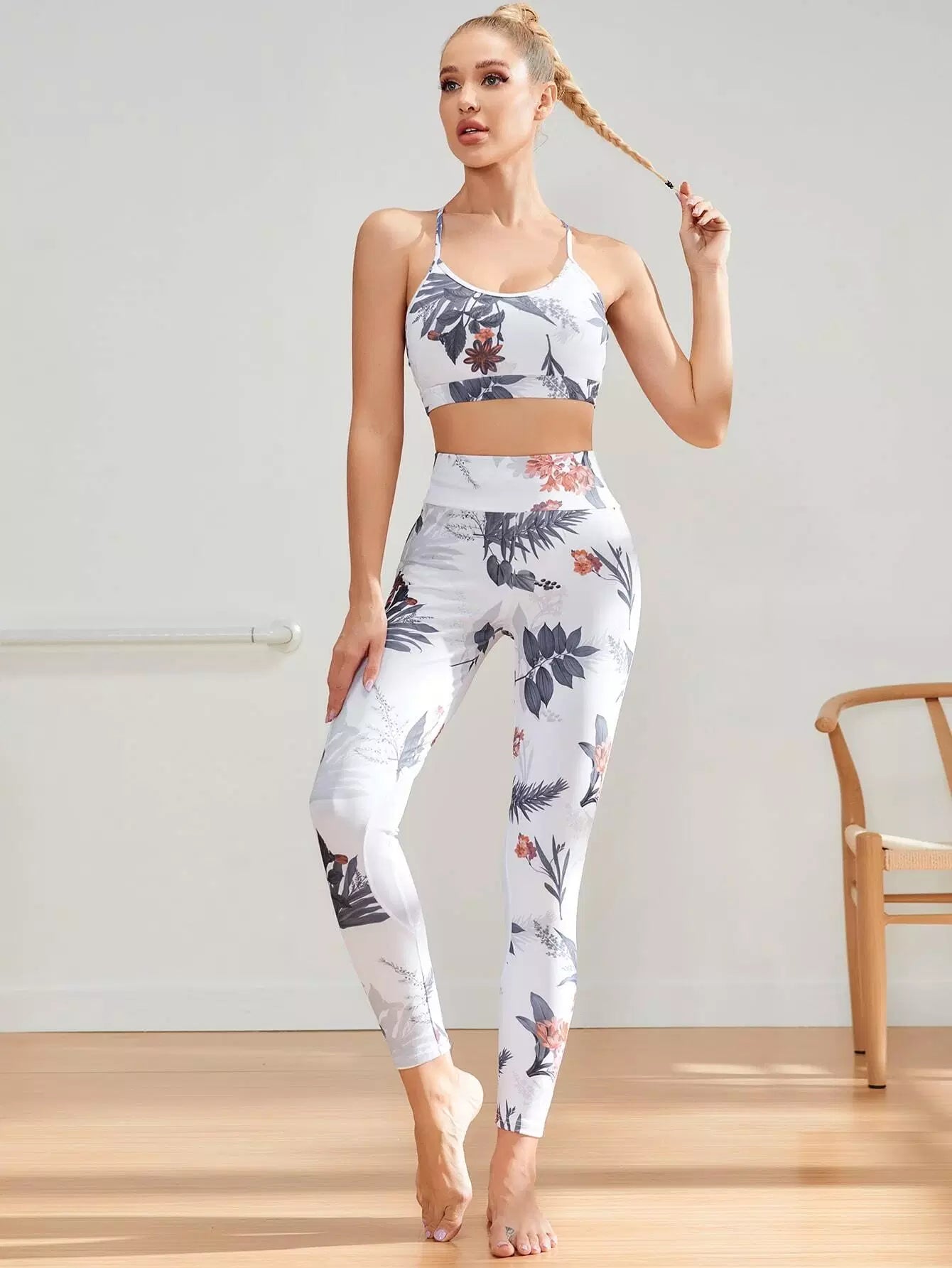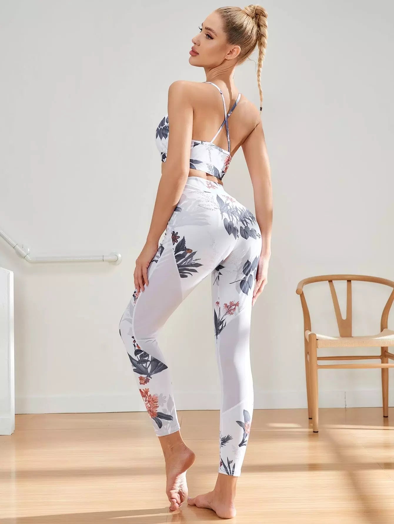 النساء - حمالة صدر رياضية وبنطلون ضيق بظهر متقاطع وطبعات زهور