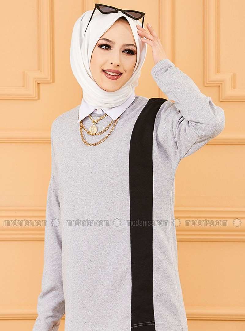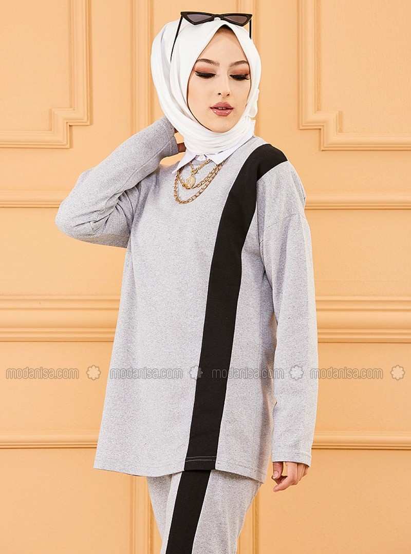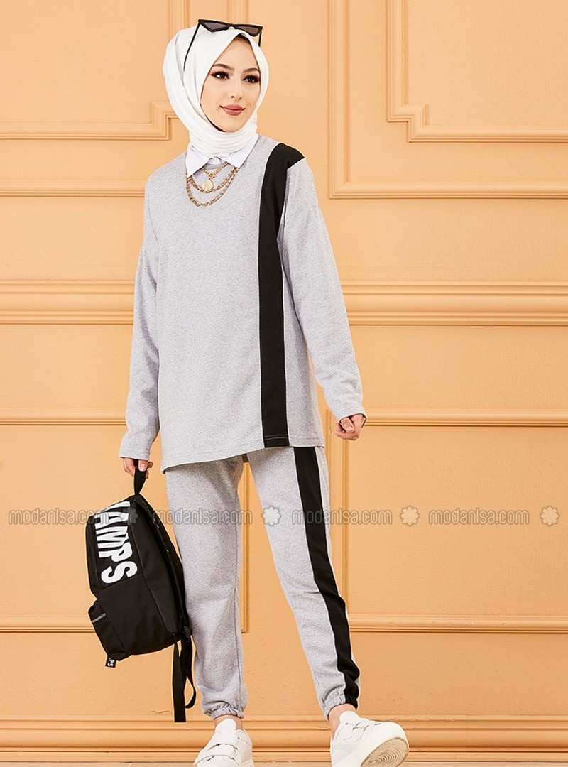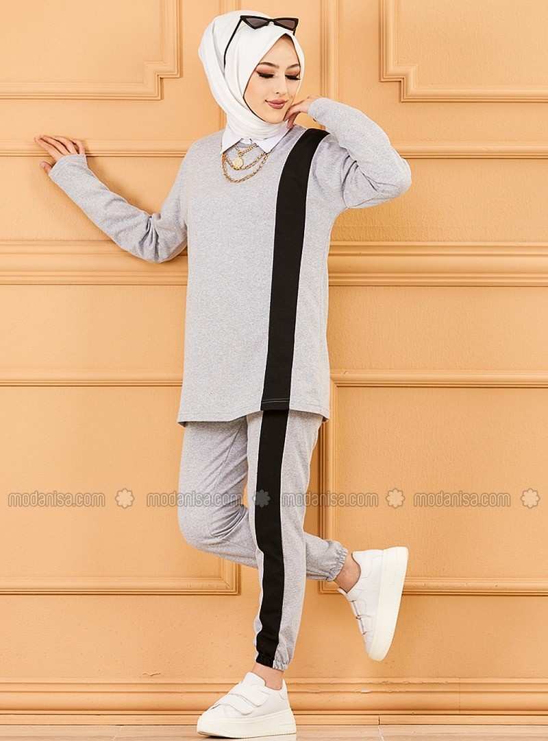 طقم بدلة رياضية برقبة دائرية باللون الرمادي
