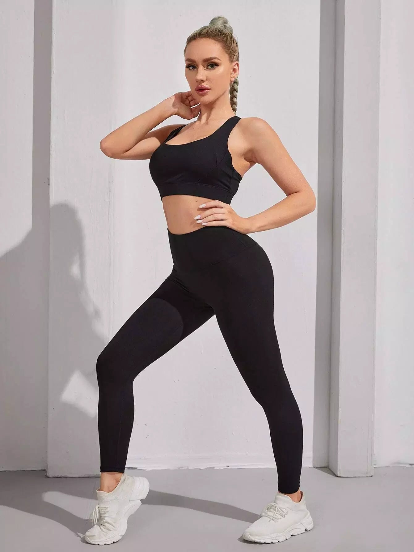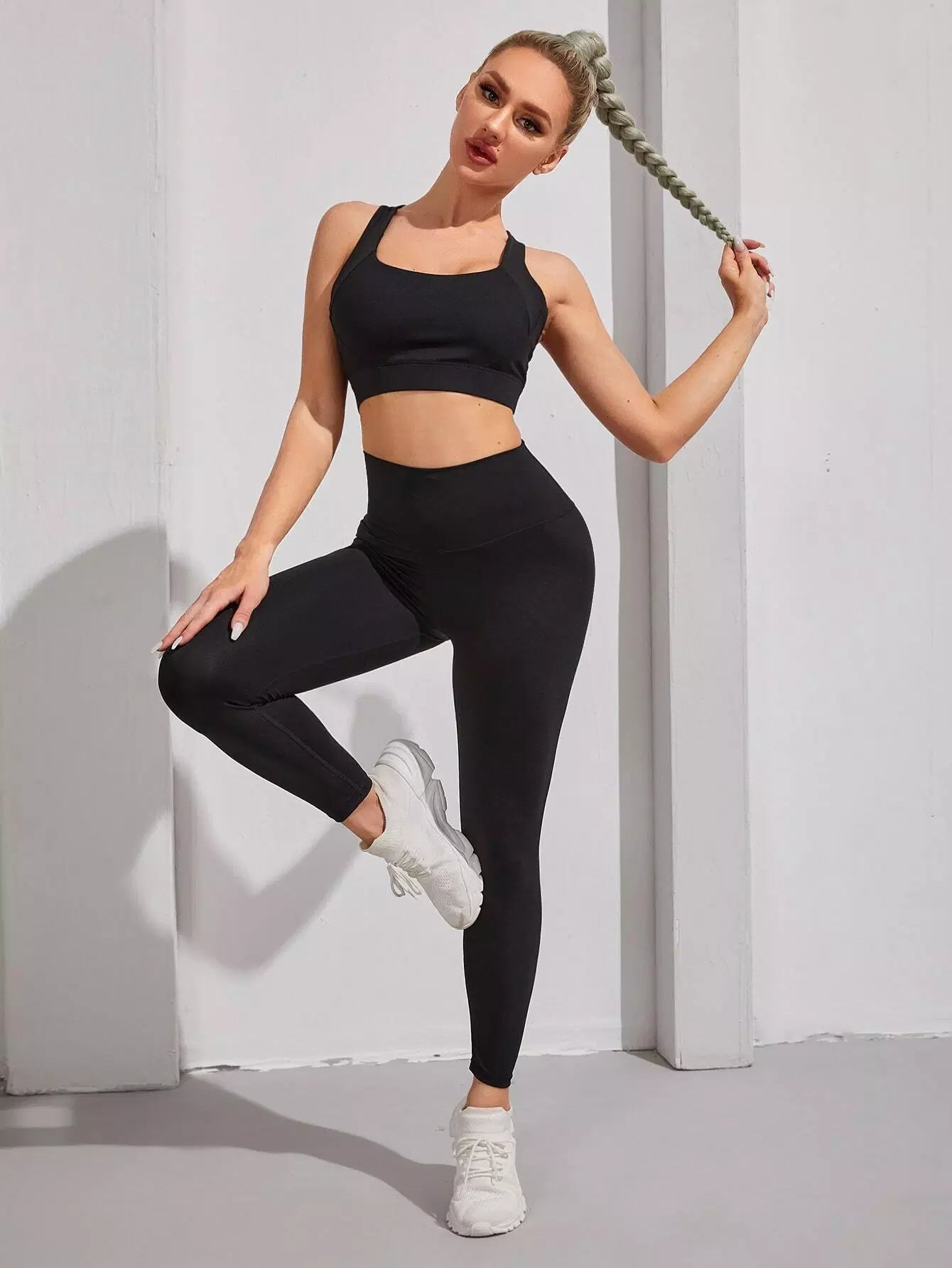 طقم حمالات صدرية رياضية عالية التمدد متقاطعة مع بنطال ضيق