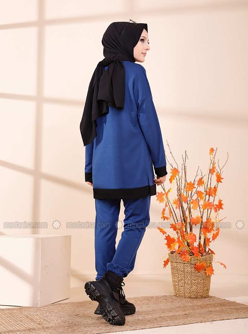 طقم بدلة رياضية برقبة دائرية باللون النيلي