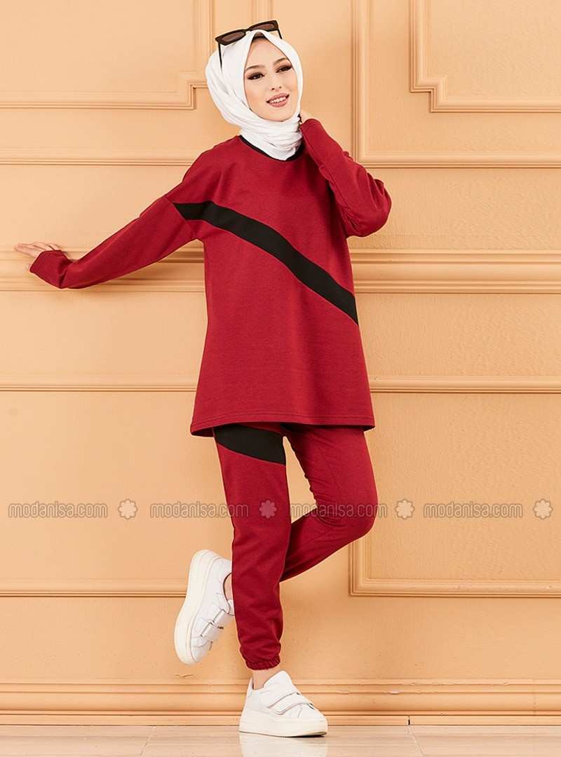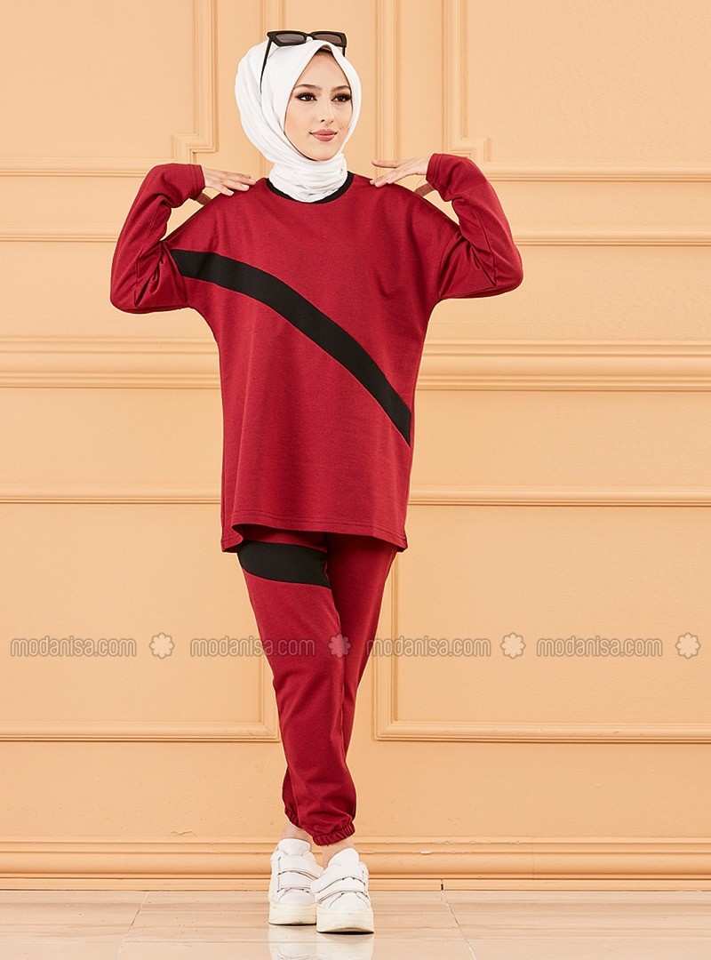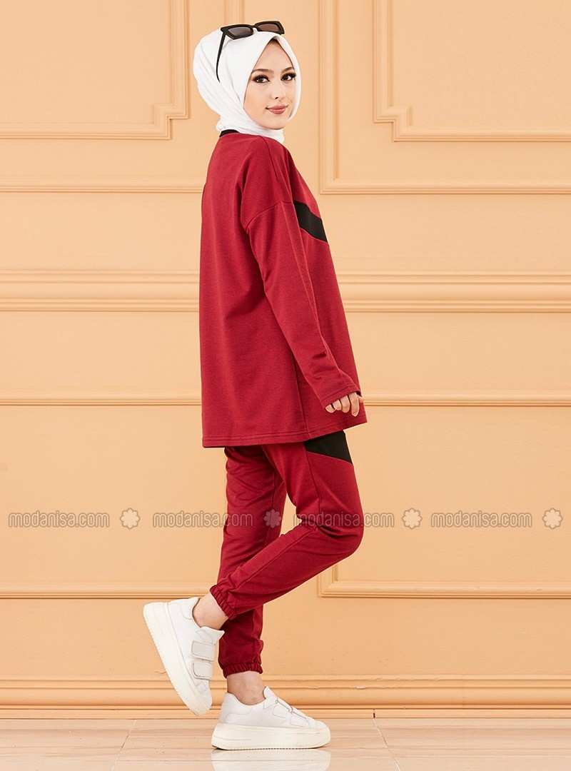 طقم بدلة رياضية برقبة دائرية متعددة كستنائي