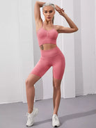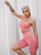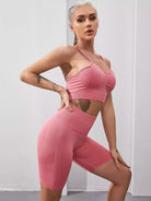 حمالة صدر رياضية مكشكشة من الأمام بدون خياطة وشورت رياضي قصير