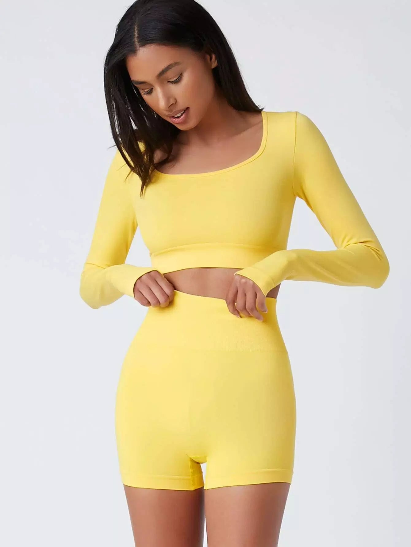 للنساء - تيشيرت وشورت رياضي بدون خياطة برقبة واسعة وفتحات للإبهام
