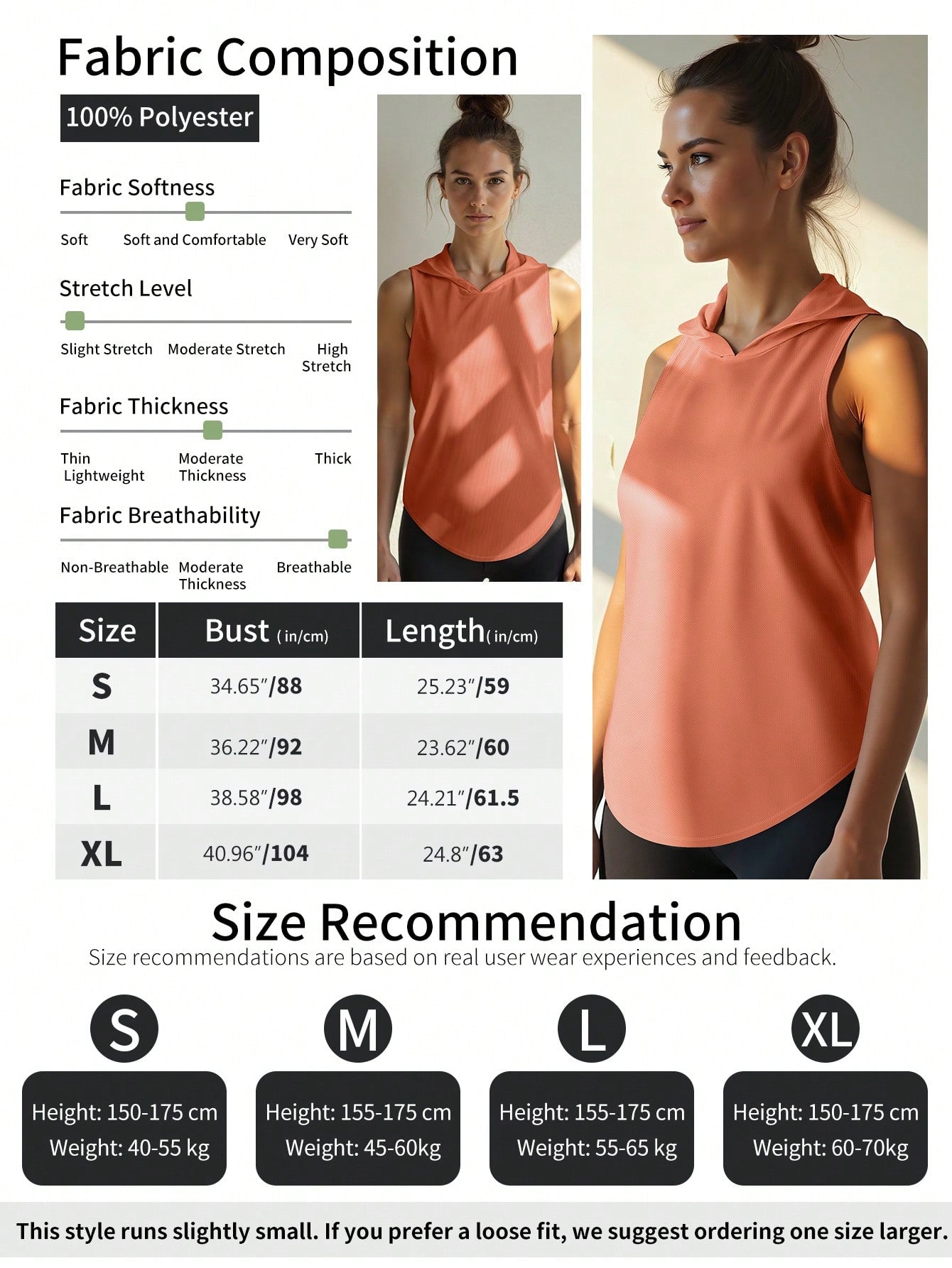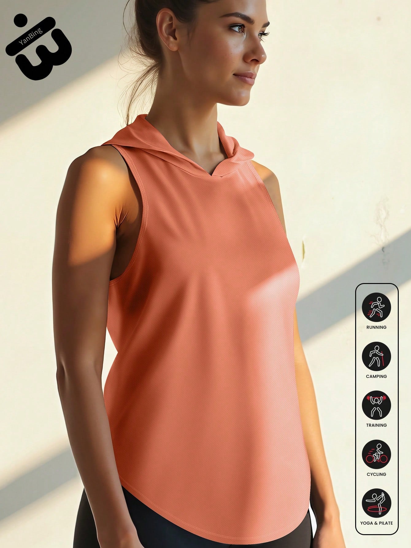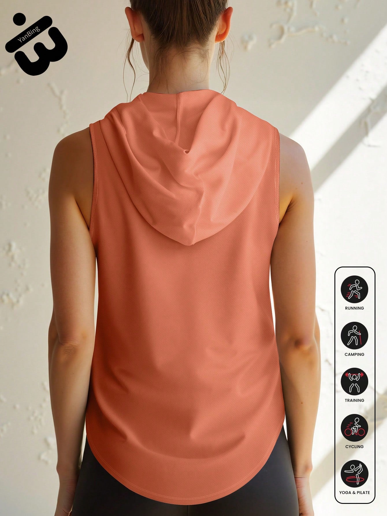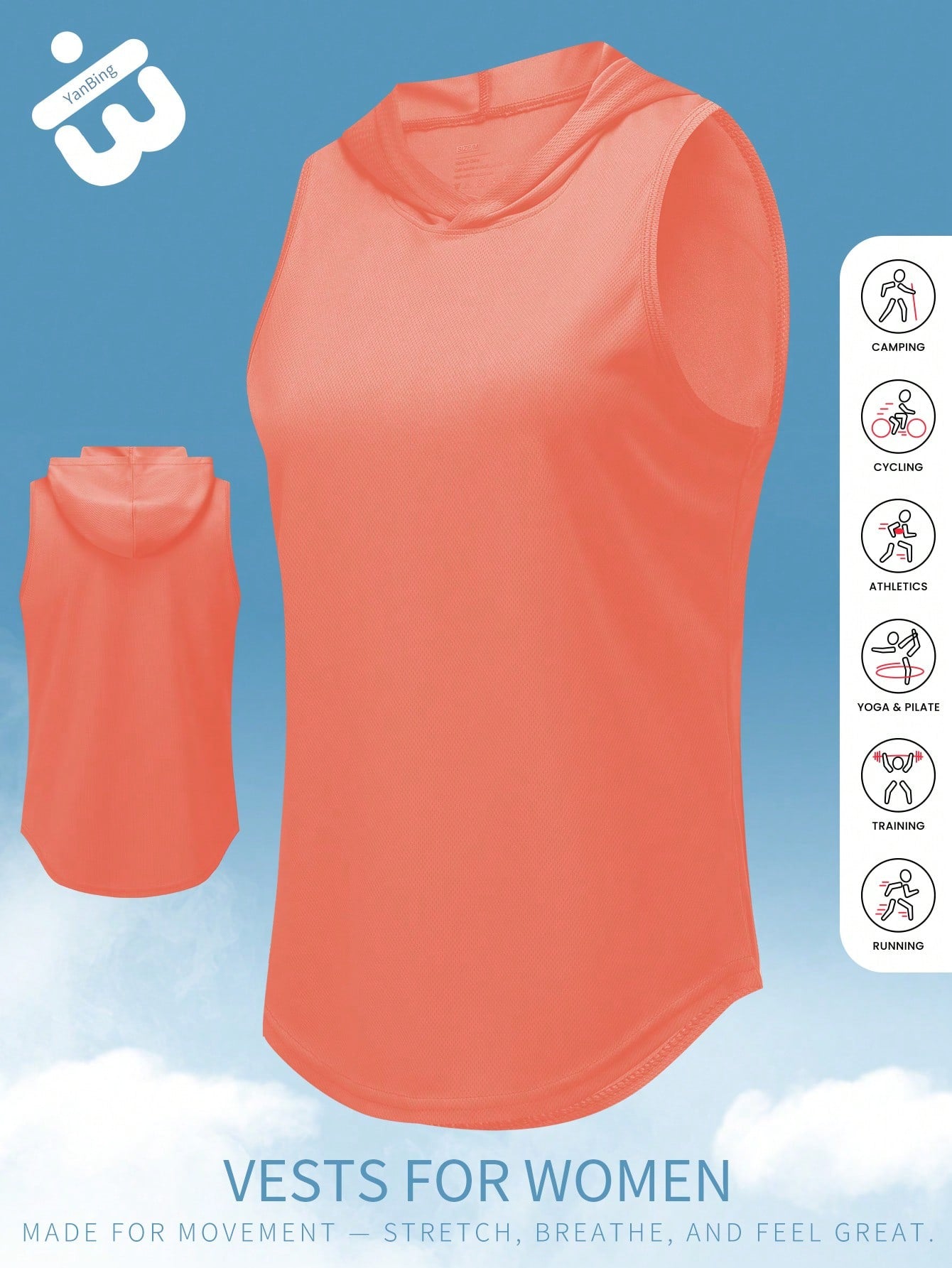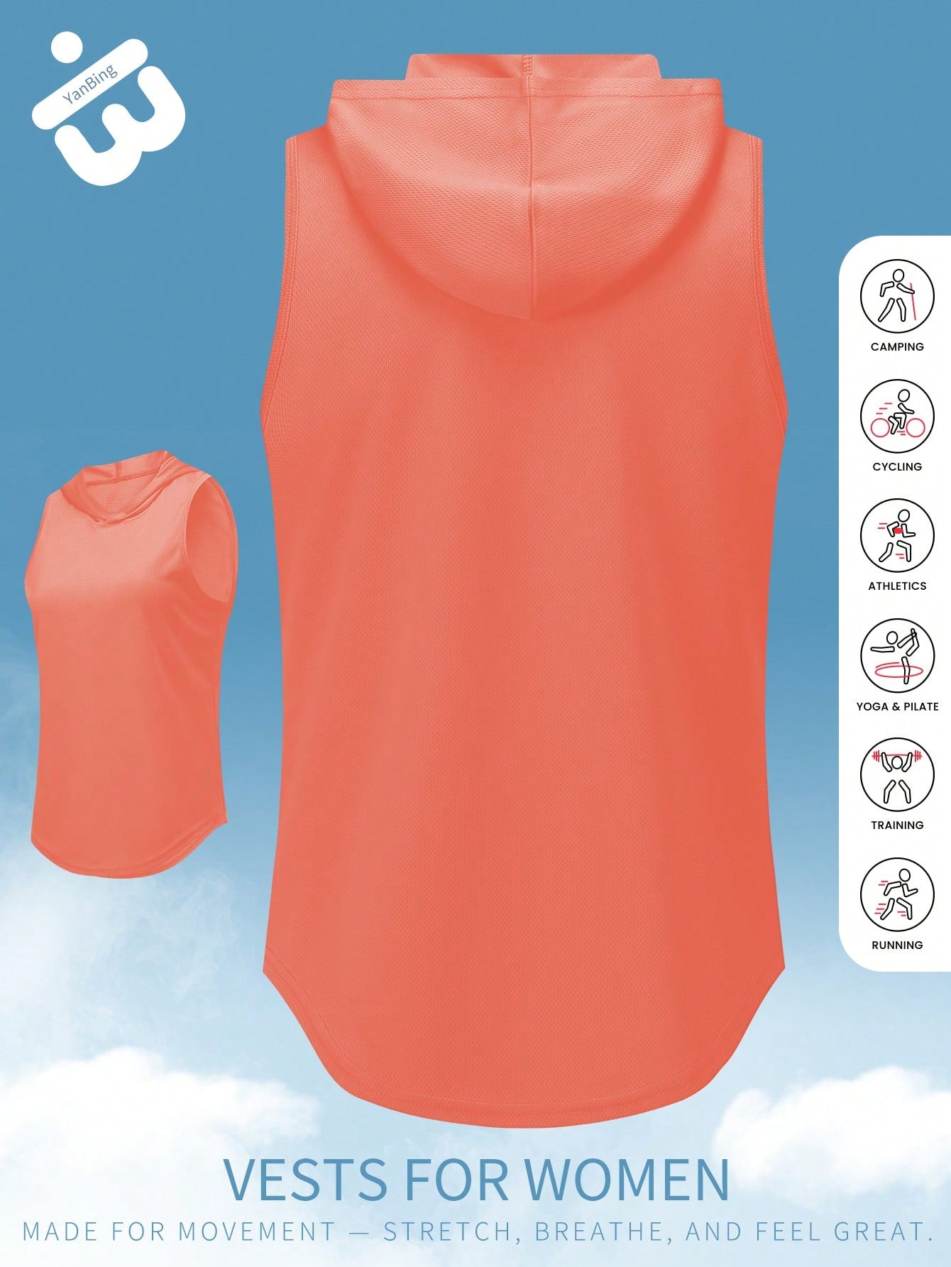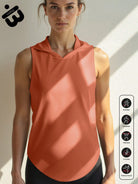 قطعة واحدة من قميص نسائي رياضي بدون أكمام بغطاء للرأس، تصميم بدون أكمام مصنوع من نسيج شبكي خفيف الوزن وجيد التهوية مع