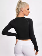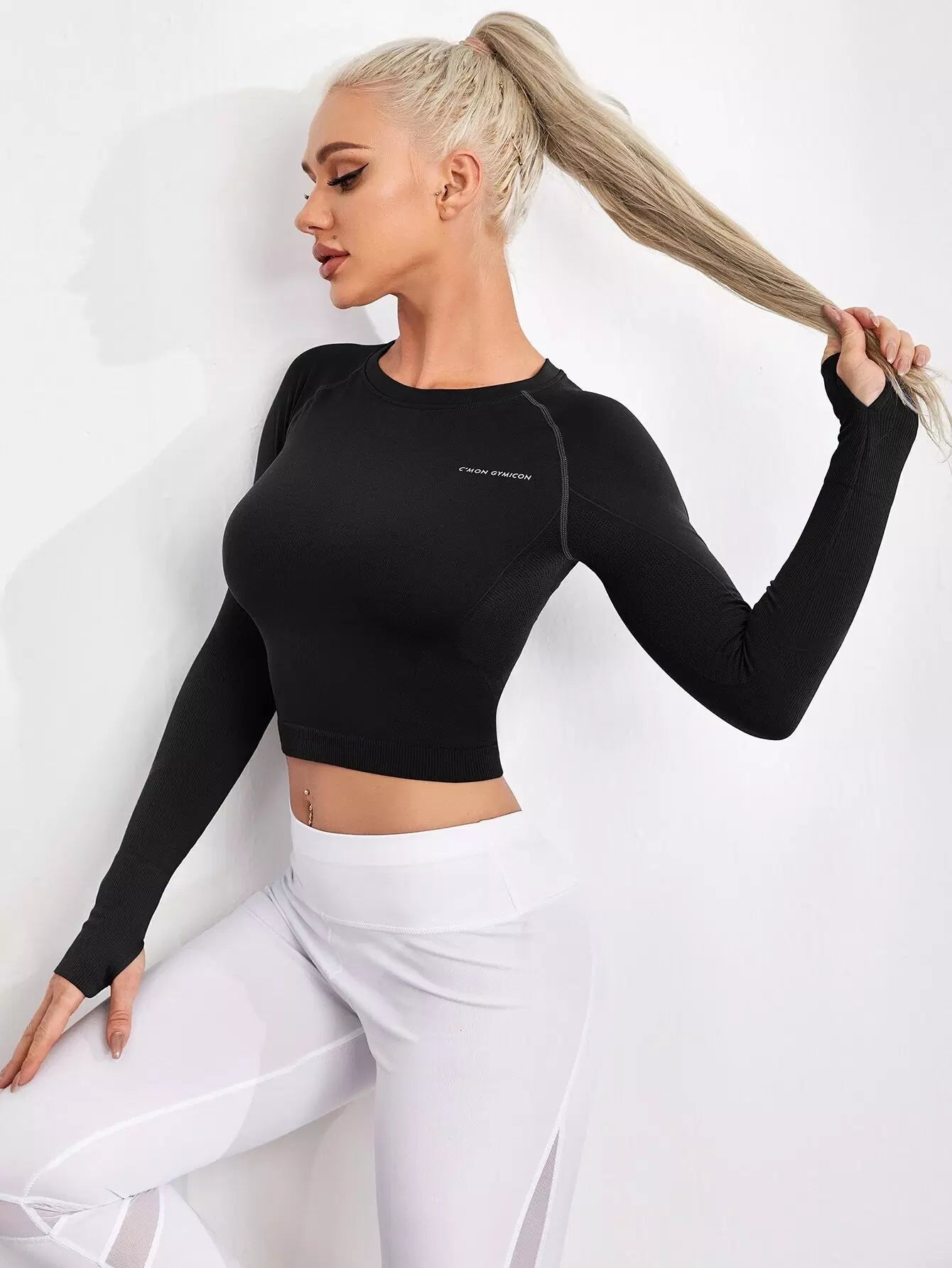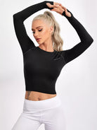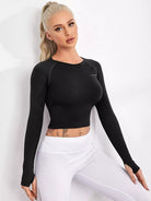 تي شيرت رياضي قصير بدون خياطة مزين بشعارات رياضية مع ثقوب في الإبهام