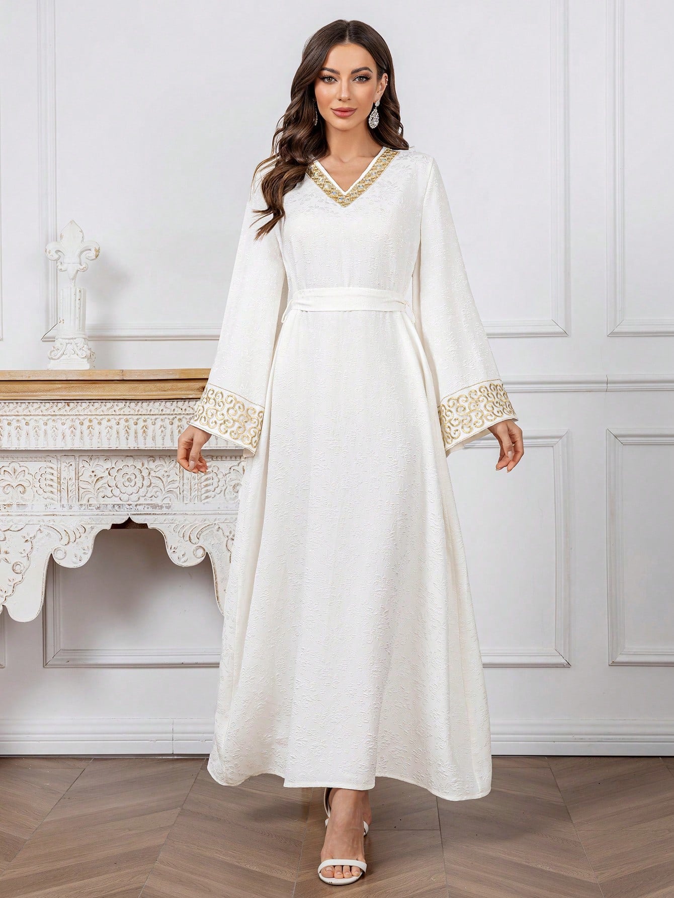 فستان ماكسي تركي أنيق من النجمة، بأكمام منتفخة وخصر، مطرز بقماش الجاكار، للنساء، محتشم