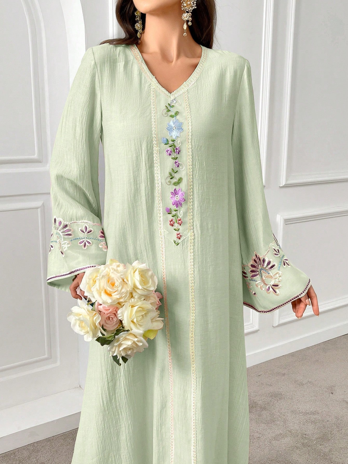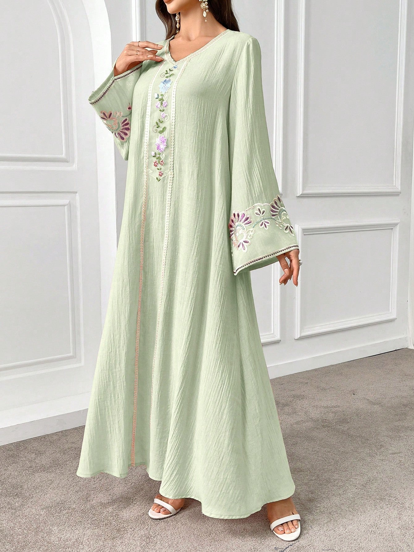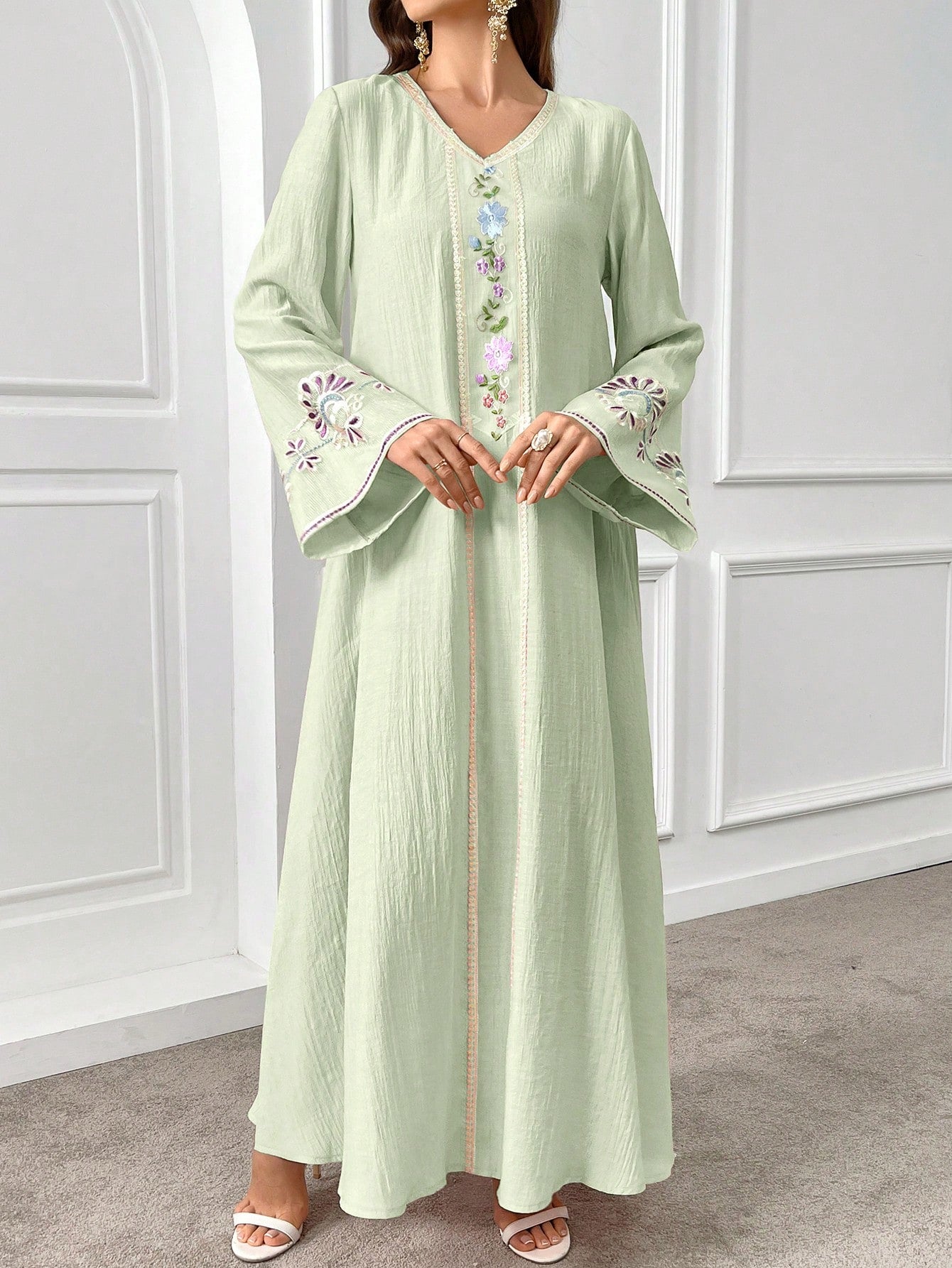 Al Najma Women's Elegant Floral Embroidery Flare Sleeve Arabic Style Long Dress,Modest