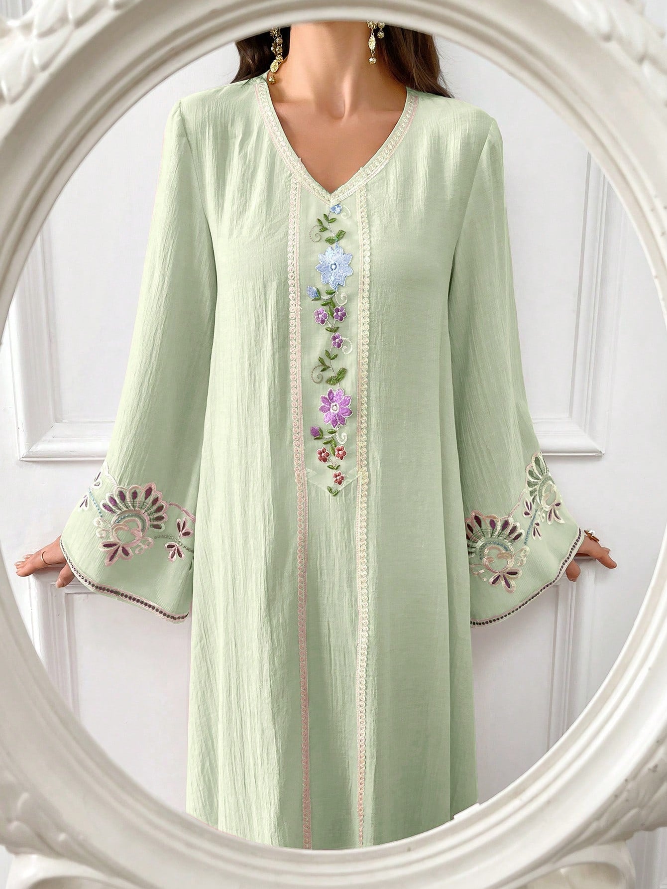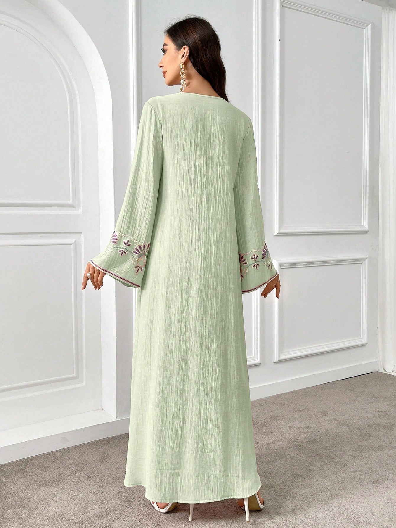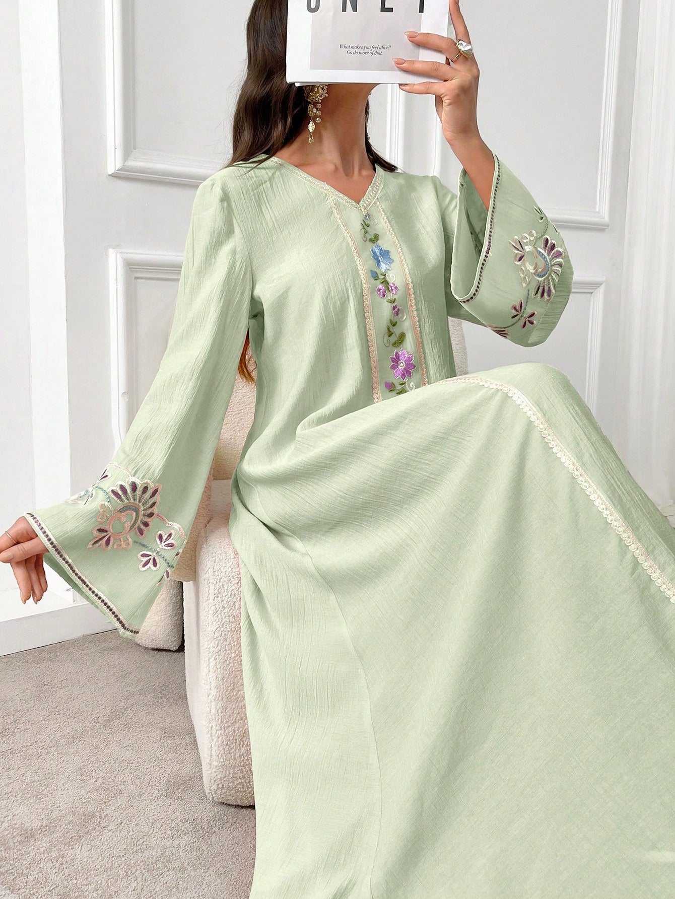 Al Najma Women's Elegant Floral Embroidery Flare Sleeve Arabic Style Long Dress,Modest