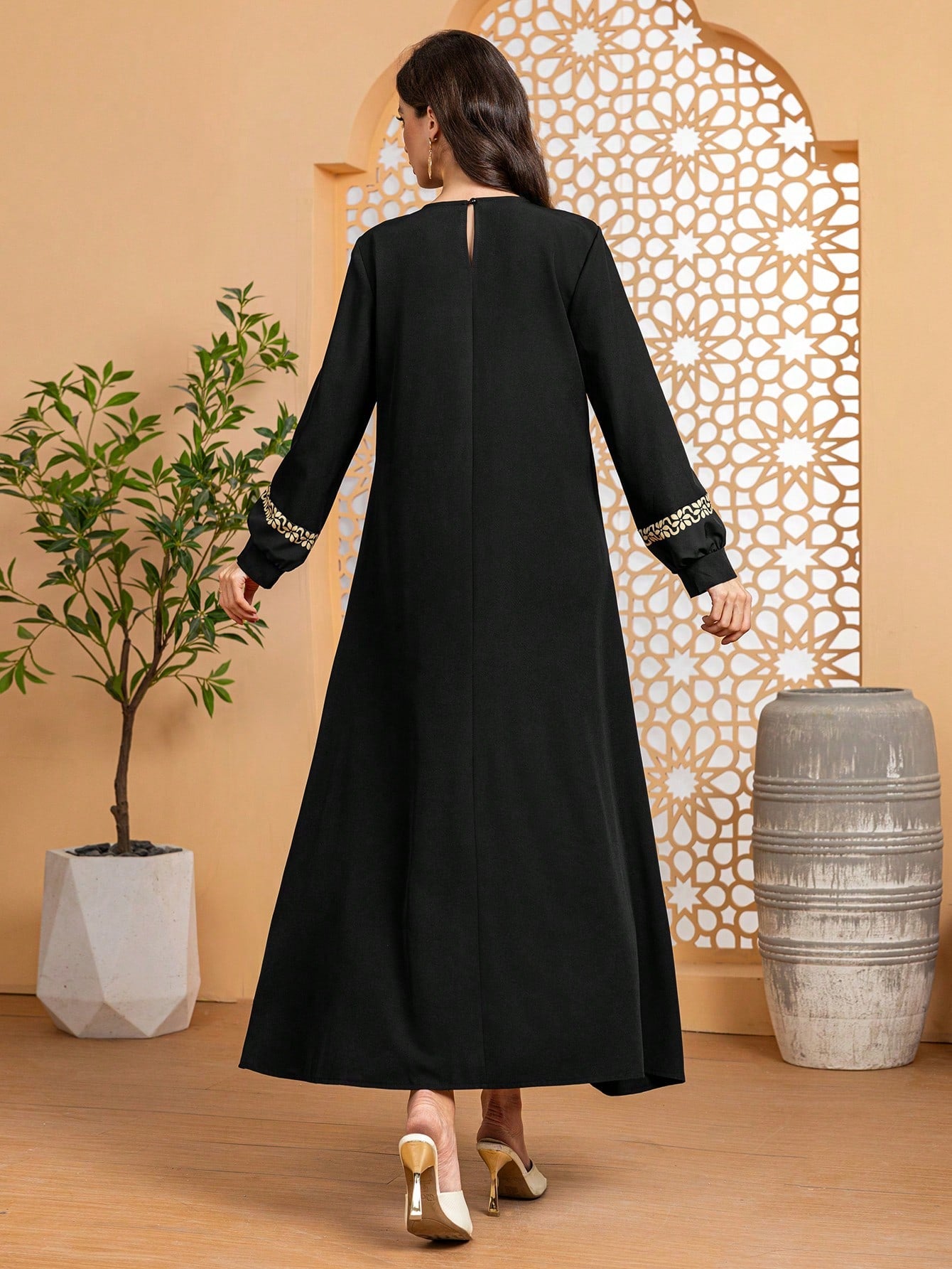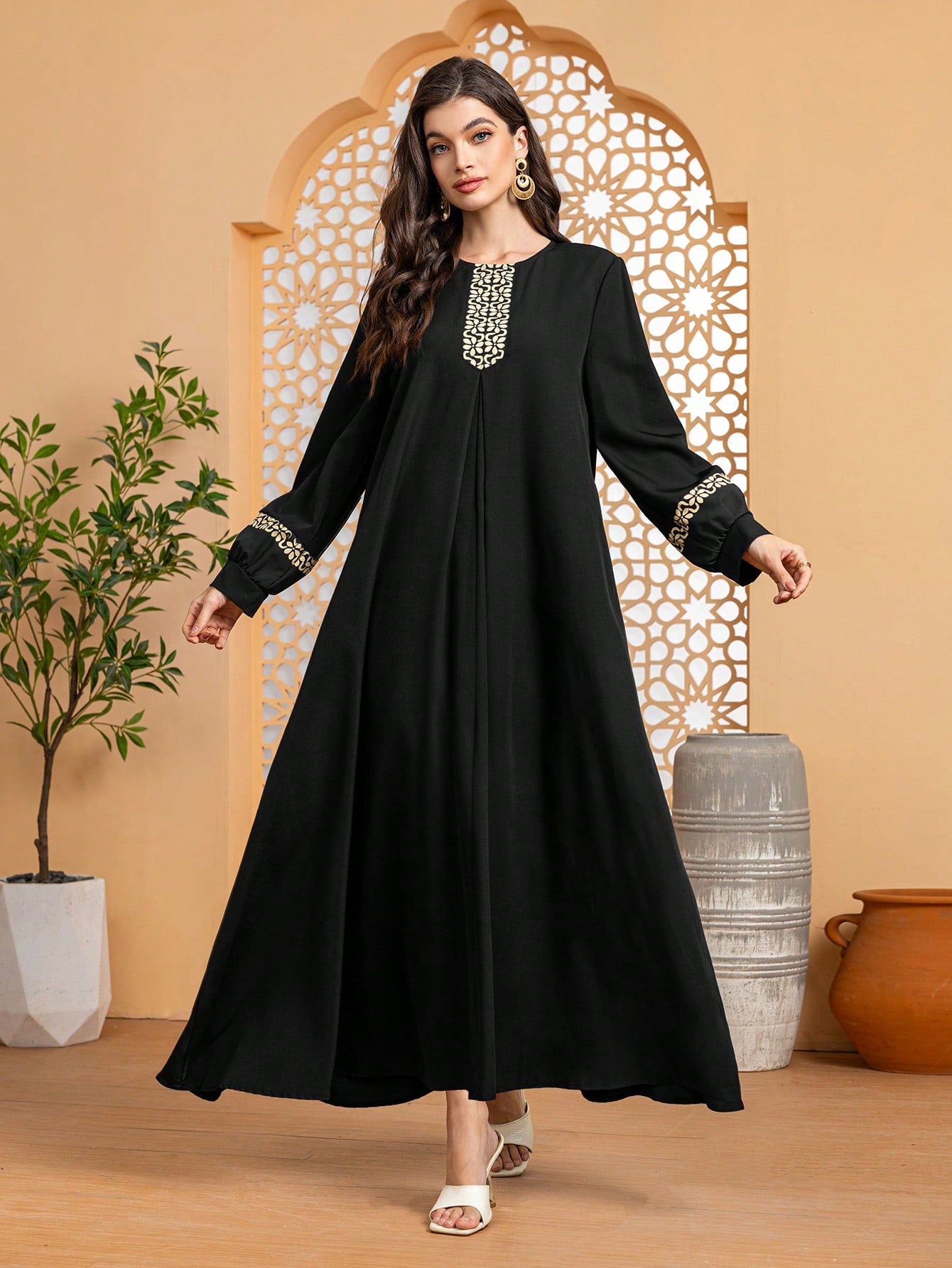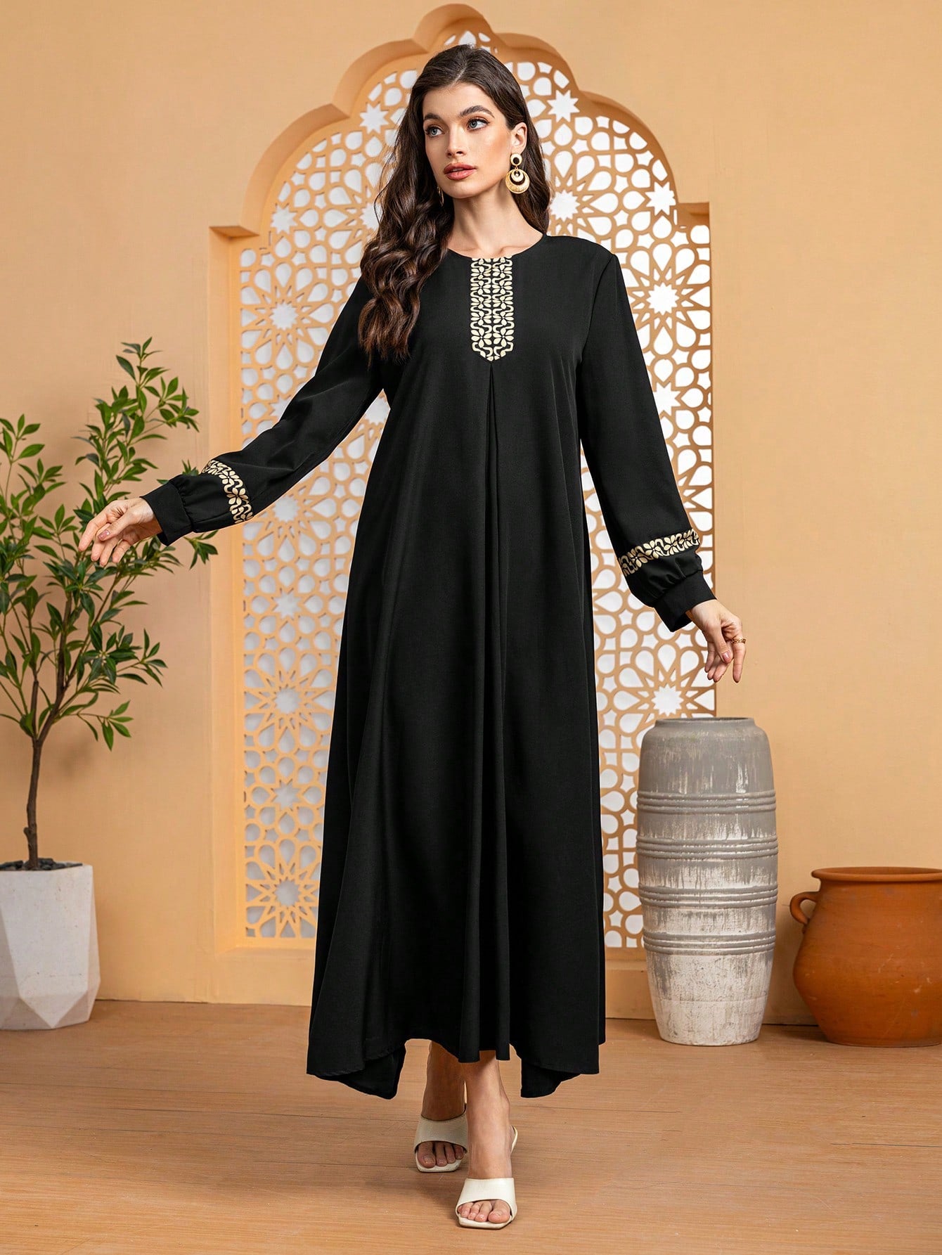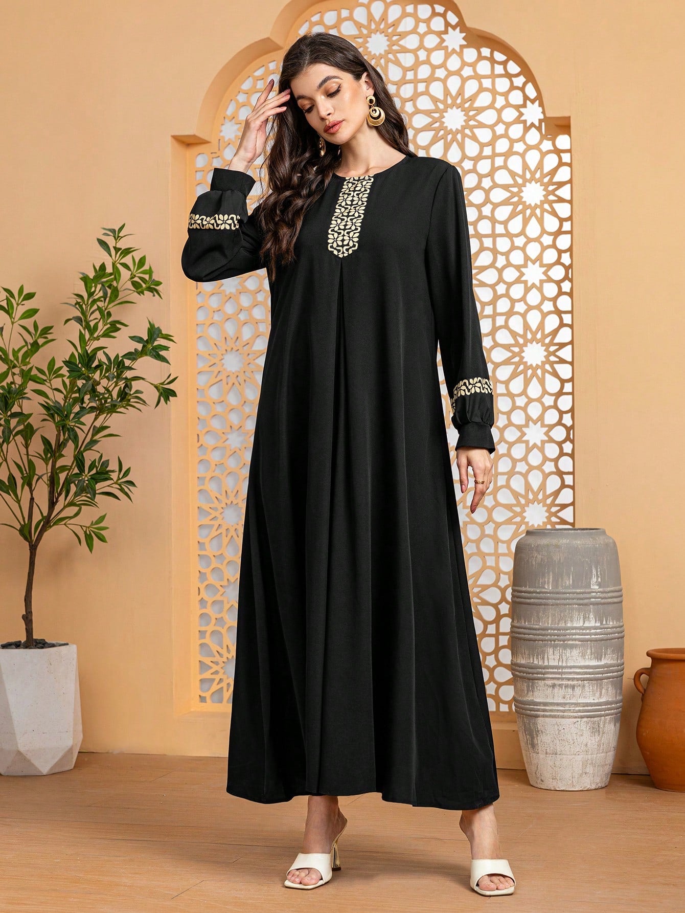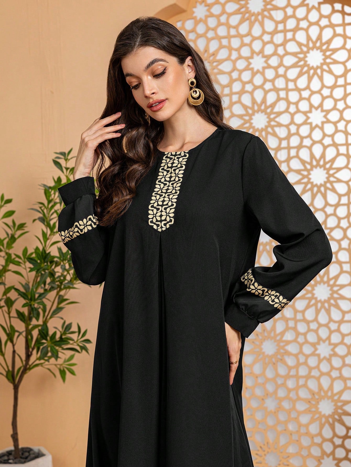women Al Najma Women's Floral Print Crew Neck Long Sleeve Arabic Style Dress