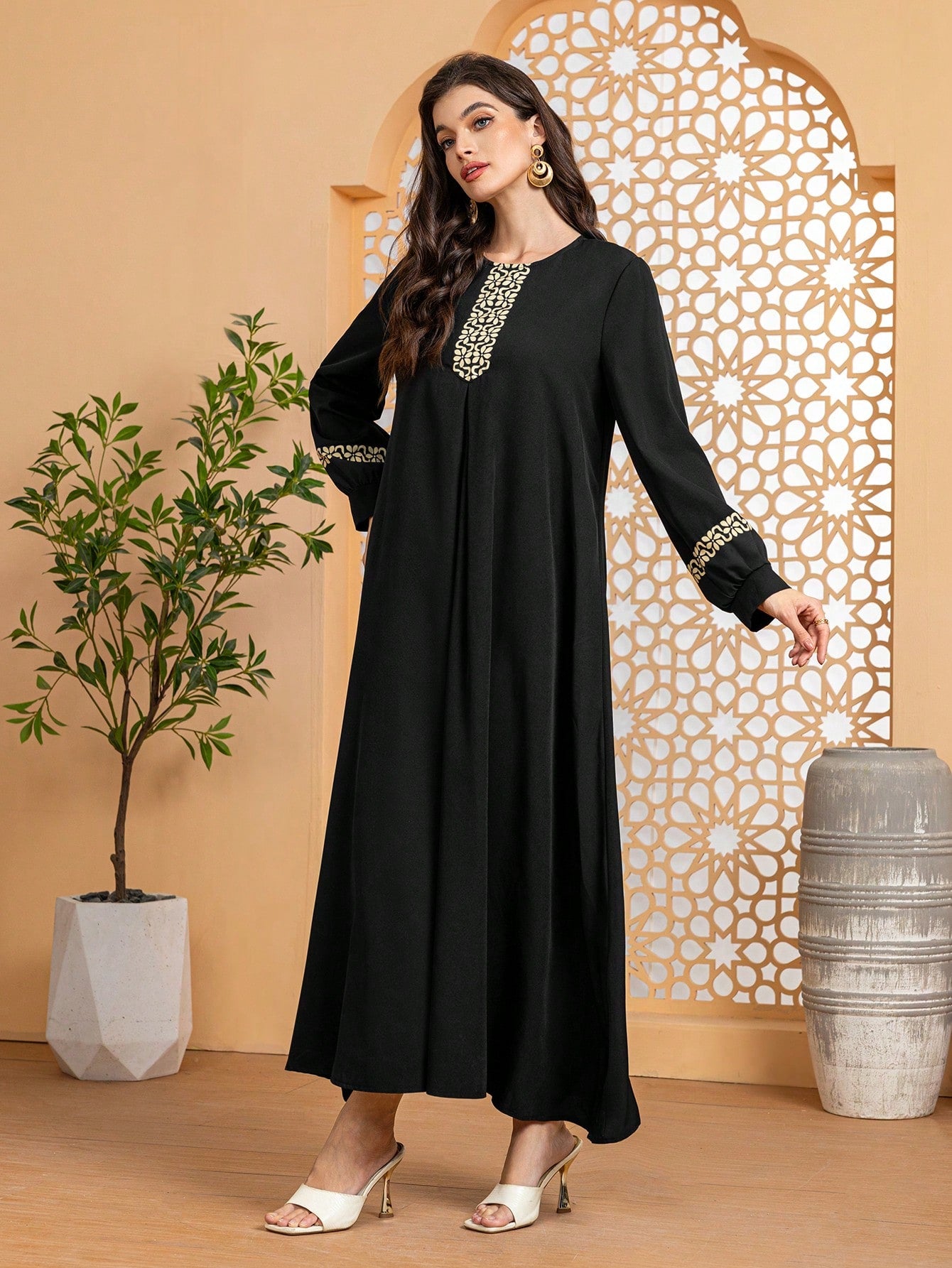 فستان النجمة النسائي ذو التصميم العربي بطبعة الأزهار وياقة دائرية وأكمام طويلة