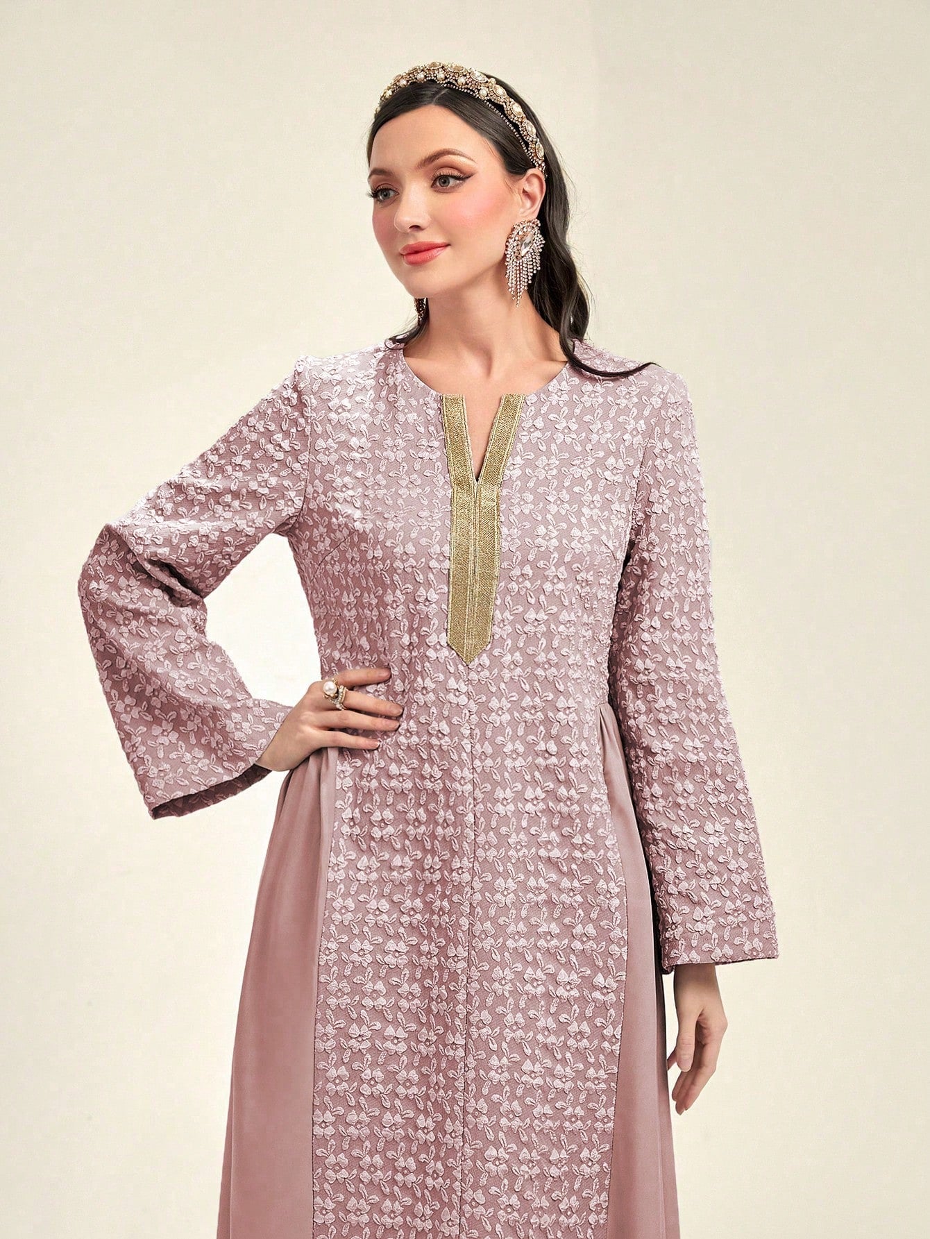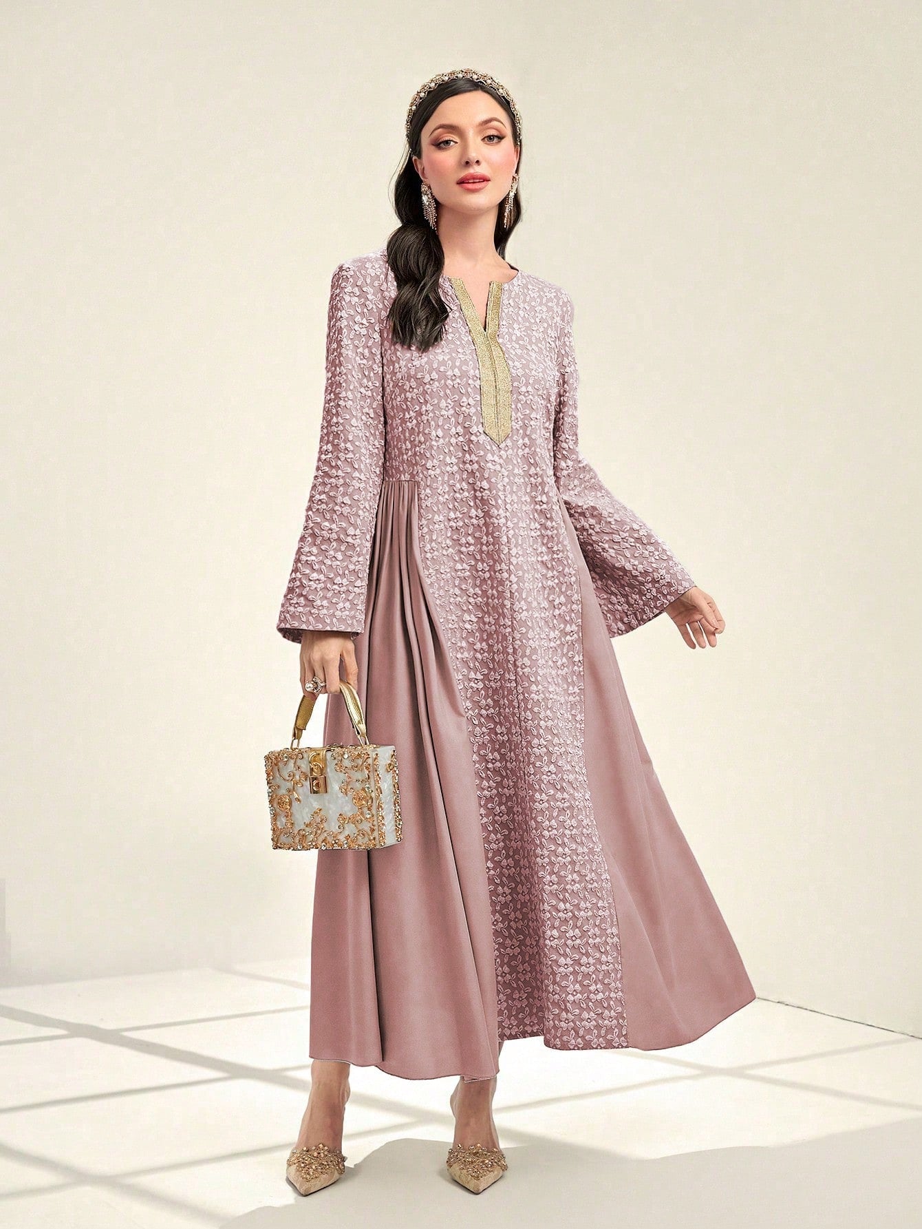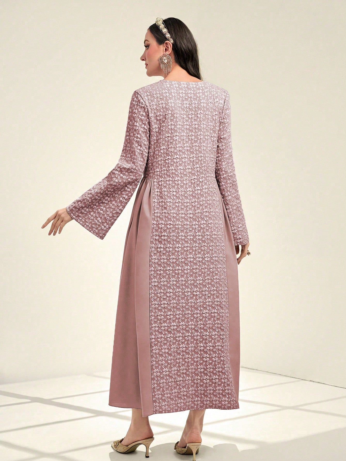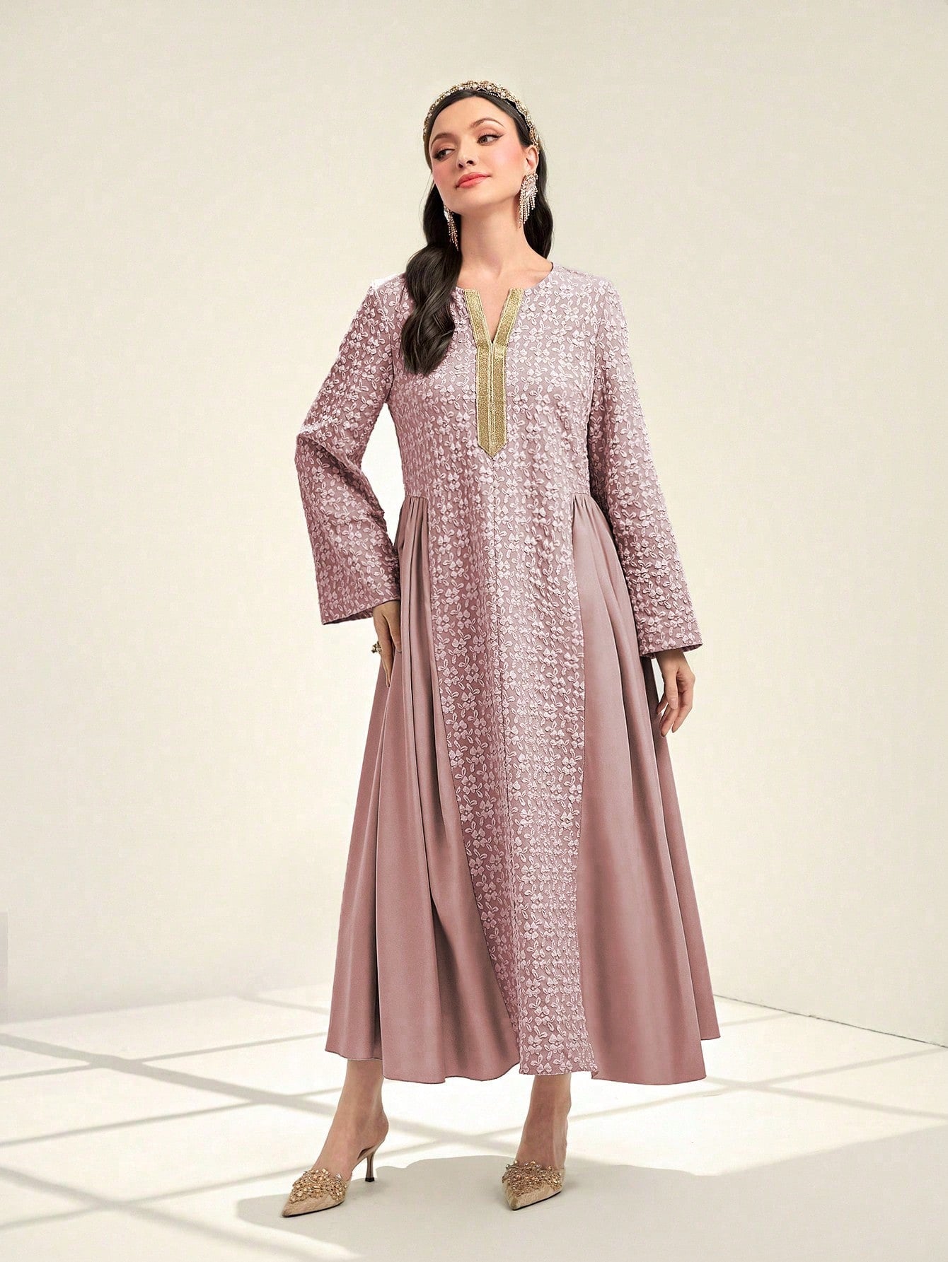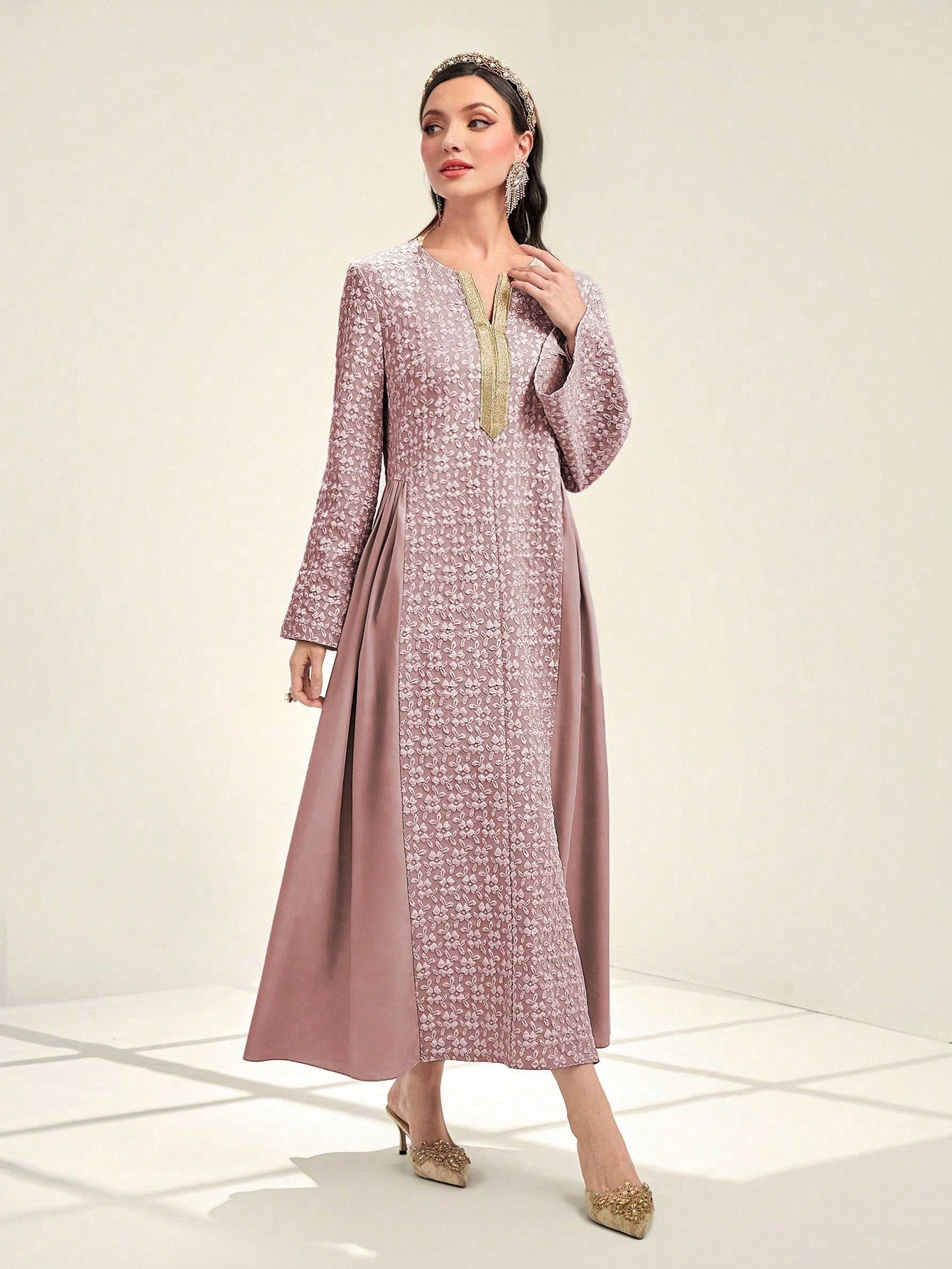 Al Najma Women's Notched-Neckline Jacquard And Tape Splice Dress, Modest