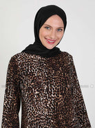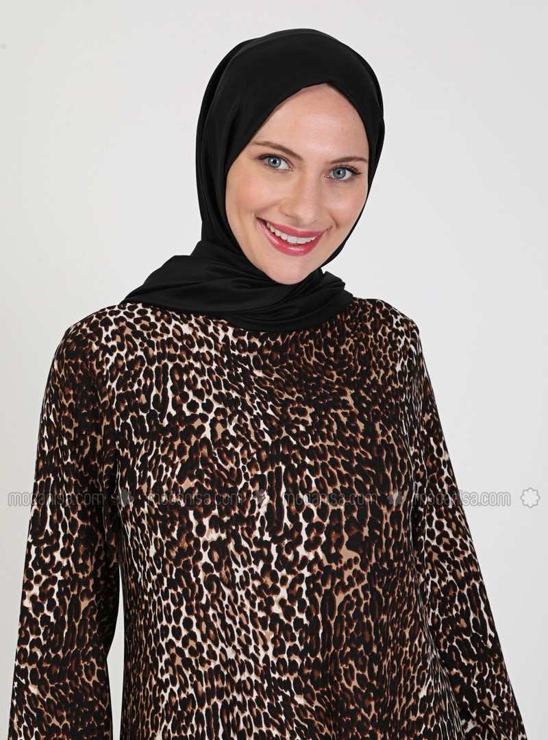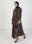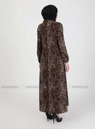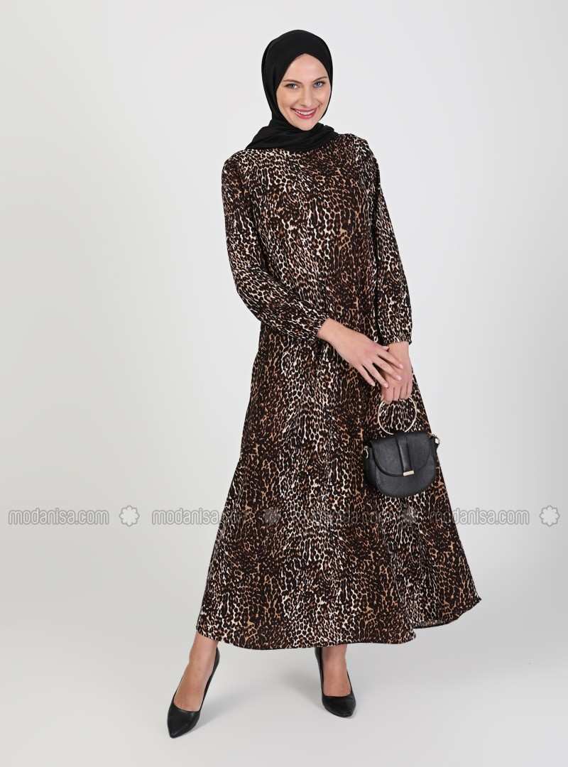 فستان محتشم بني اللون برقبة دائرية وغير مُبطن