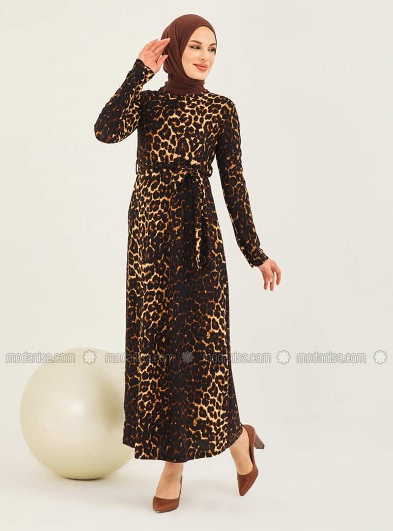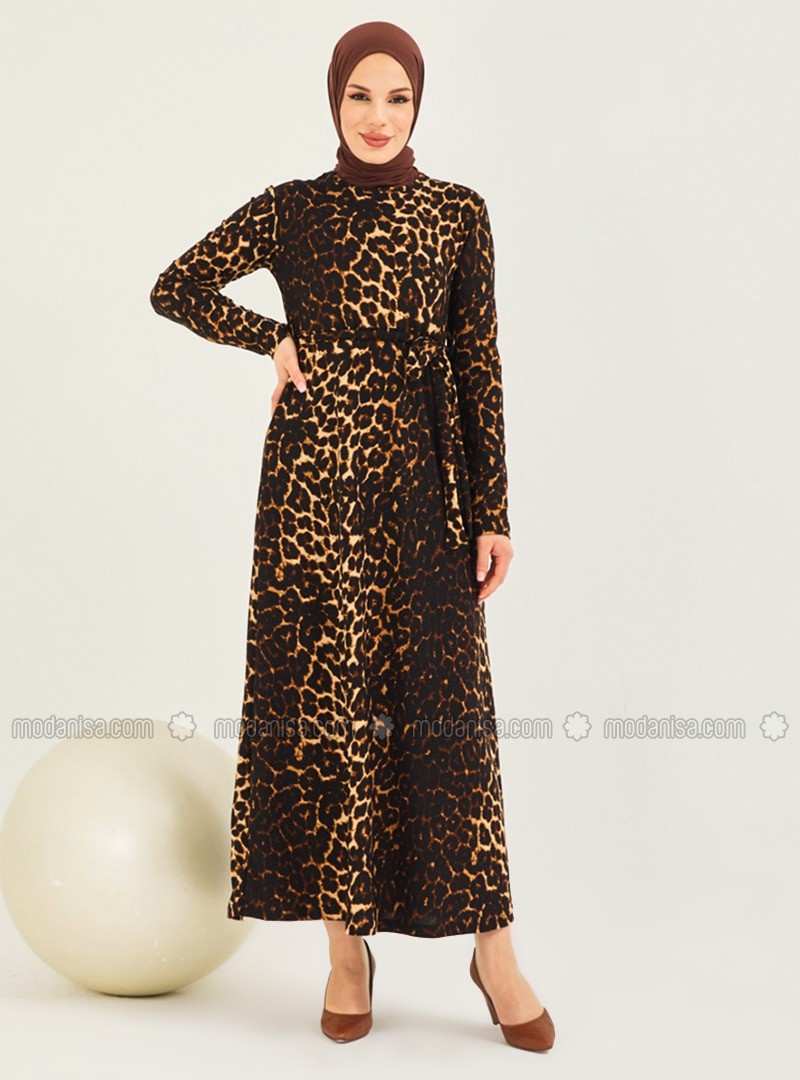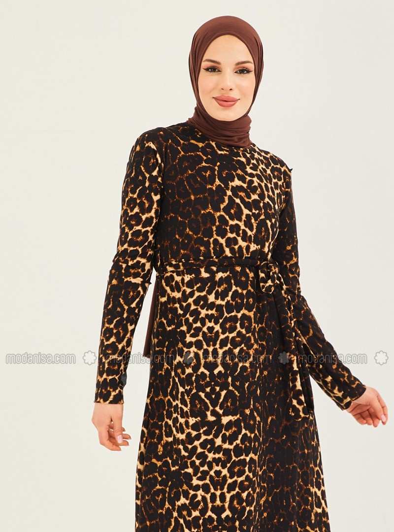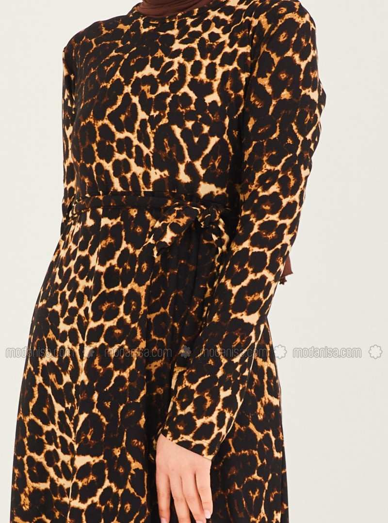 فستان محتشم غير مُبطن بياقة دائرية ونقشة جلد الفهد
