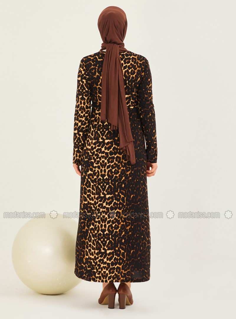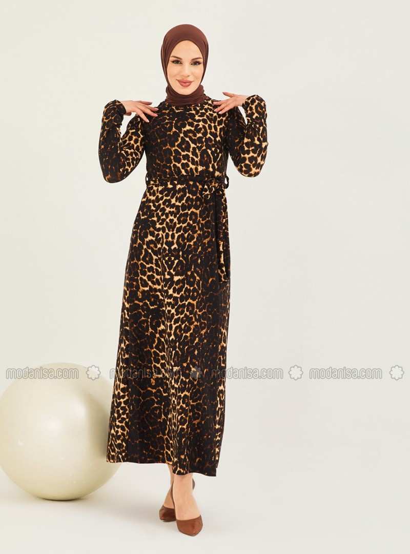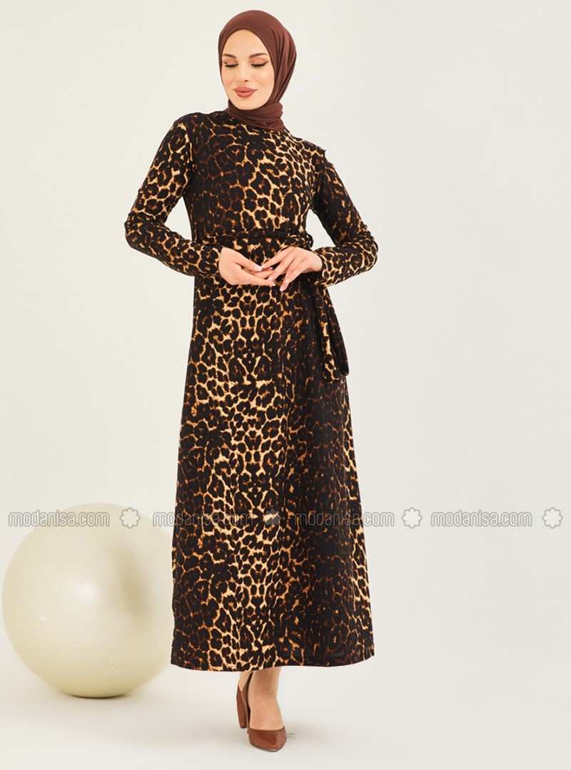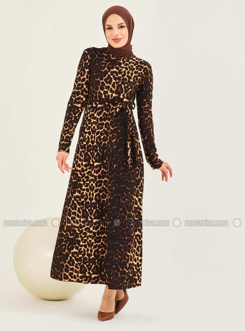 فستان محتشم غير مُبطن بياقة دائرية ونقشة جلد الفهد