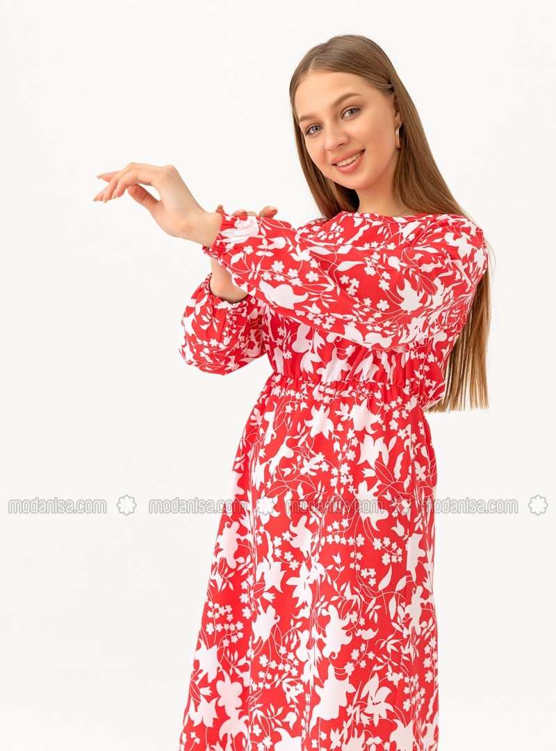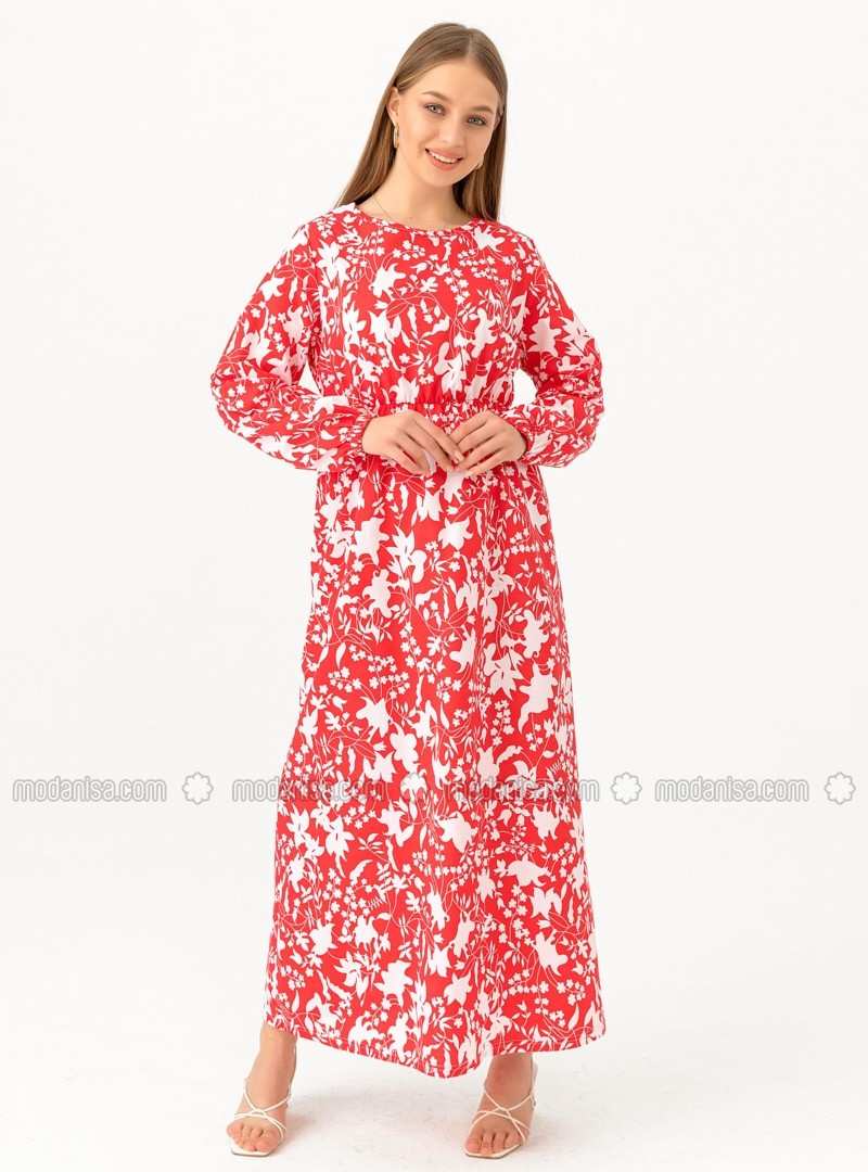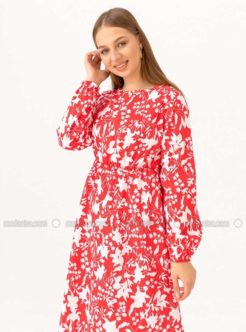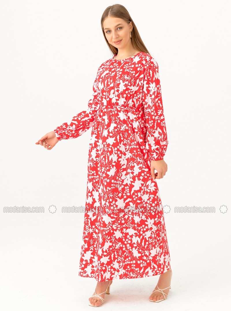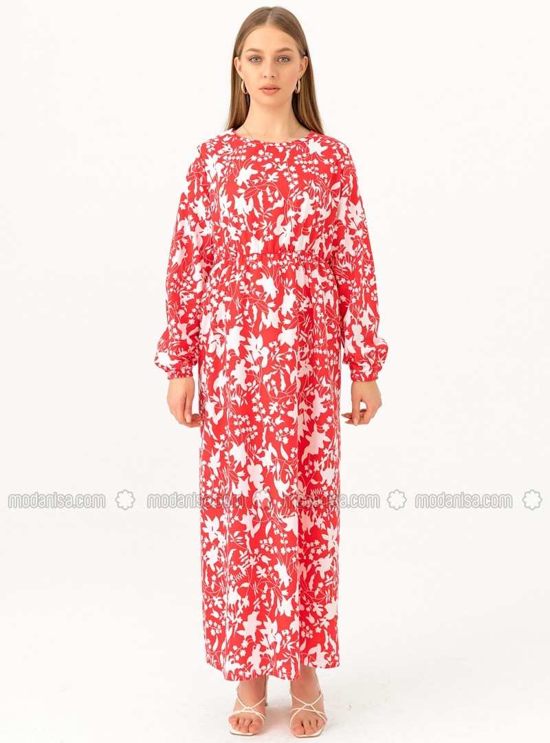 فستان محتشم من القطن غير مُبطن بياقة دائرية متعددة باللون الأحمر