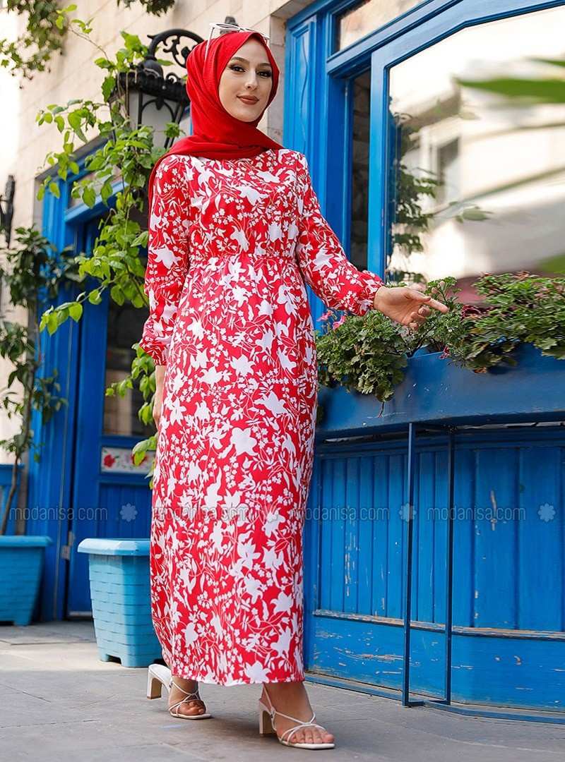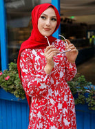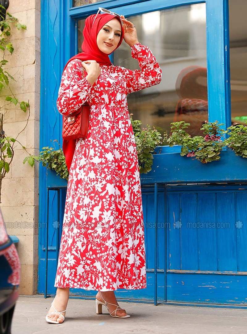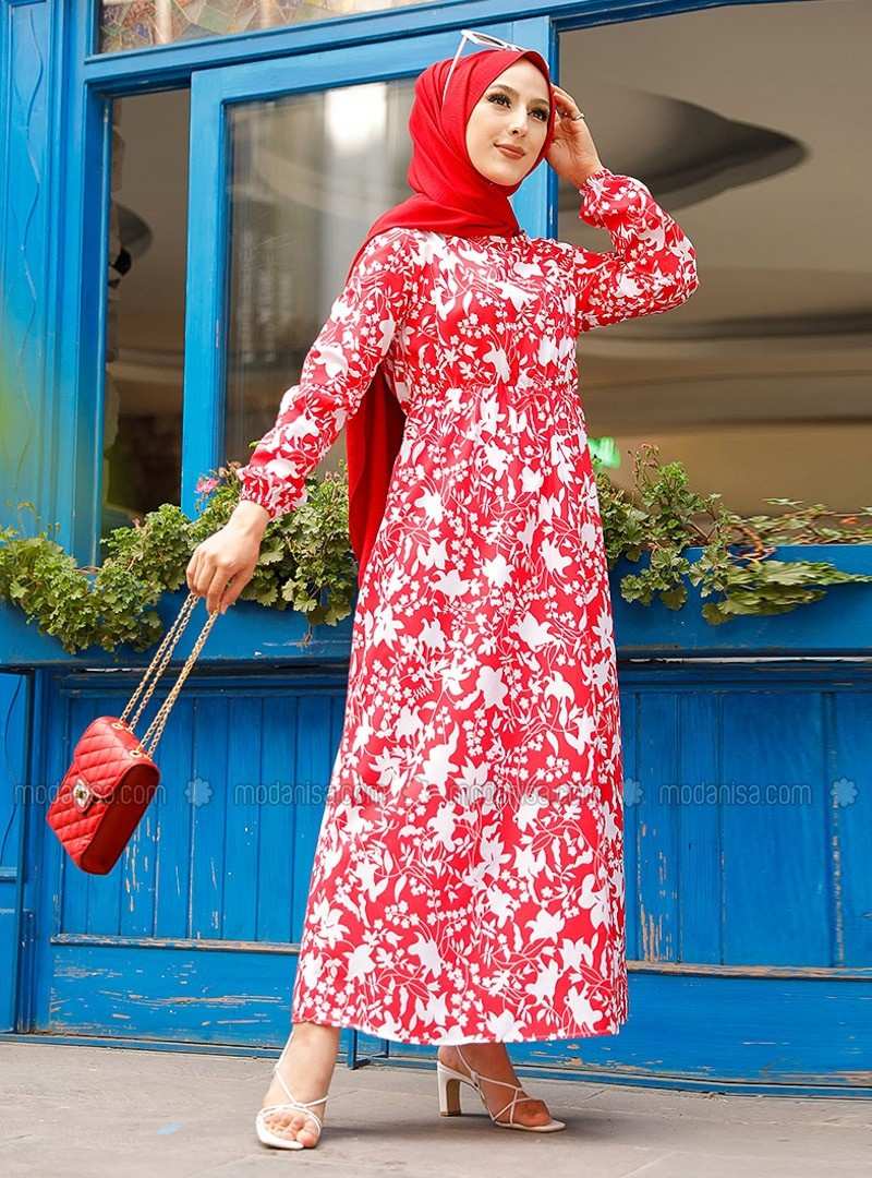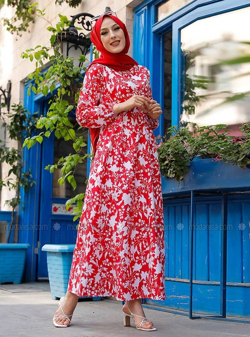 فستان محتشم من القطن غير مُبطن بياقة دائرية متعددة باللون الأحمر