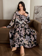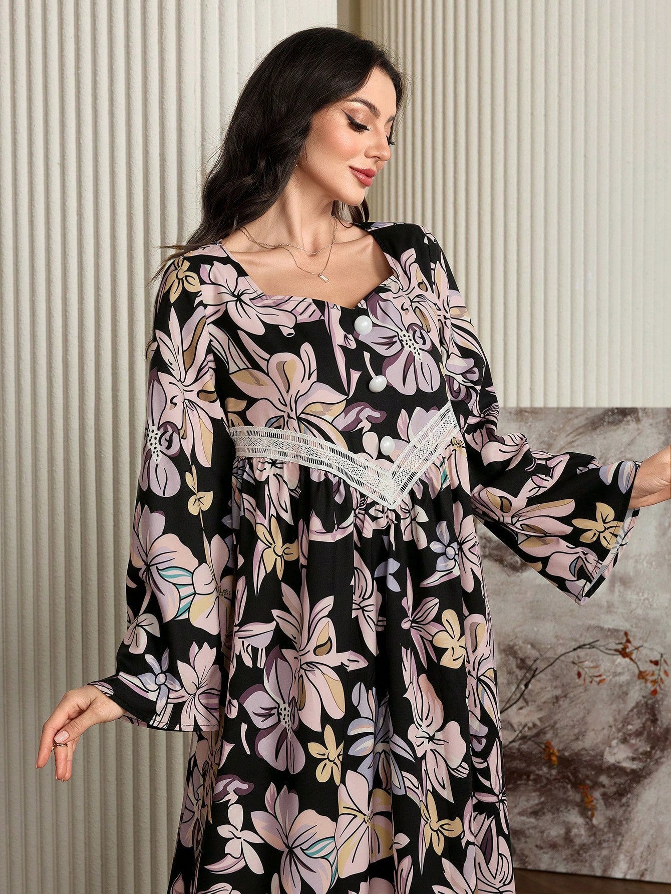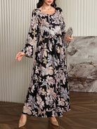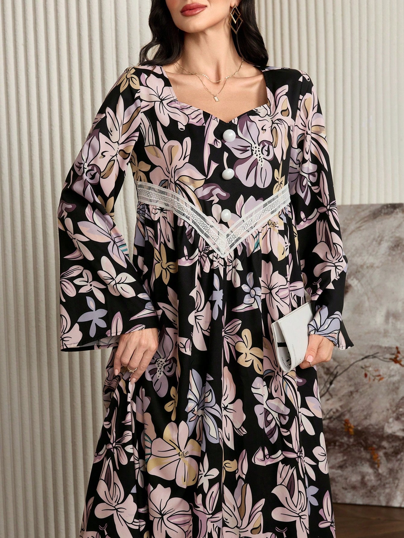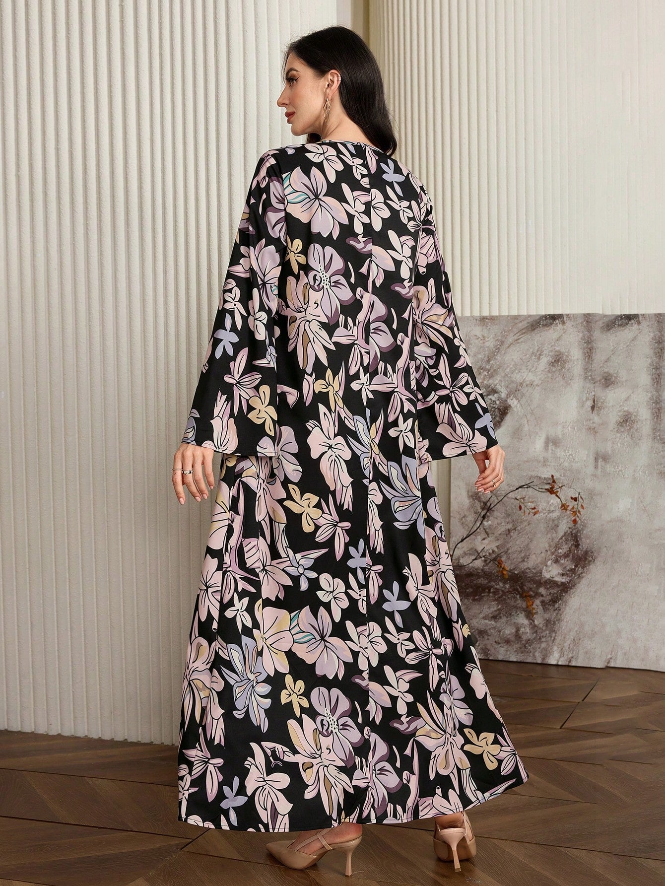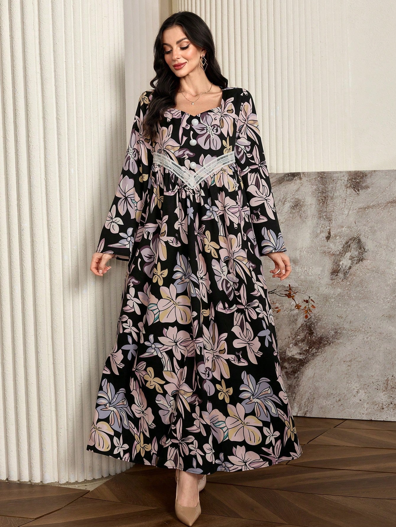 Al Najma Women Spring & Autumn Elegant Floral All-Over Print Arabian Modest Long Sleeve Dress