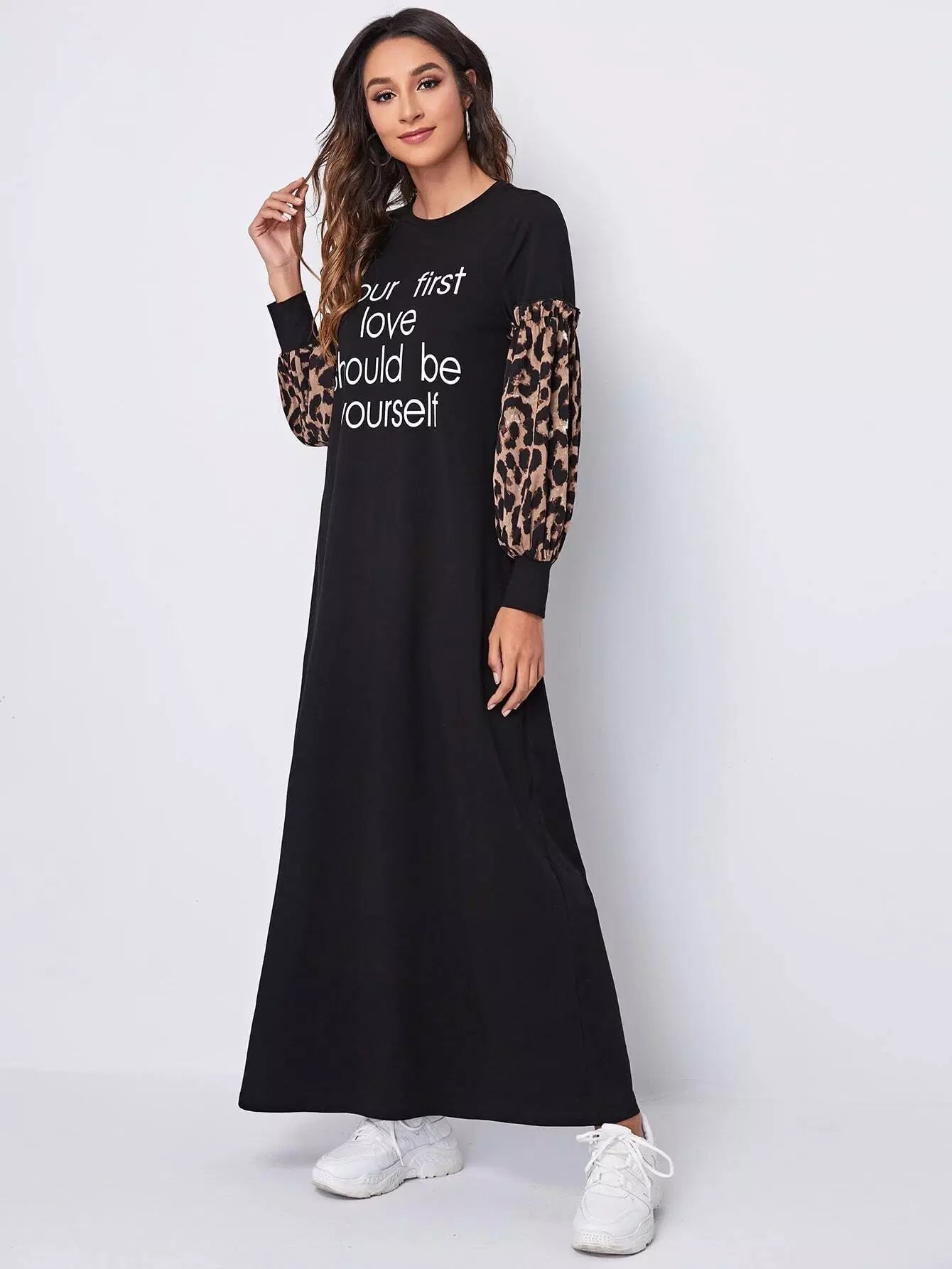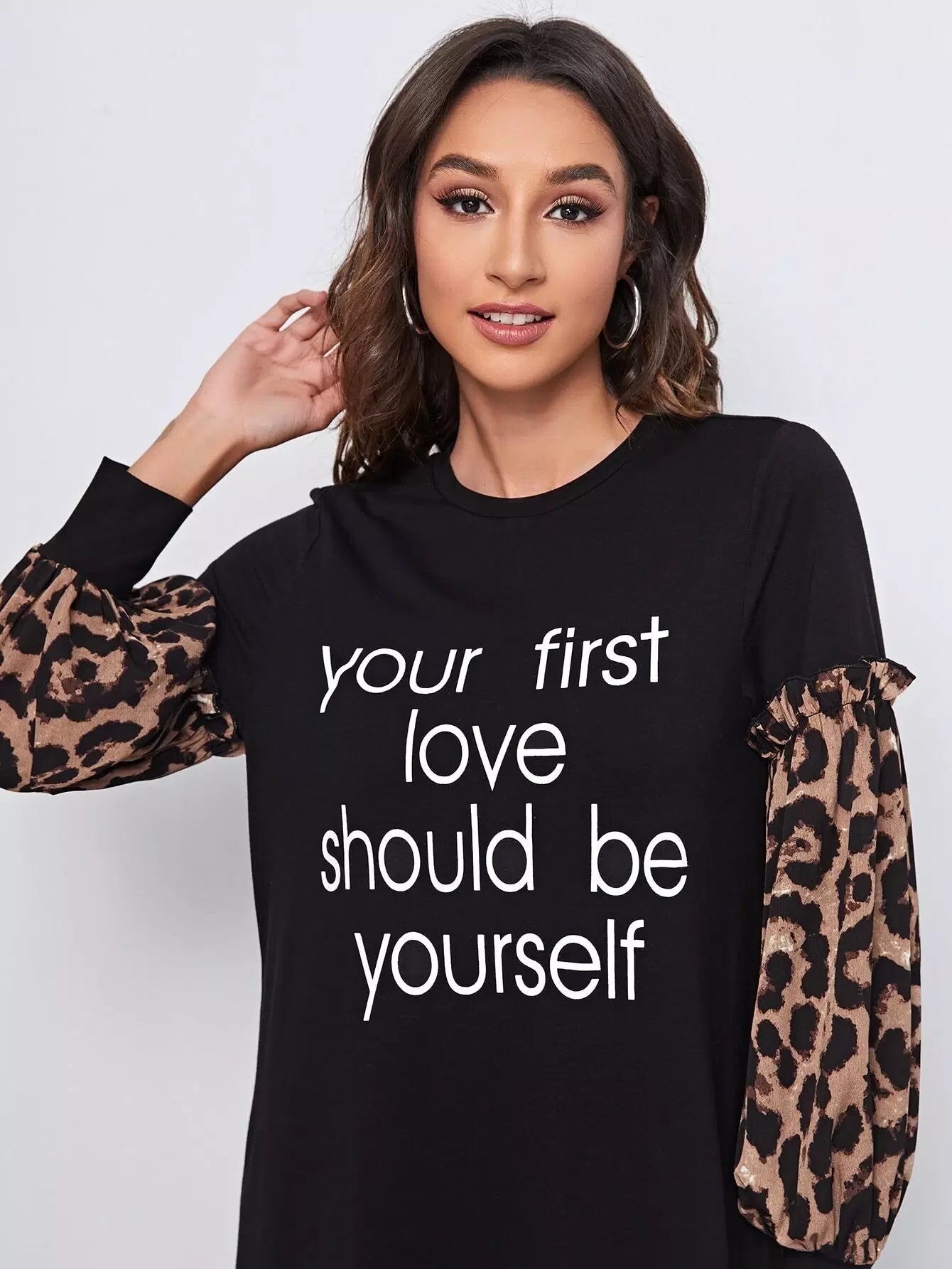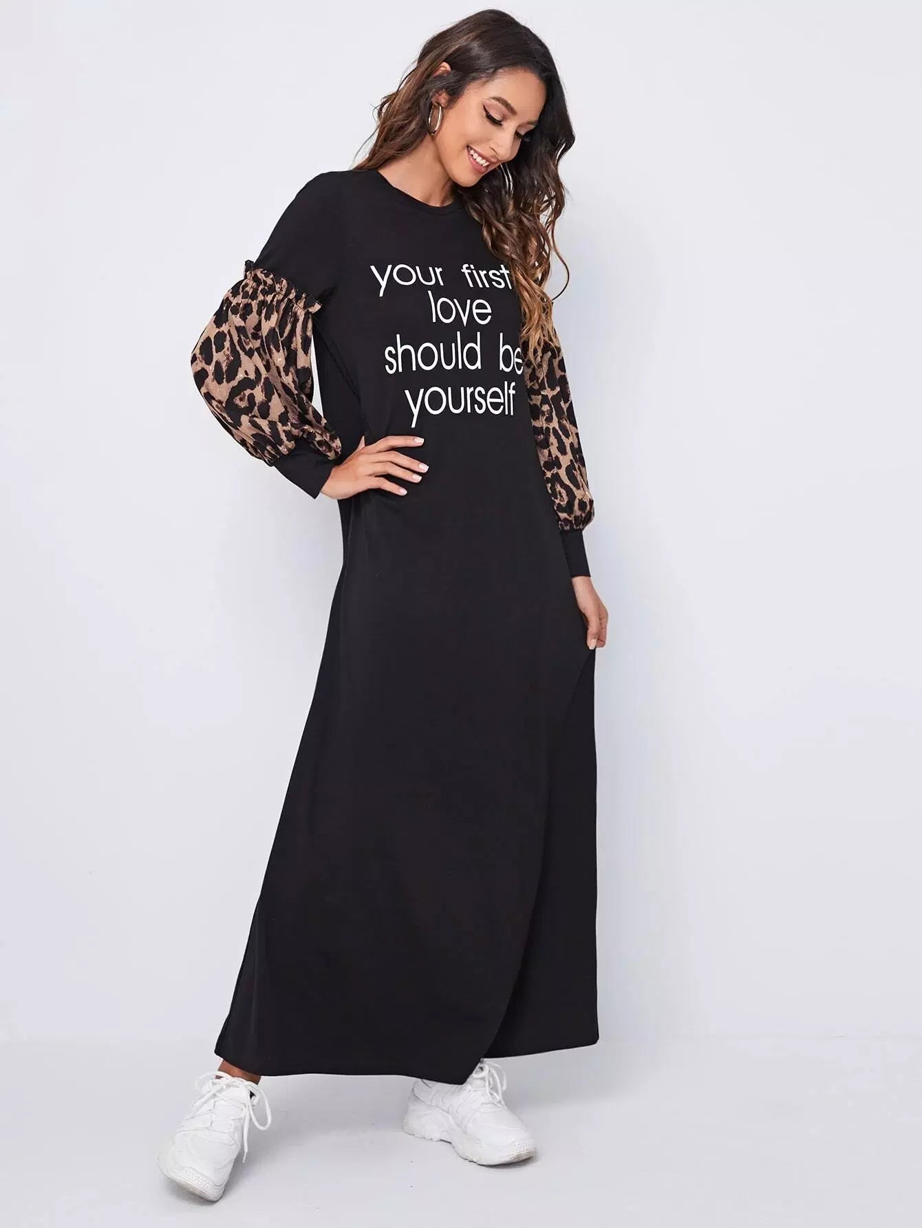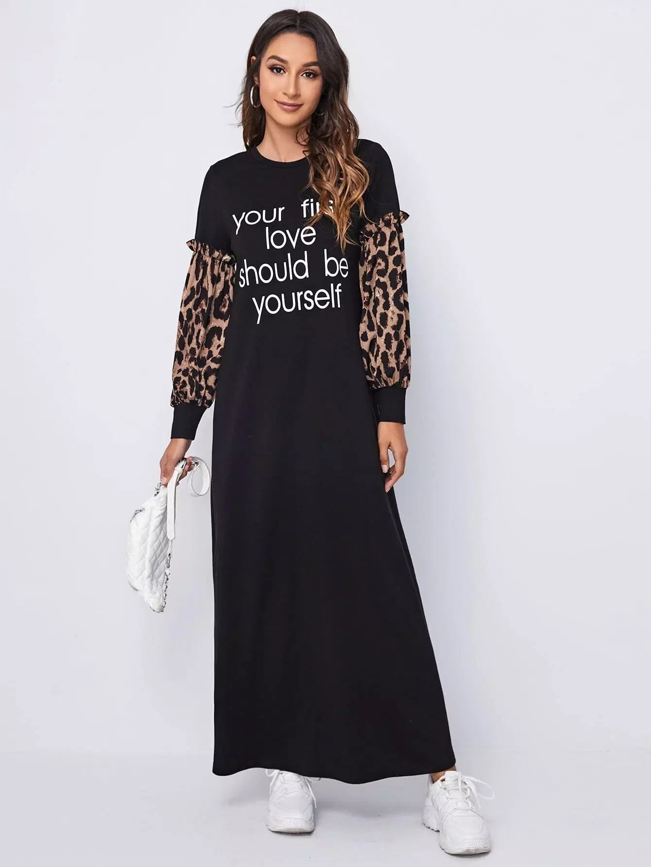 فستان بأكمام شعار الفهد بأطراف كشكش جرافيك مزين بشعار الفهد