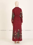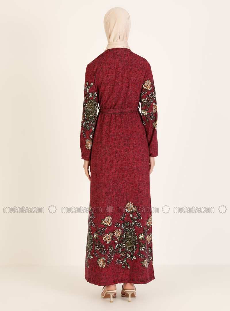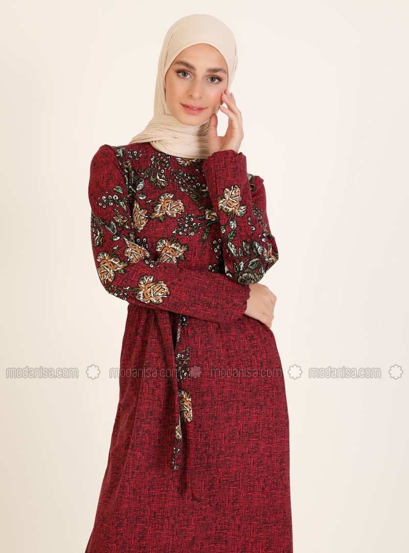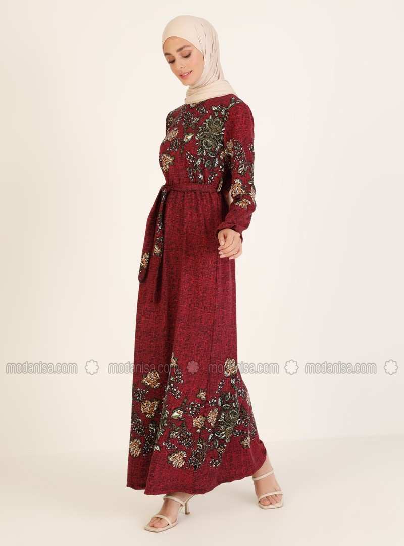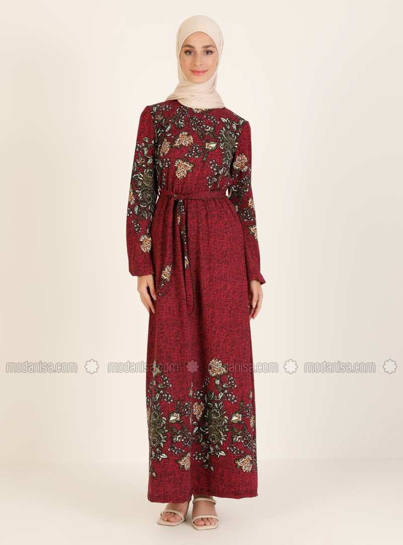 فستان محتشم غير مُبطن بياقة دائرية كستنائي متعدد الألوان