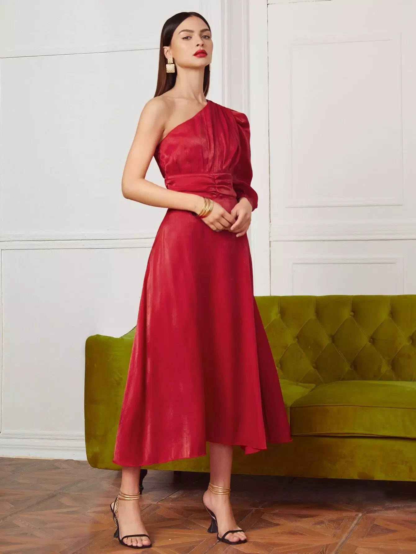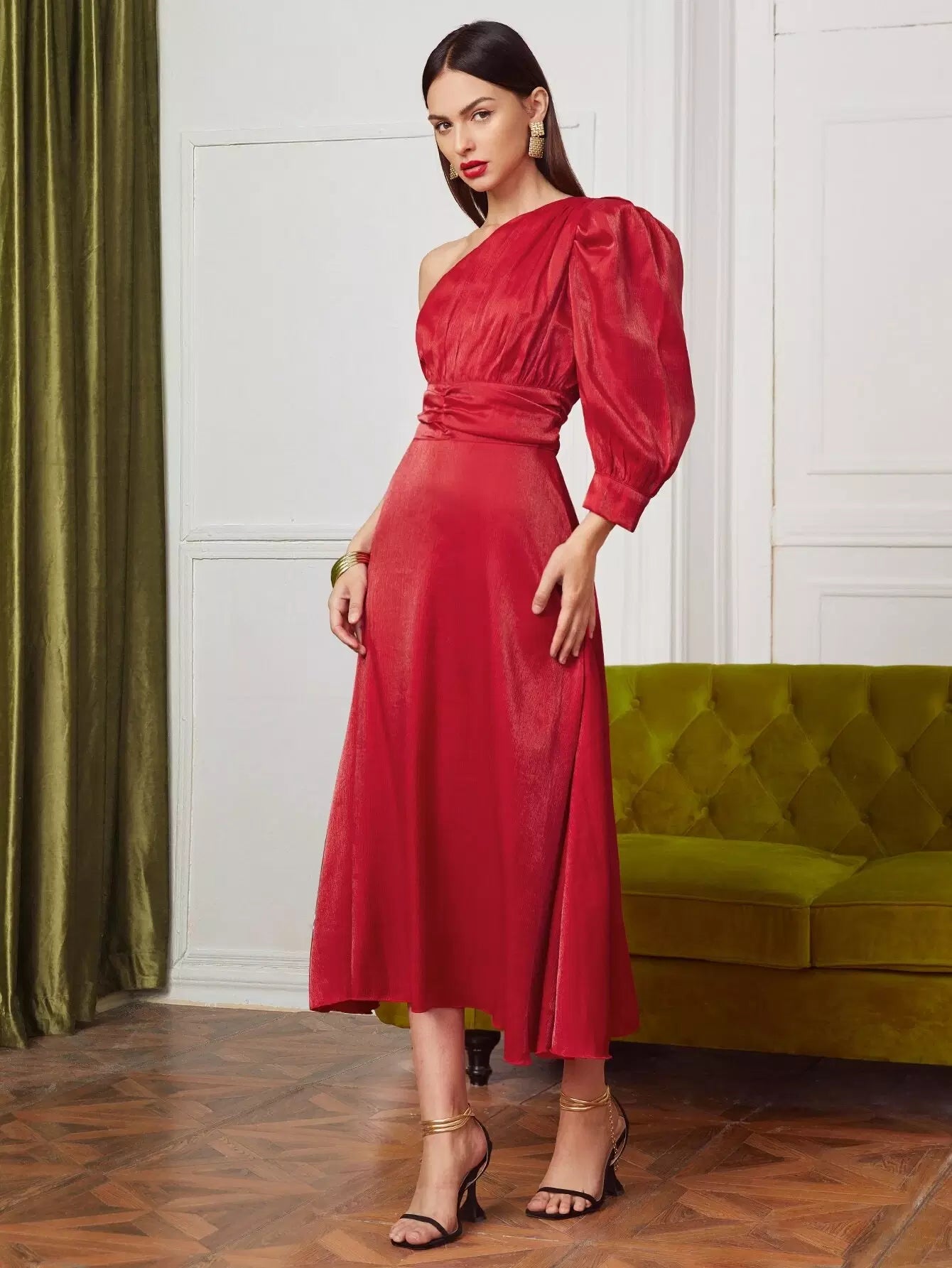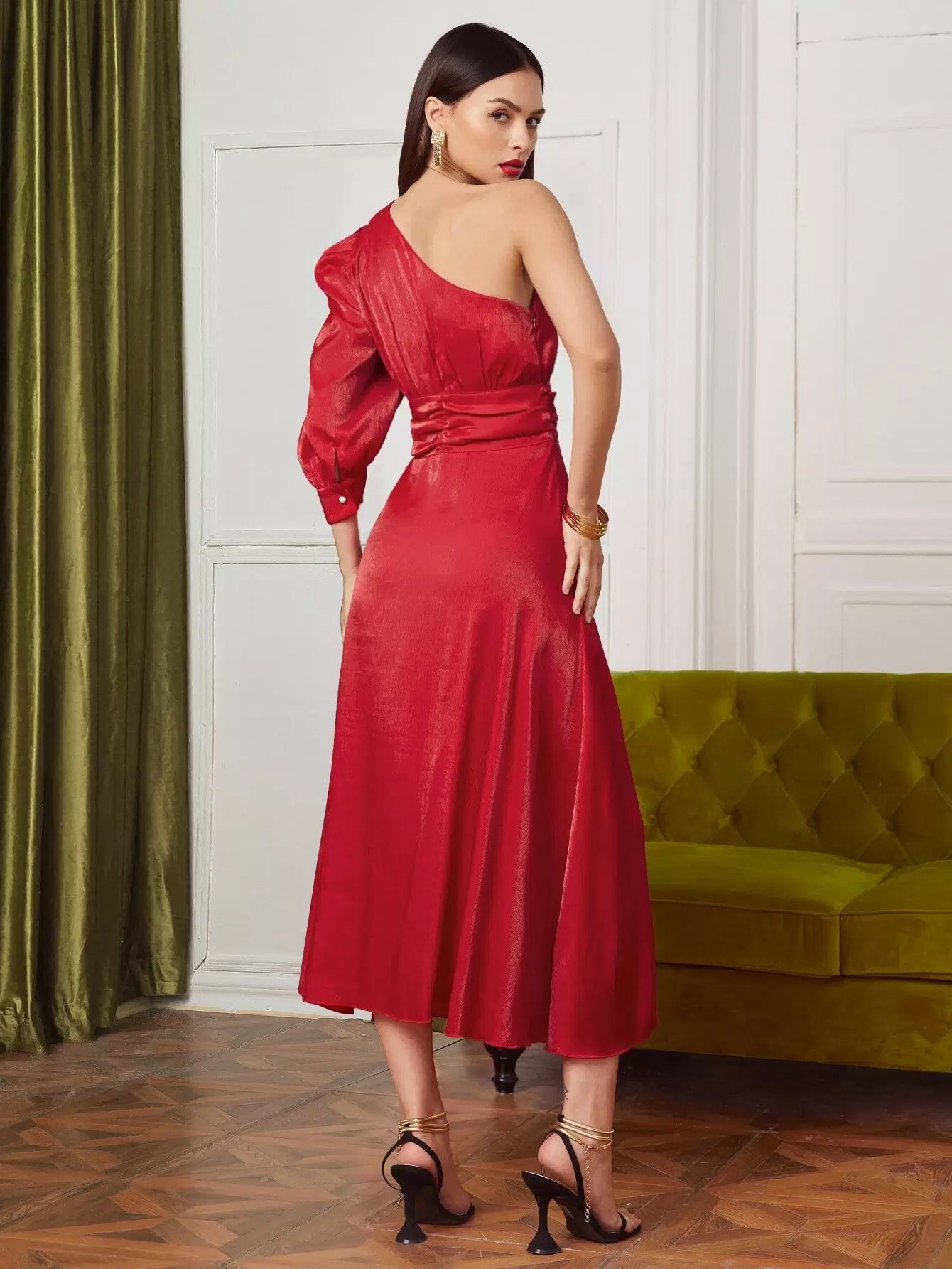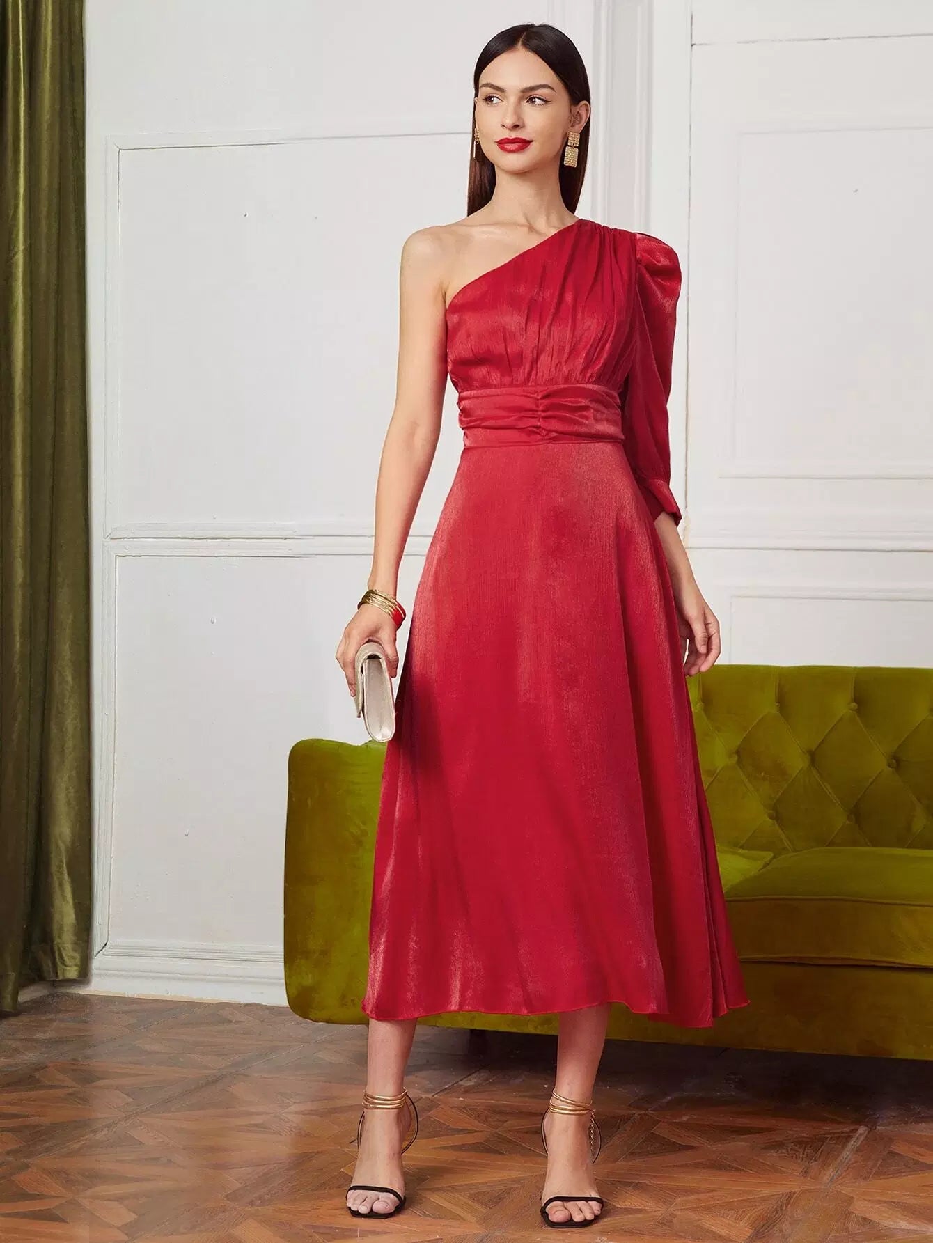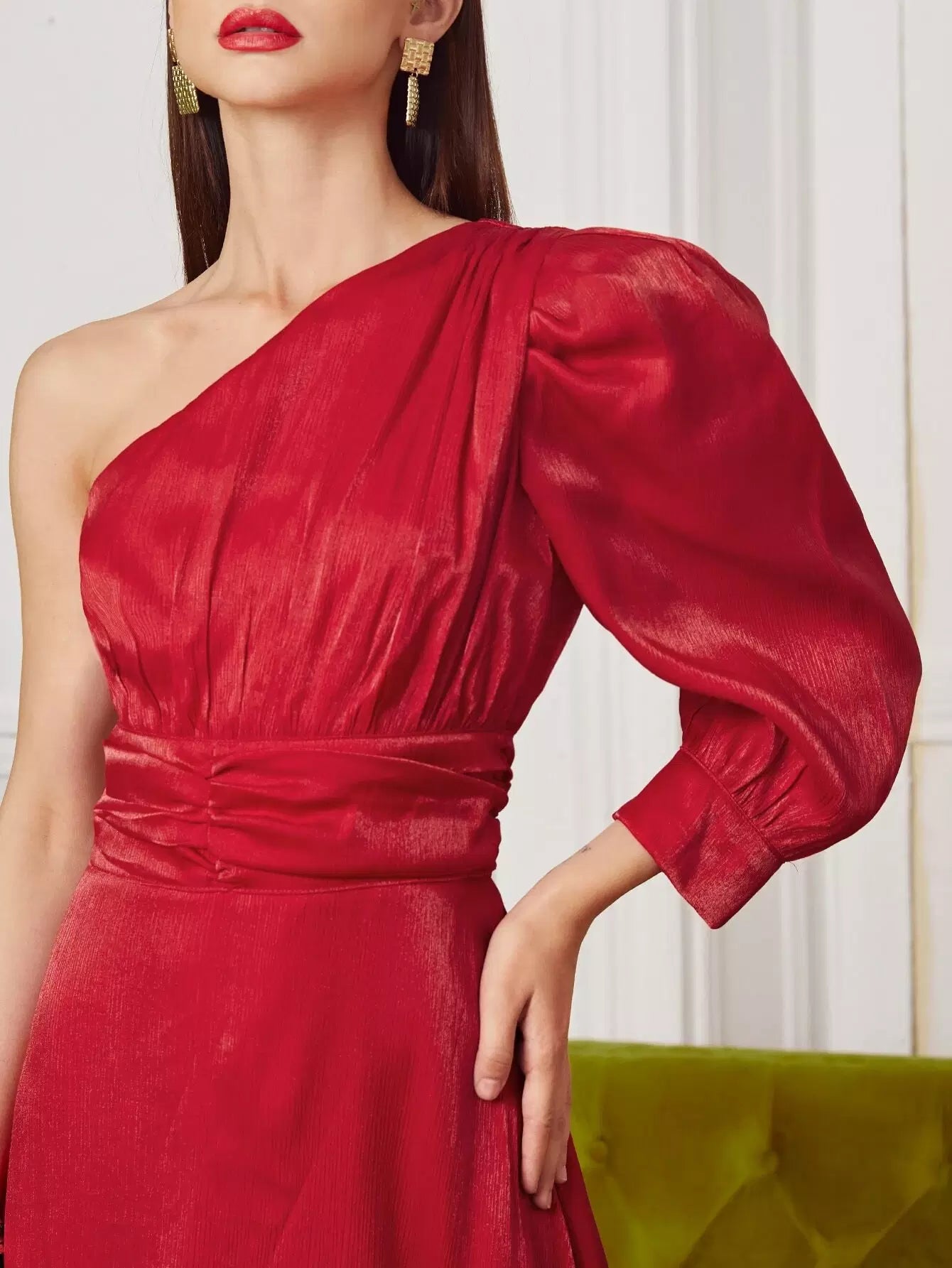 فستان بأكمام منفوشة بأكمام منفوشة على كتف واحد وخصر مكشكش