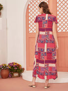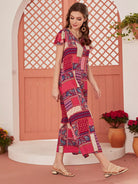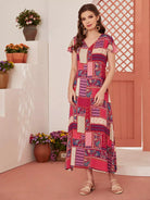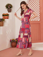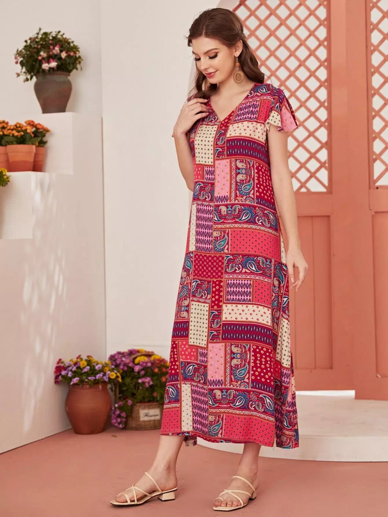 فستان مرقع برقبة على شكل V برقبة على شكل V وكشكشة