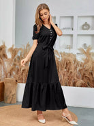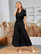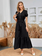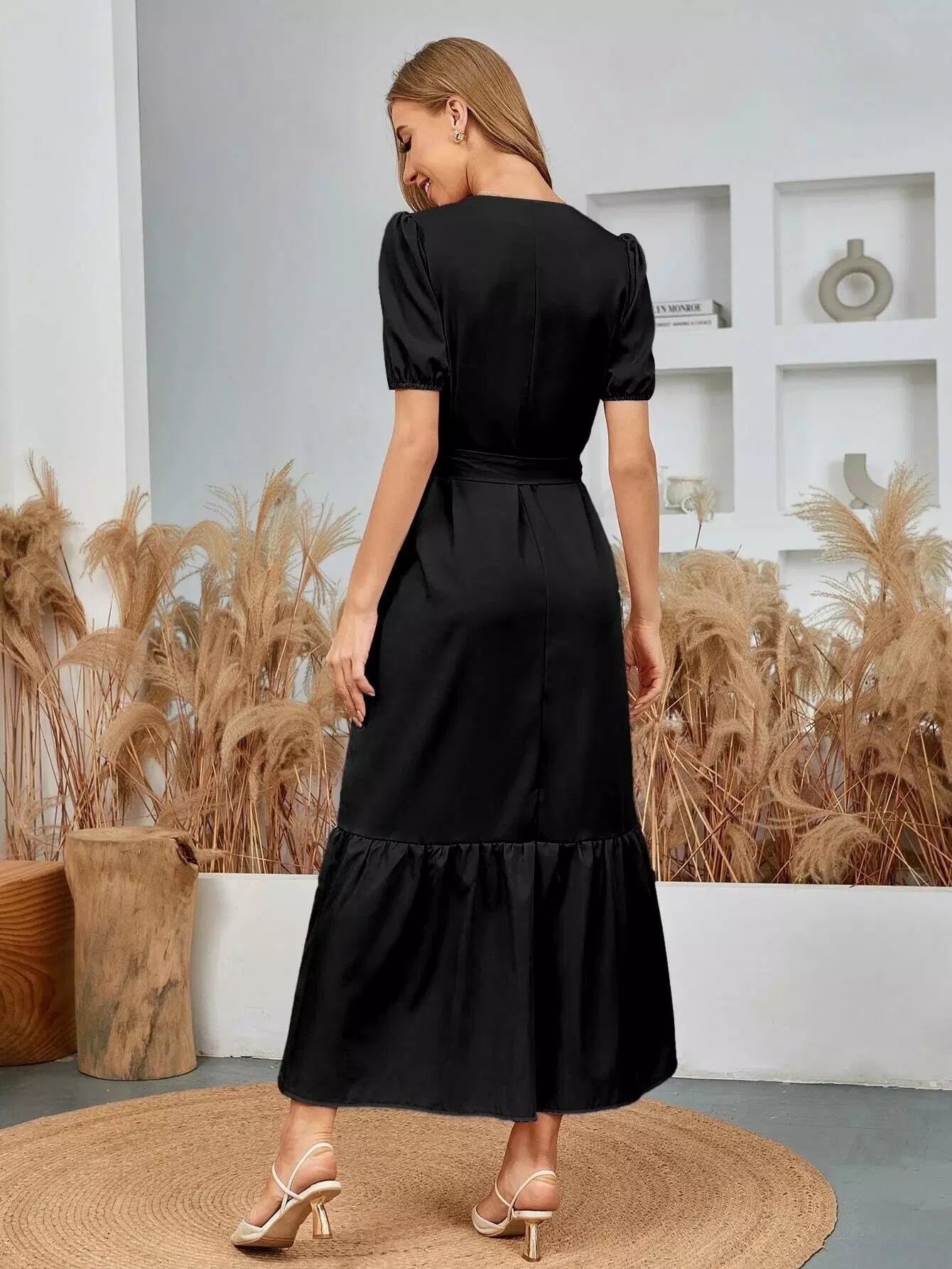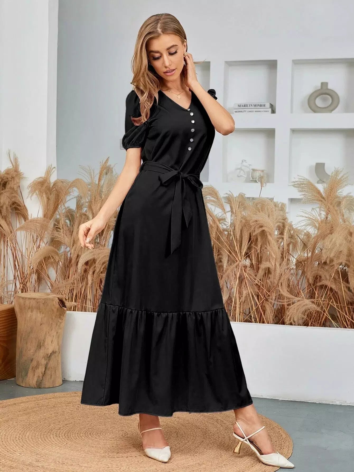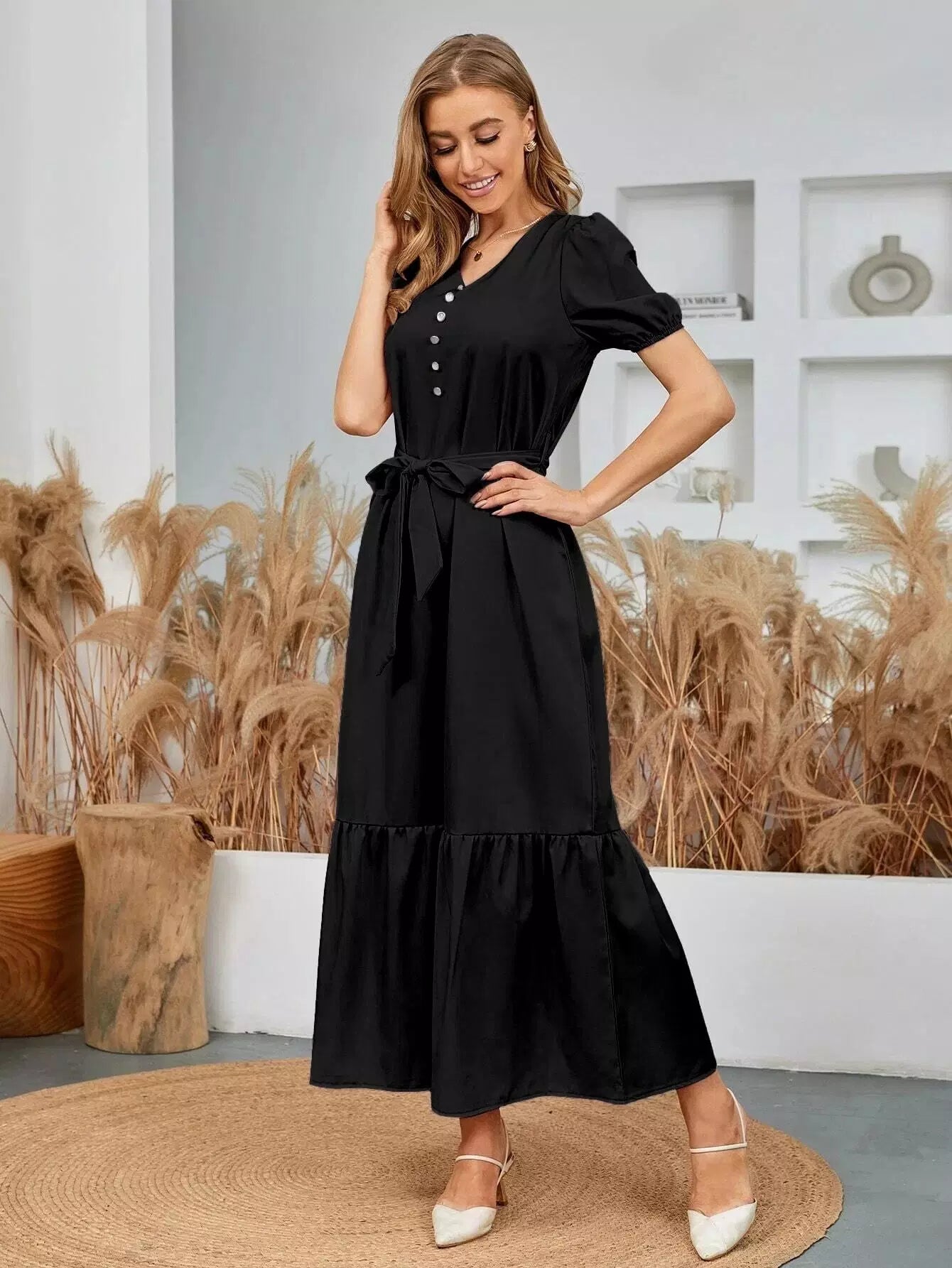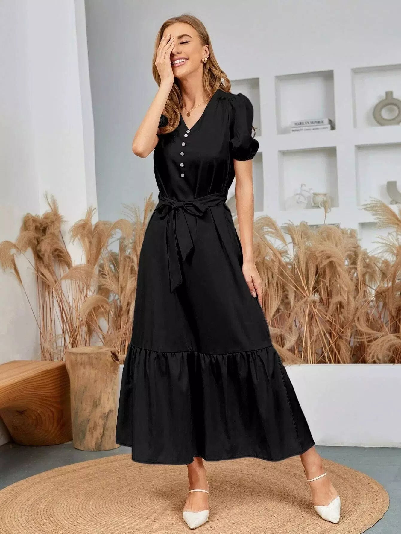 فستان على شكل حرف A بأكمام منتفخة وكشكشة بدون حزام