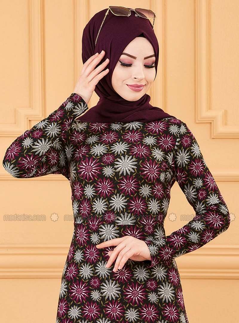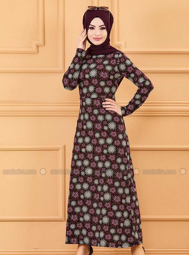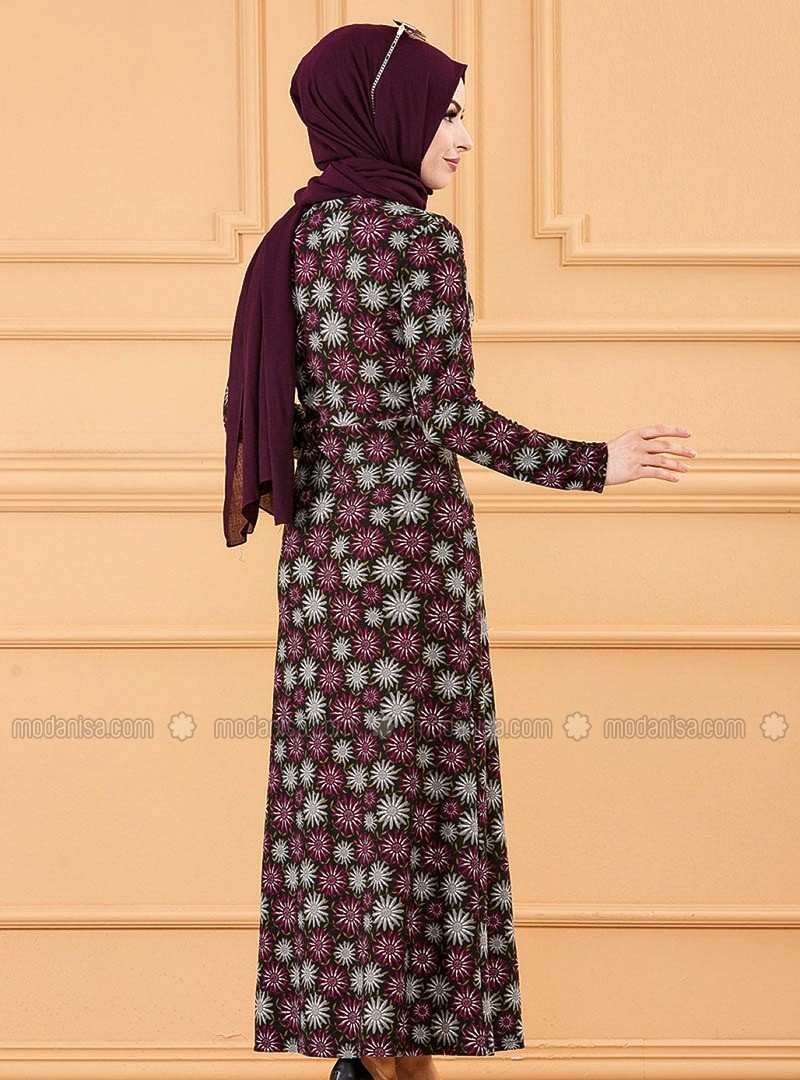 فستان محتشم من الفيسكوز غير مُبطن بياقة دائرية وياقة مدببة باللون الأرجواني