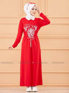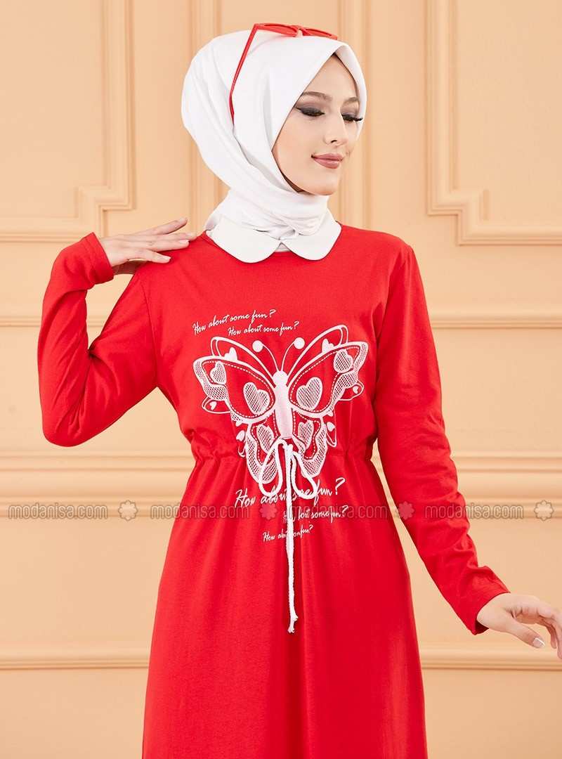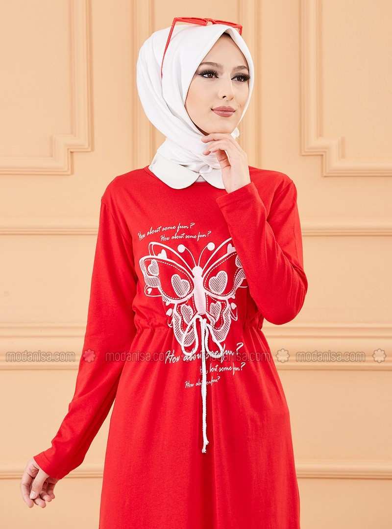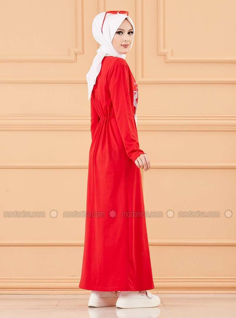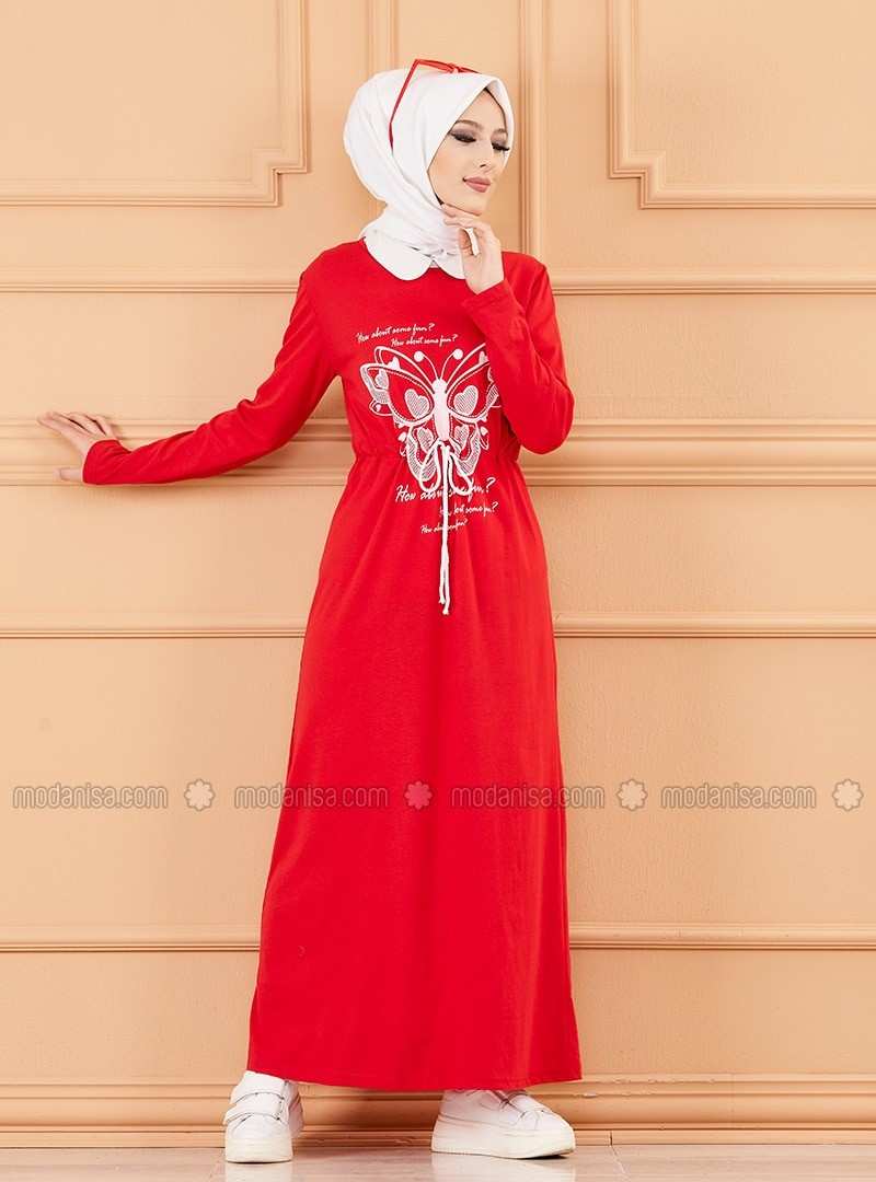 فستان محتشم من الفيسكوز القطني غير المبطن بياقة دائرية أحمر متعدد الألوان
