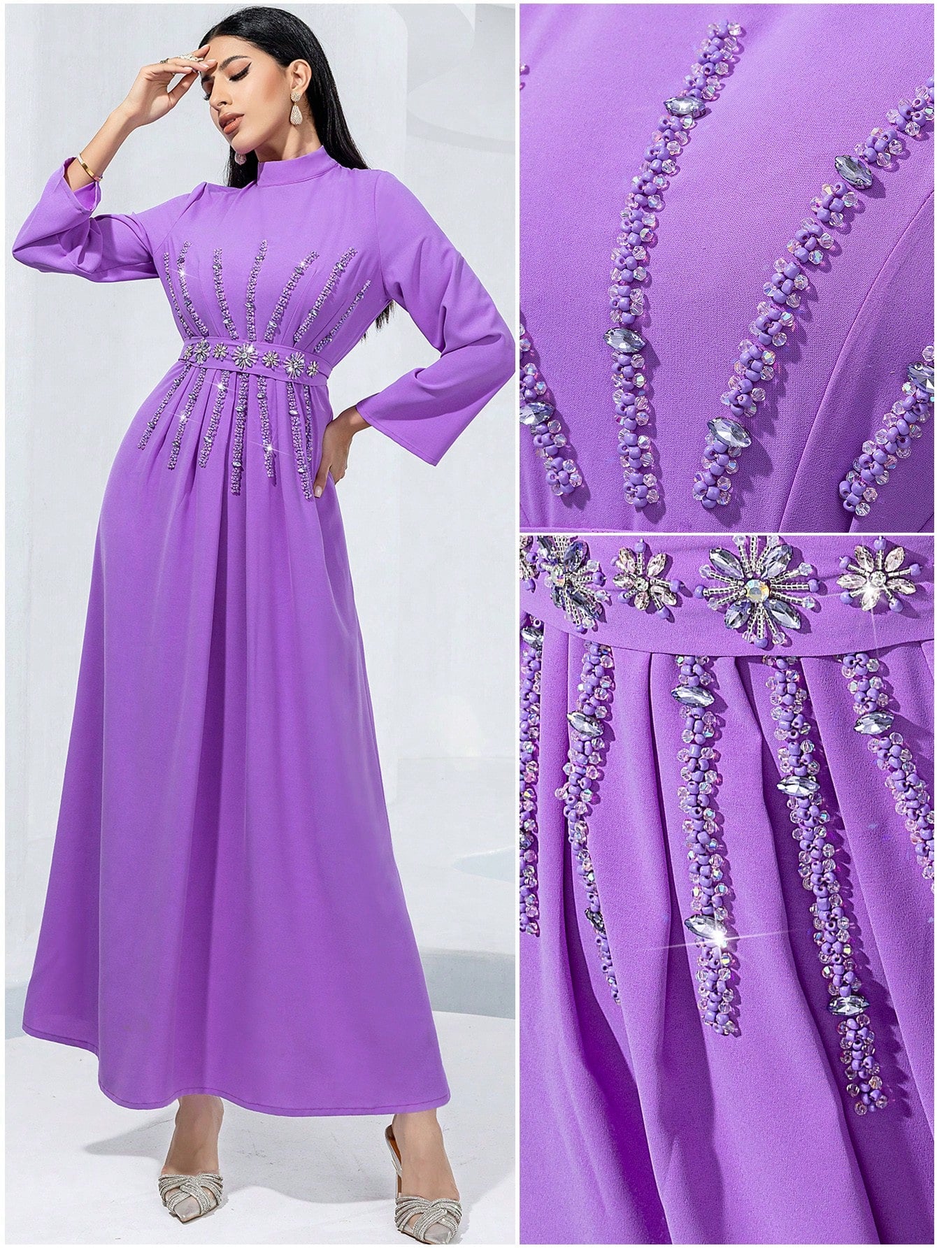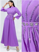 فستان النجمة النسائي ذو الياقة العالية والأكمام الطويلة والمزين بأحجار الراين على الطراز العربي، مع قفطان وجلابية.