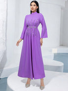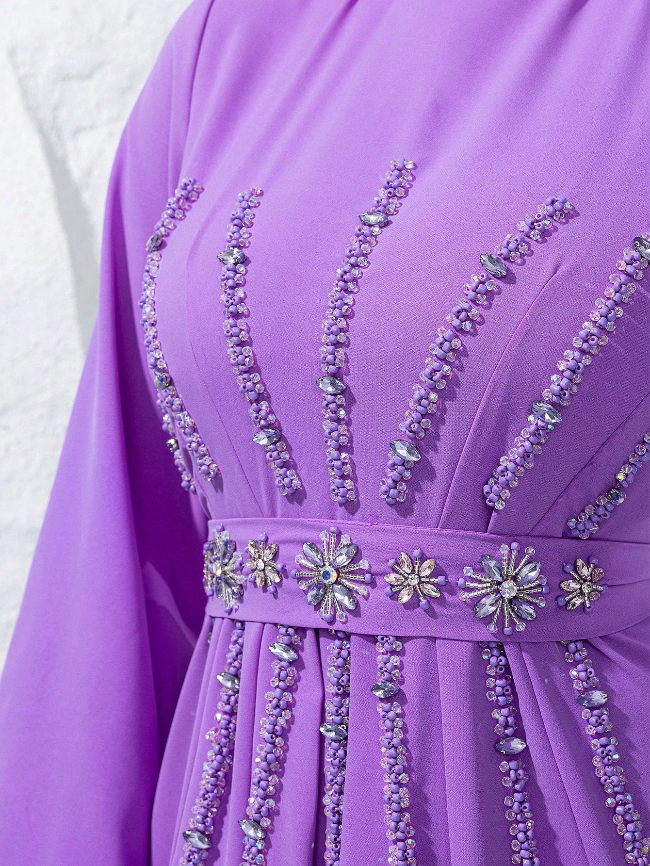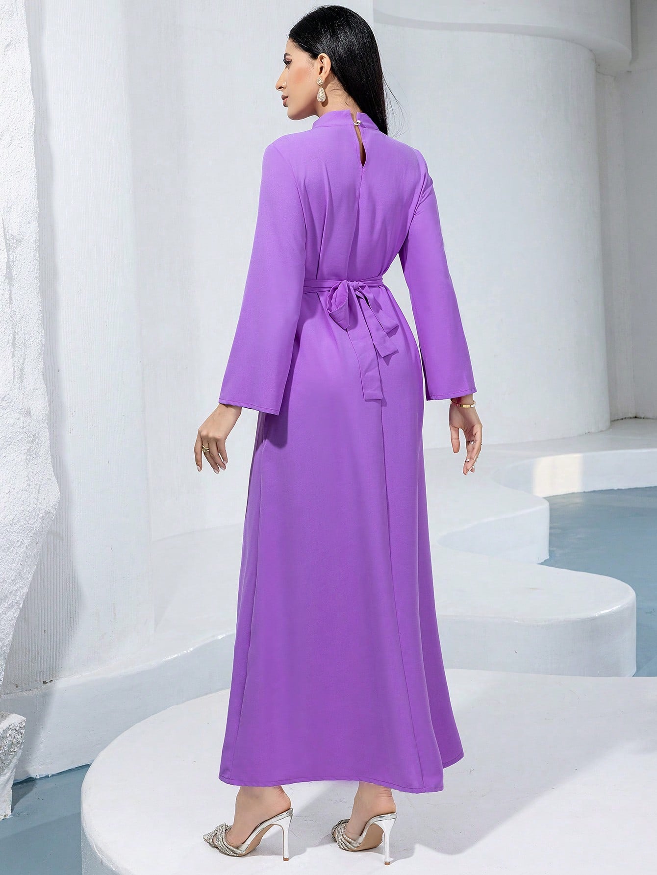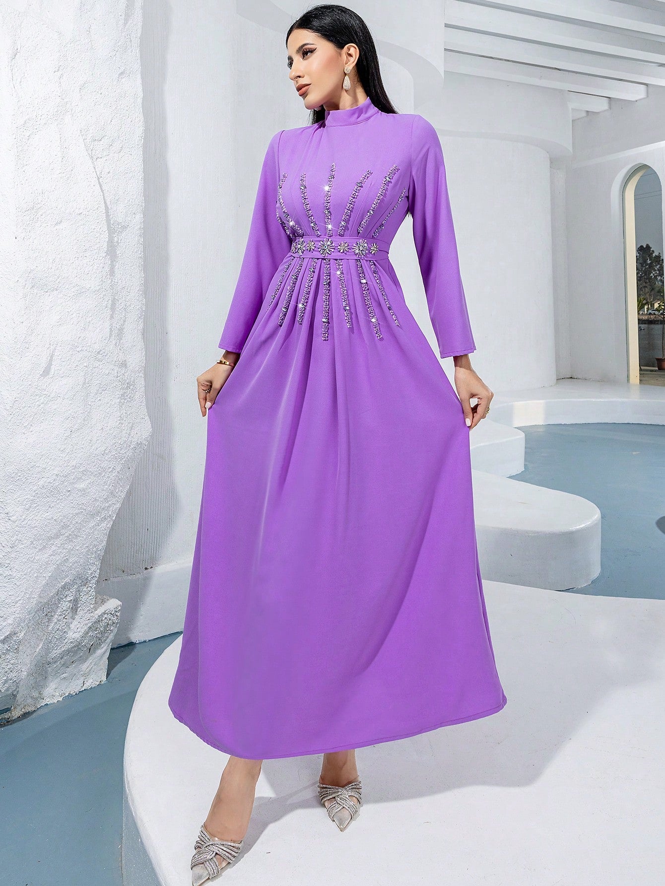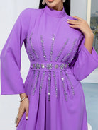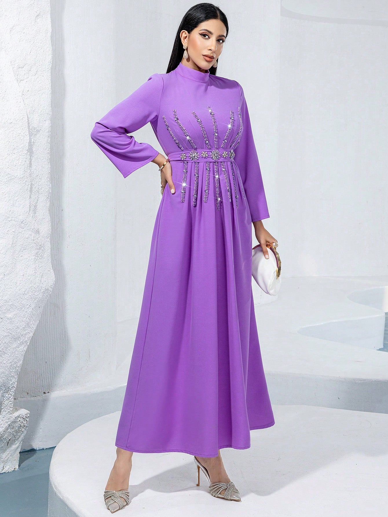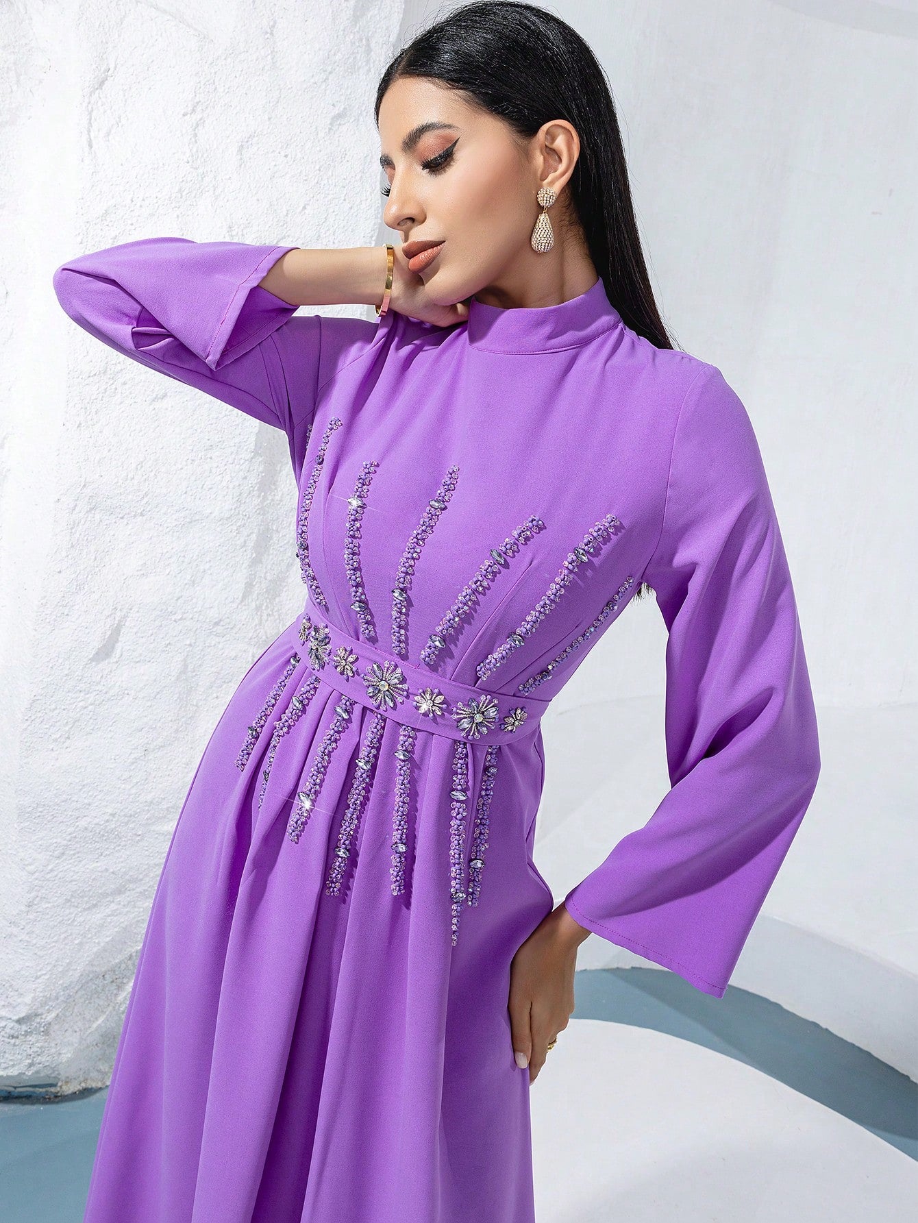 Al Najma Women's Standup Collar Long Sleeve Rhinestone Embellished Arabic Style Dress, Kaftan & Jalabiya,