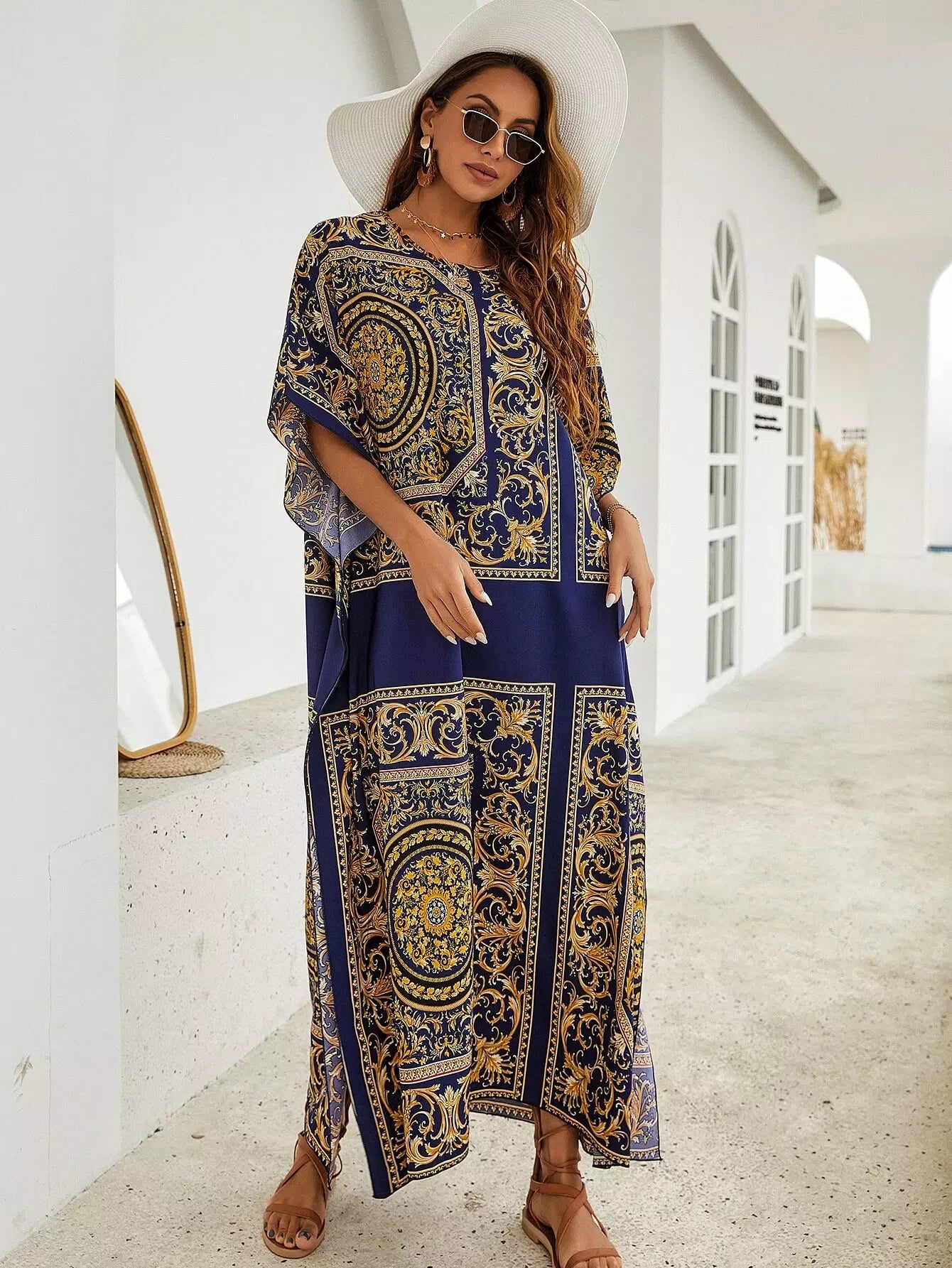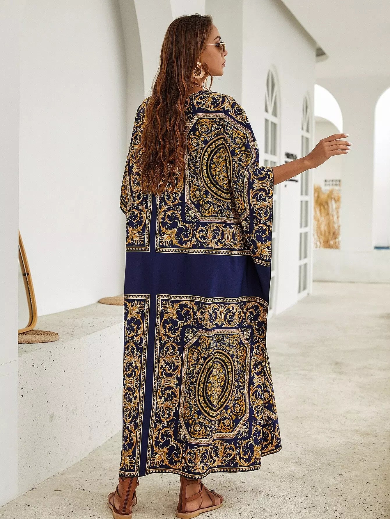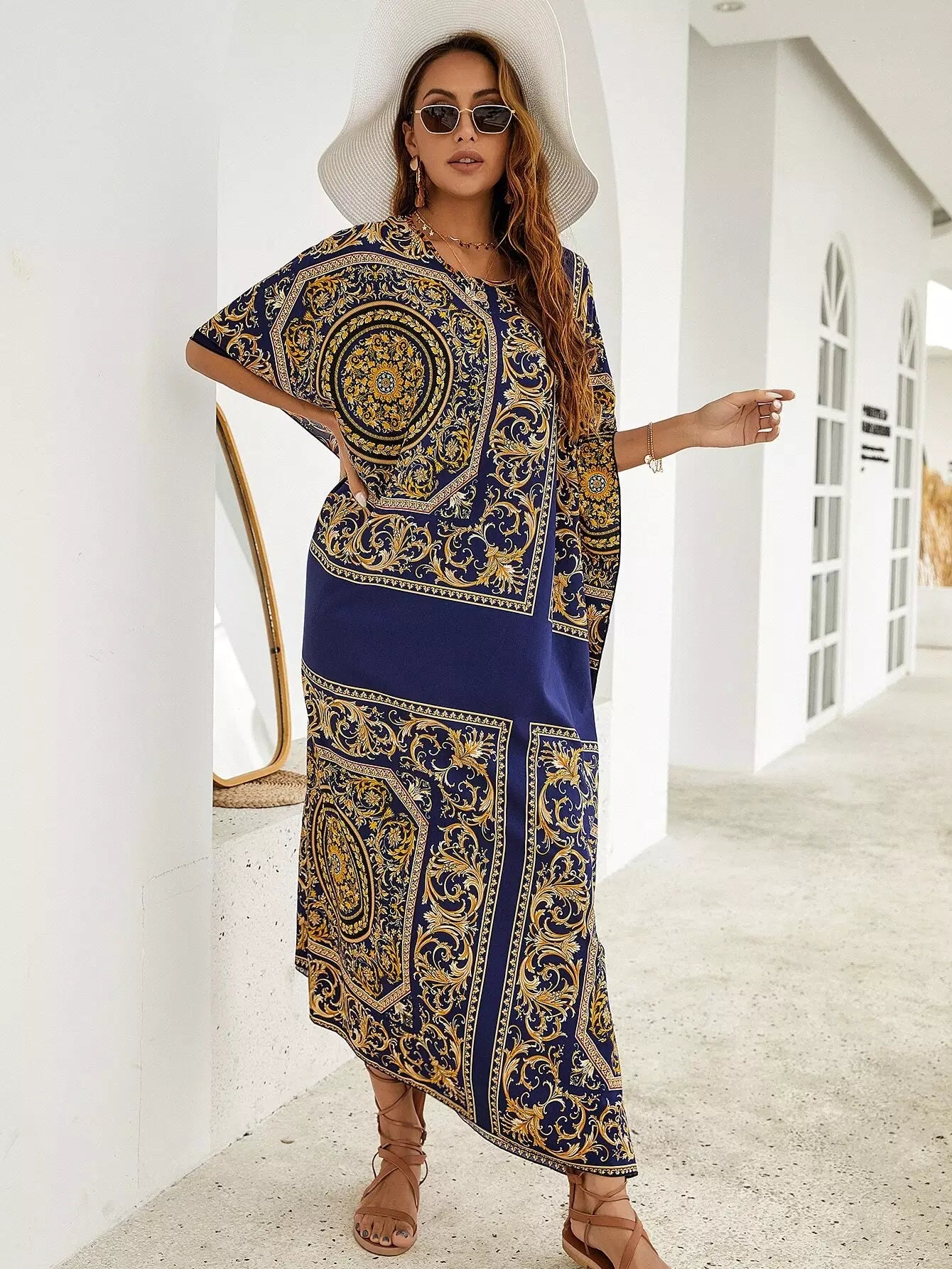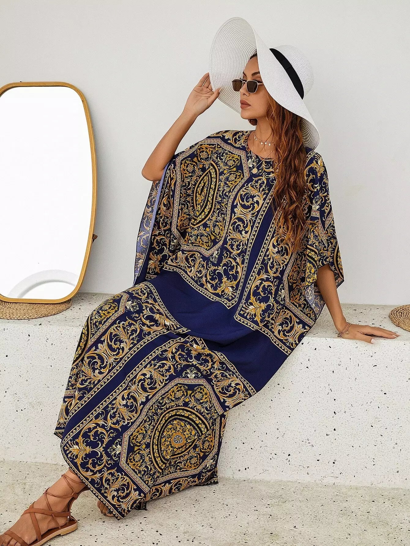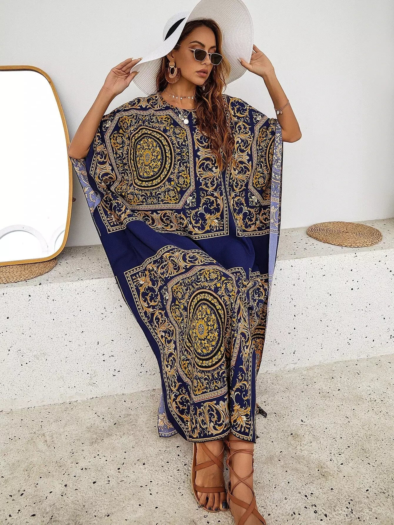 للنساء - فستان قفطان بأكمام جناح الخفاش وطبعة وشاح