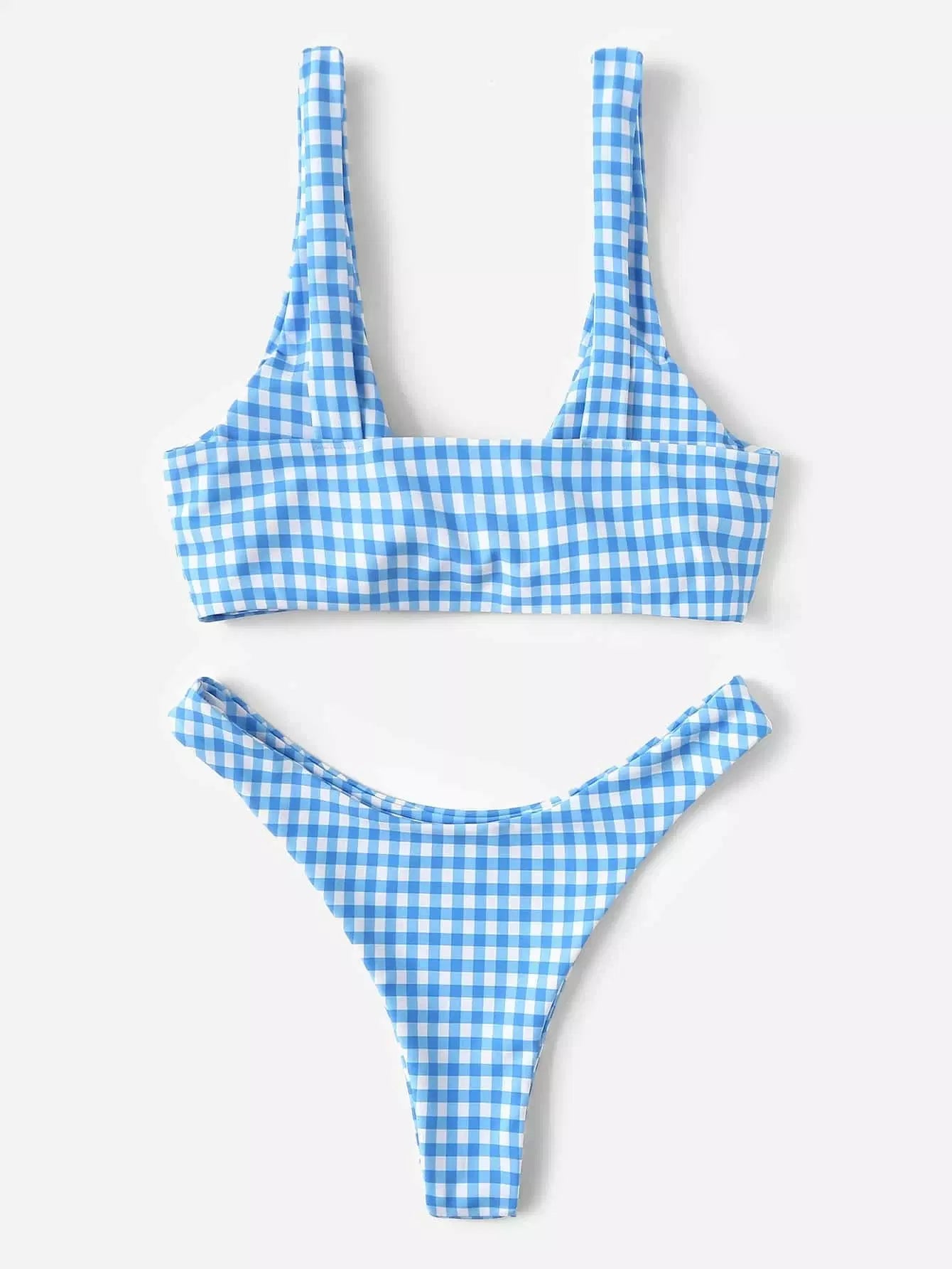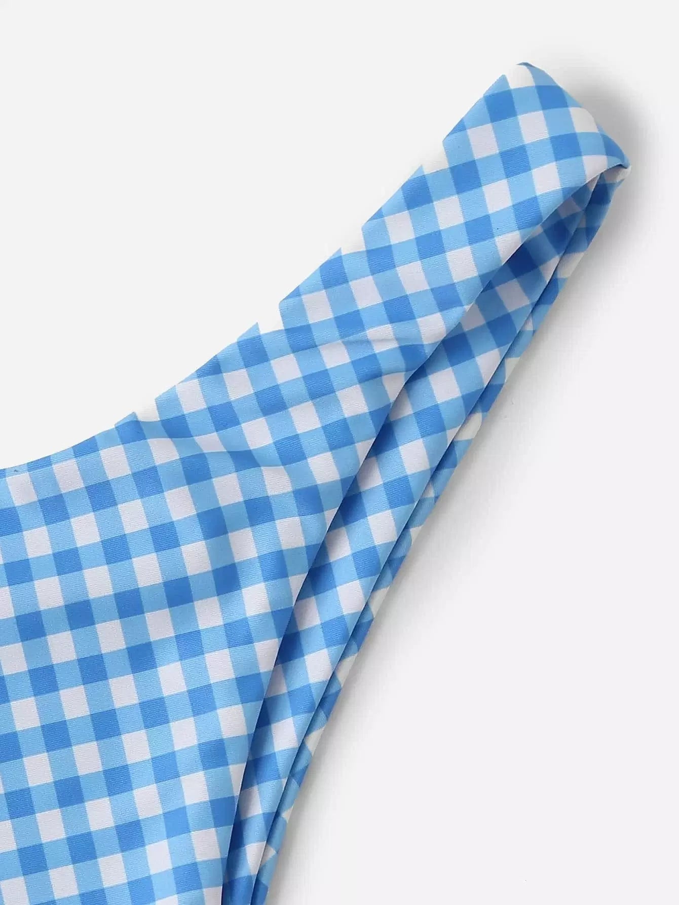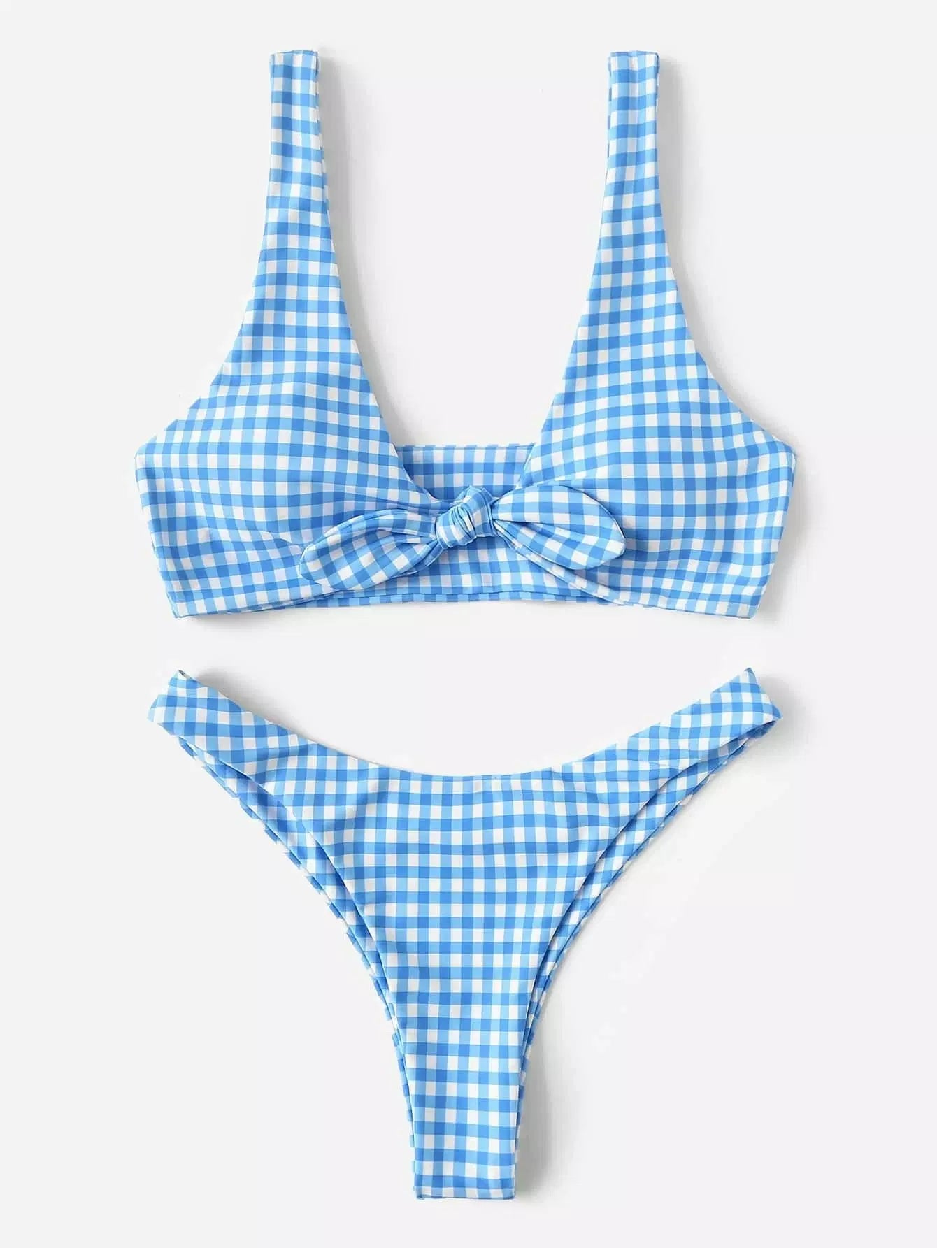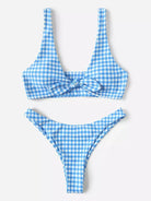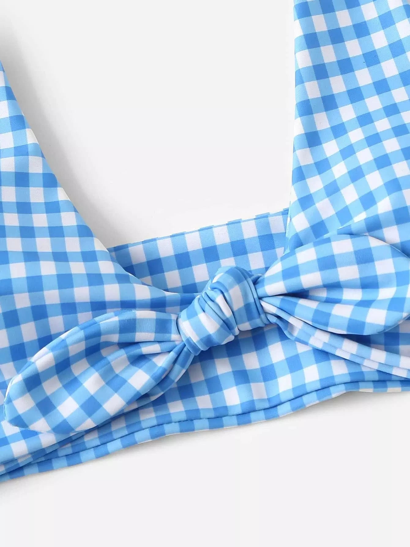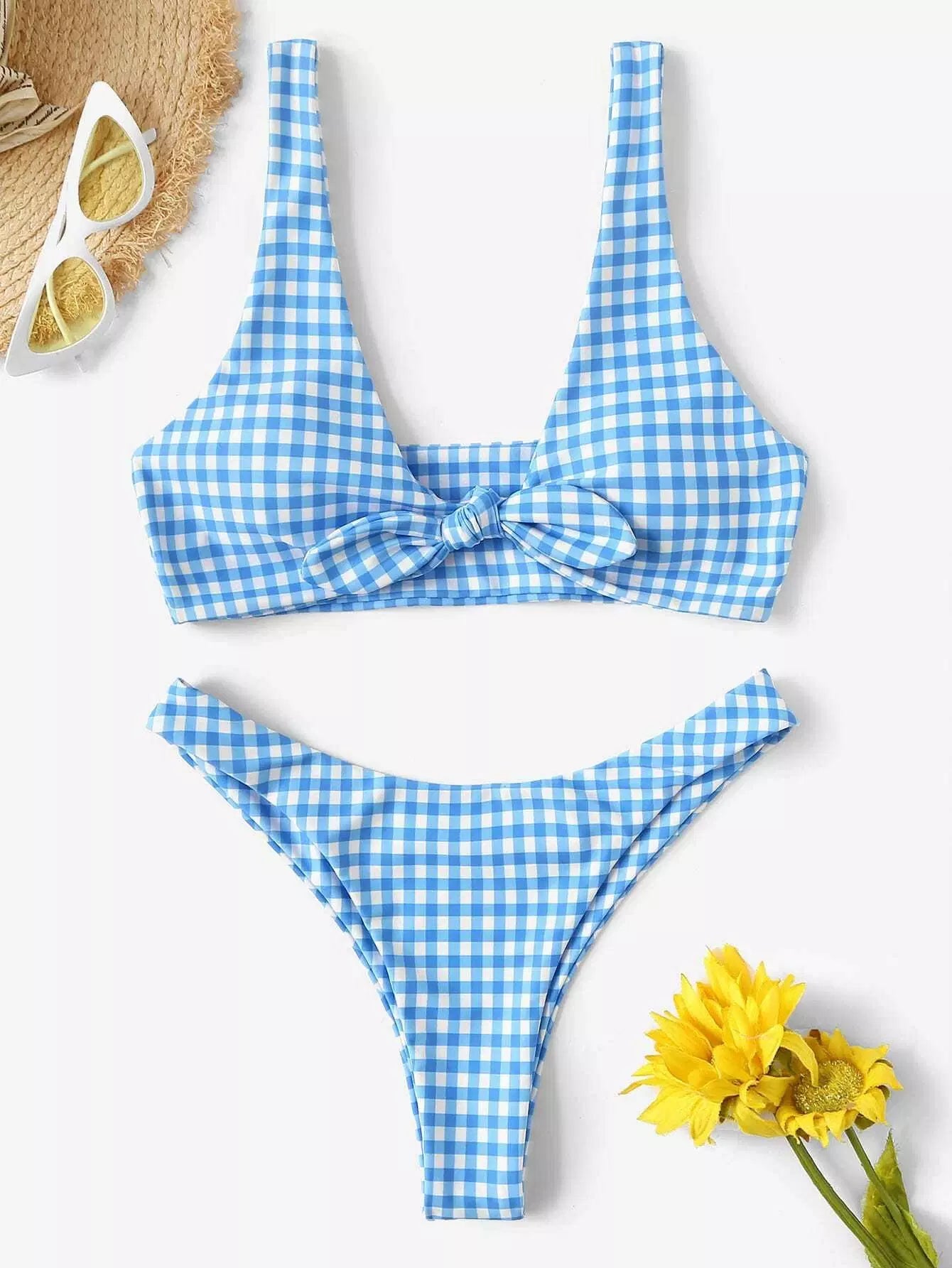 طقم بيكيني بفتحة عالية وجزء علوي من قماش غينغهام بعقدة أمامية