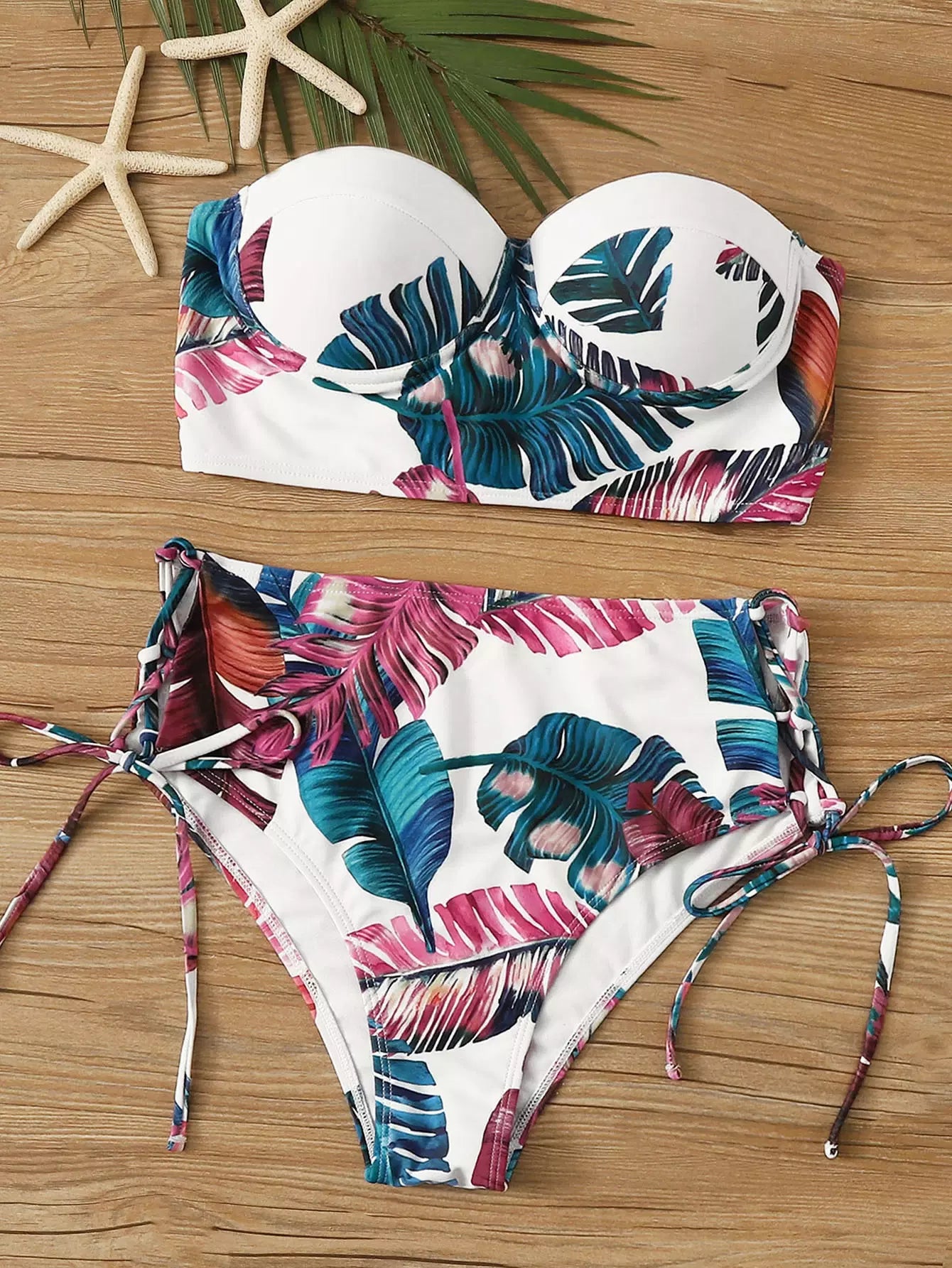 النساء - ملابس السباحة بيكيني بوستير باندو ذات طباعة عشوائية من الجانب