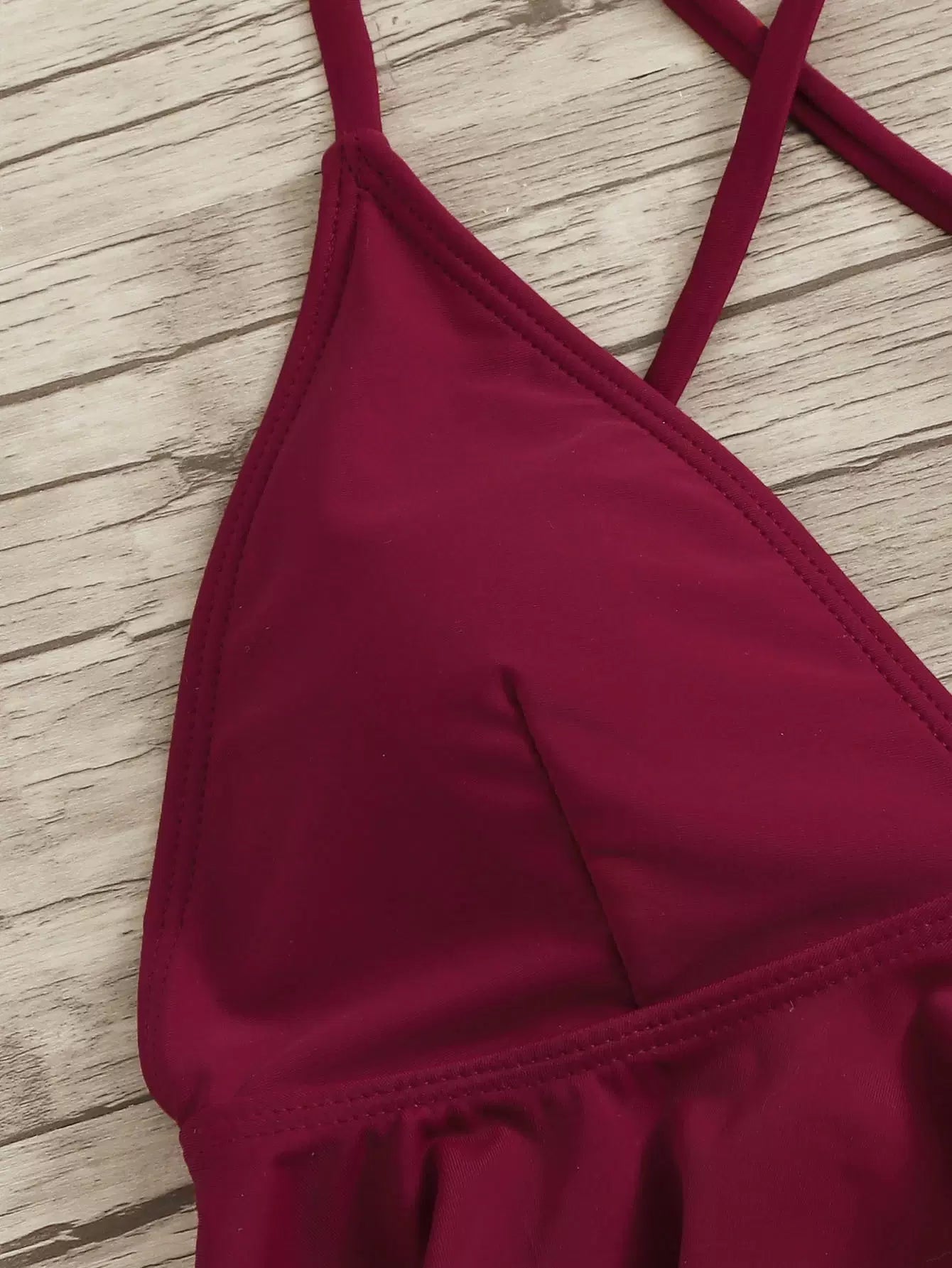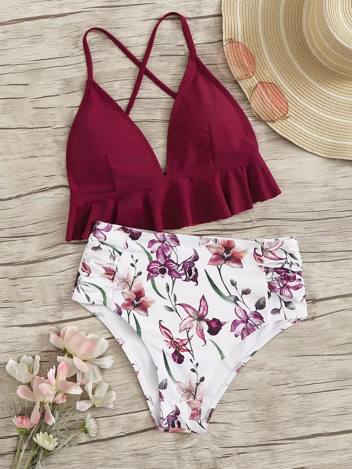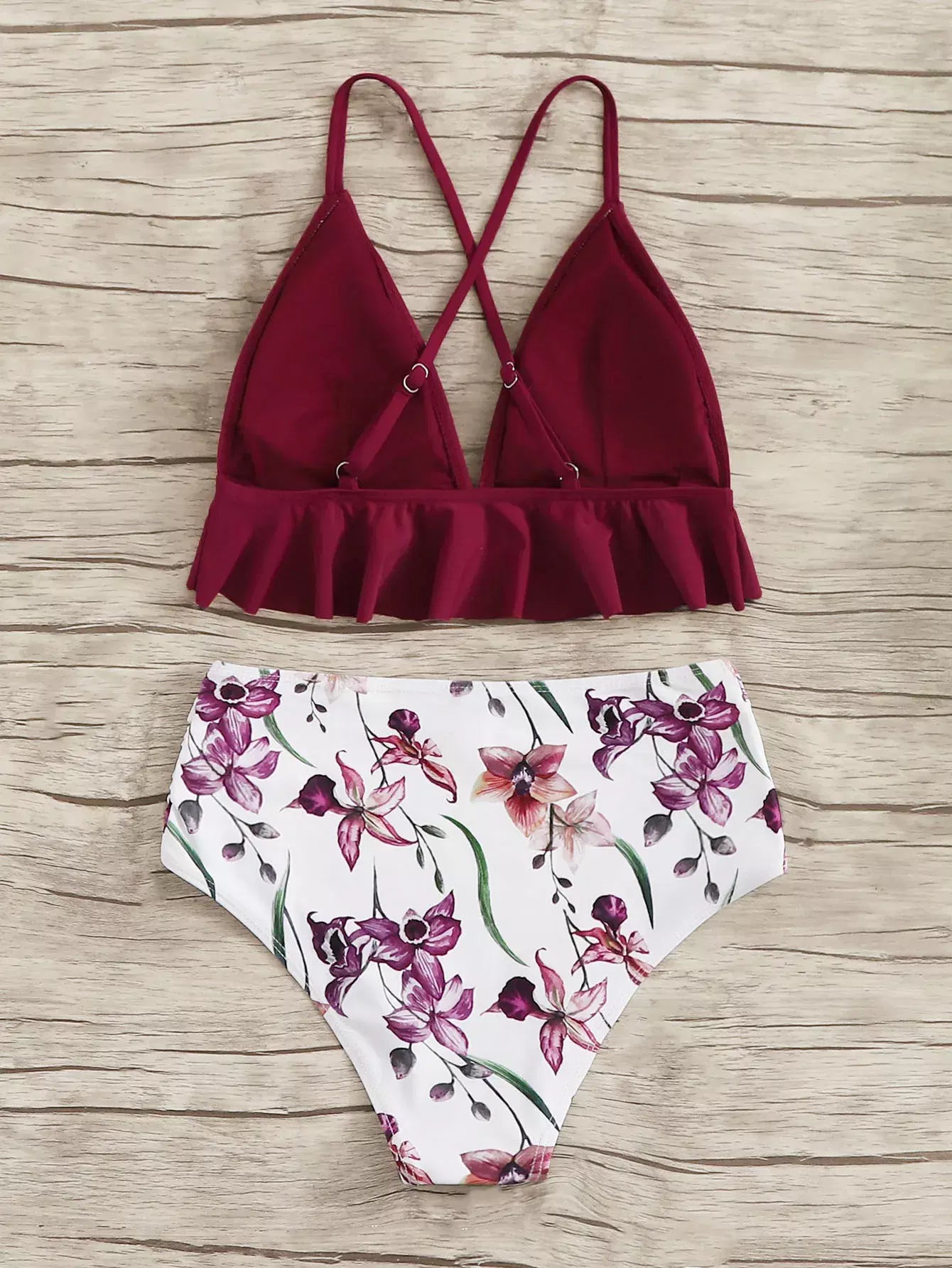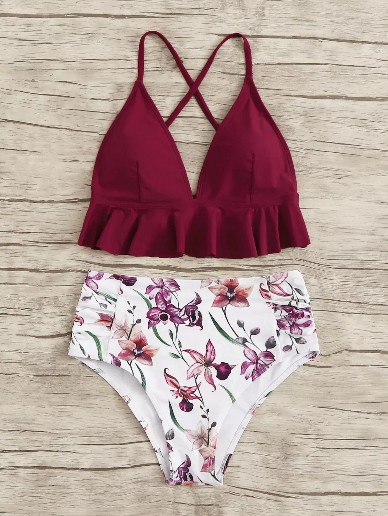 بدلة سباحة بيكيني بحافة كشكش بحزام كريس كروس عالي الخصر