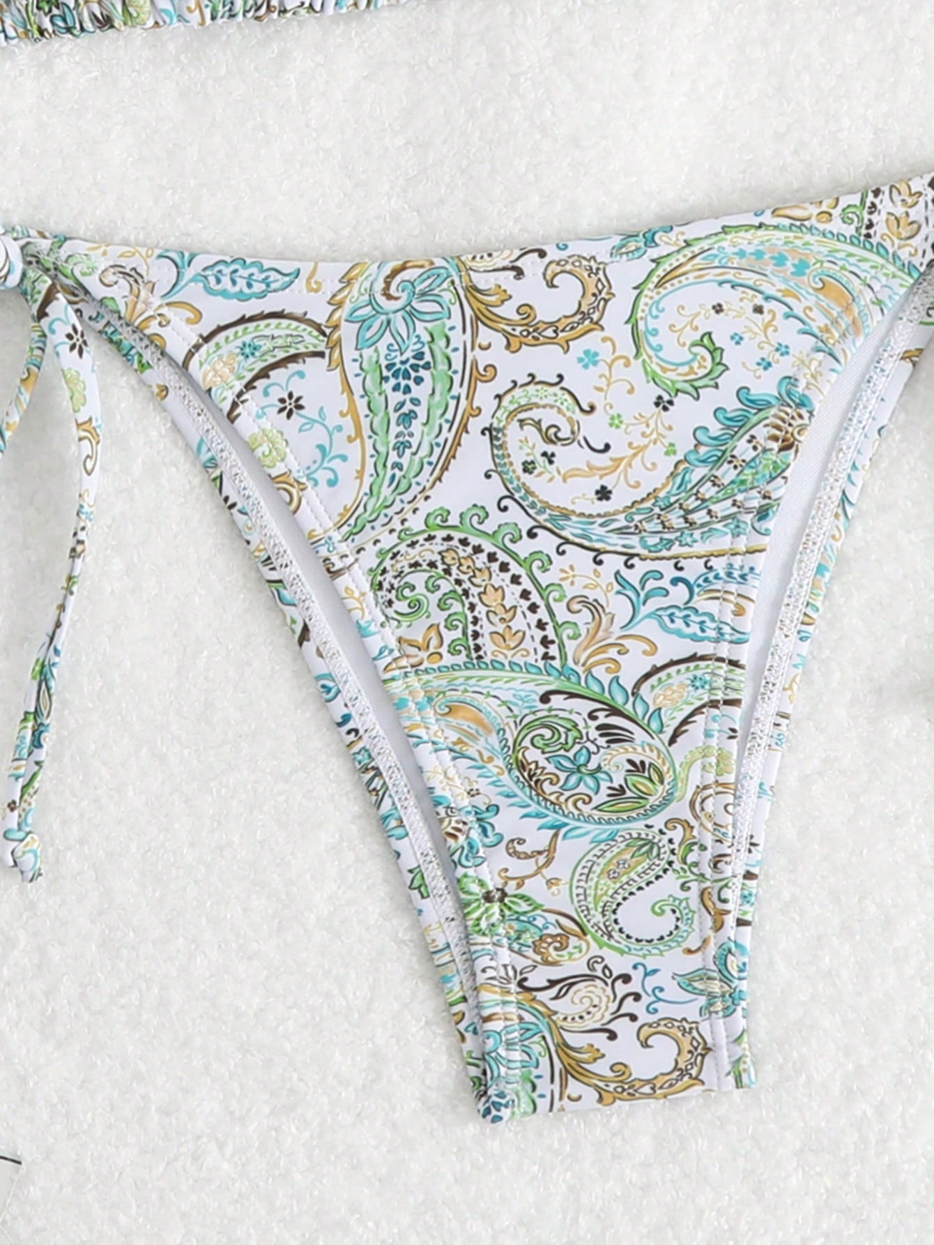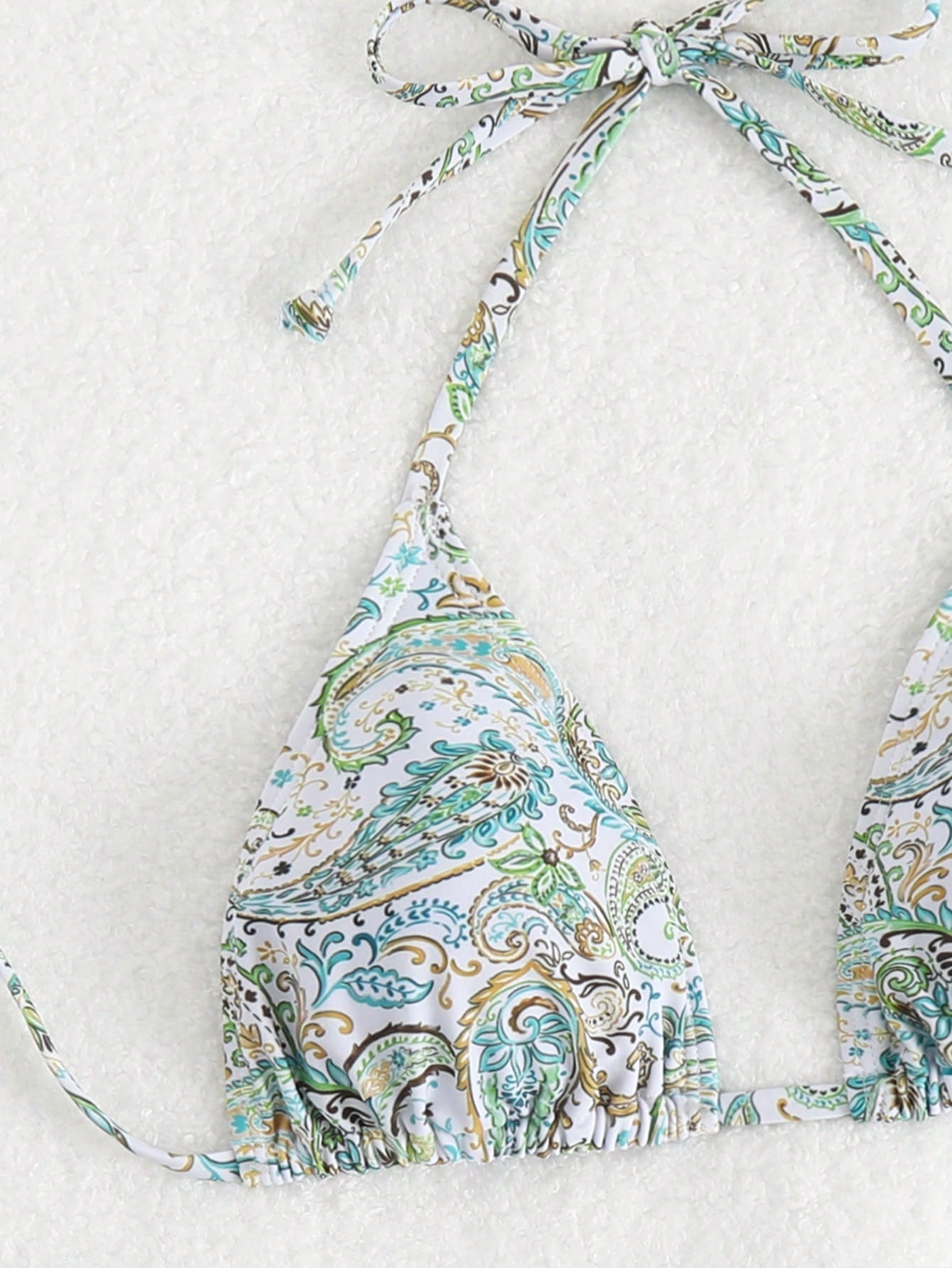طقم بيكيني صيفي للشاطئ، بدون ظهر، بحمالات، بتصميم هالتر، وطبعة عشوائية.