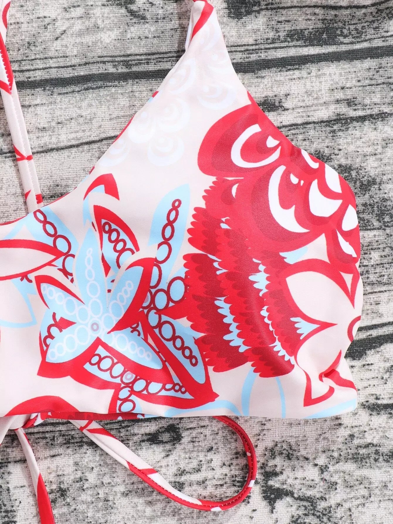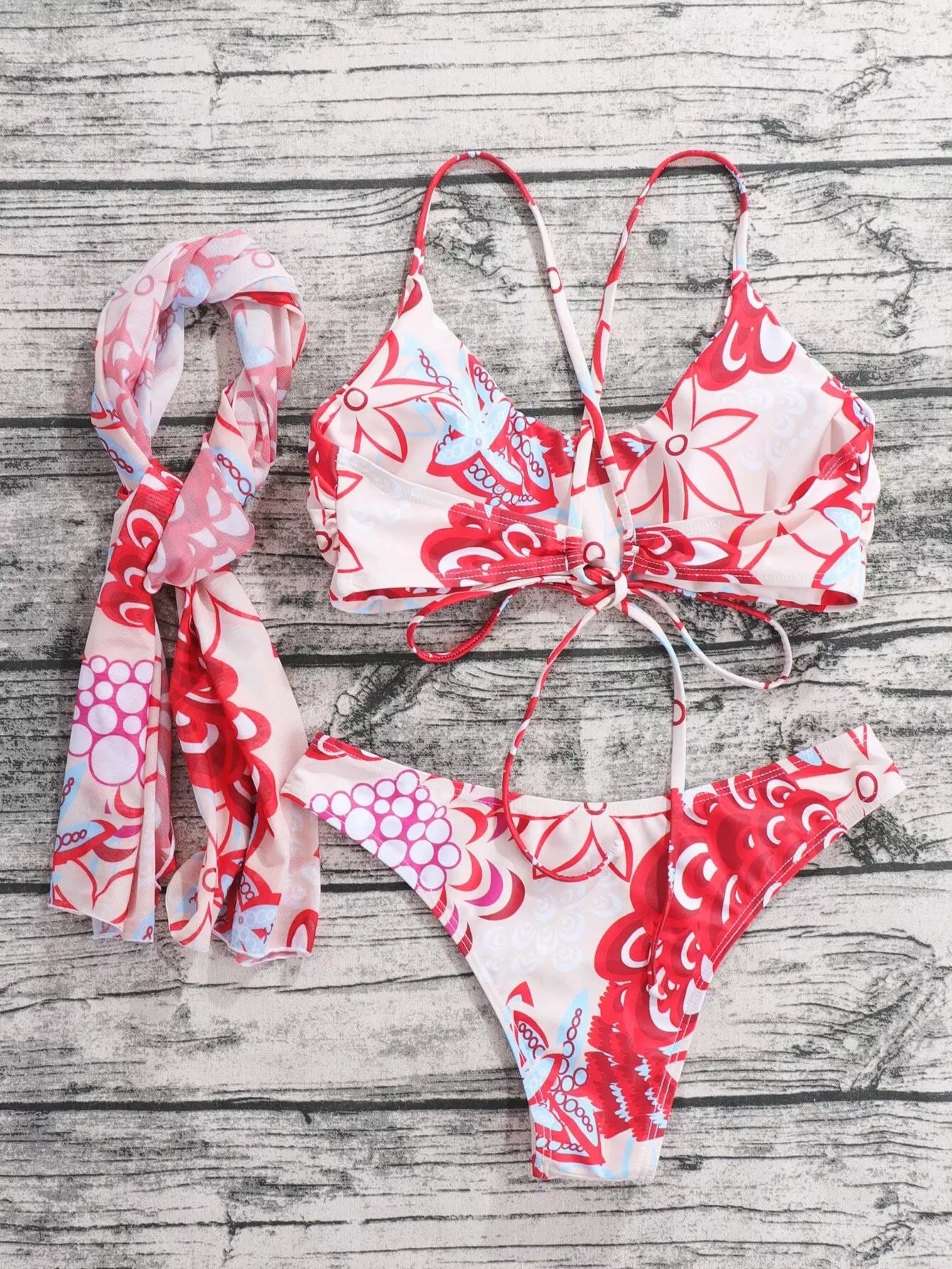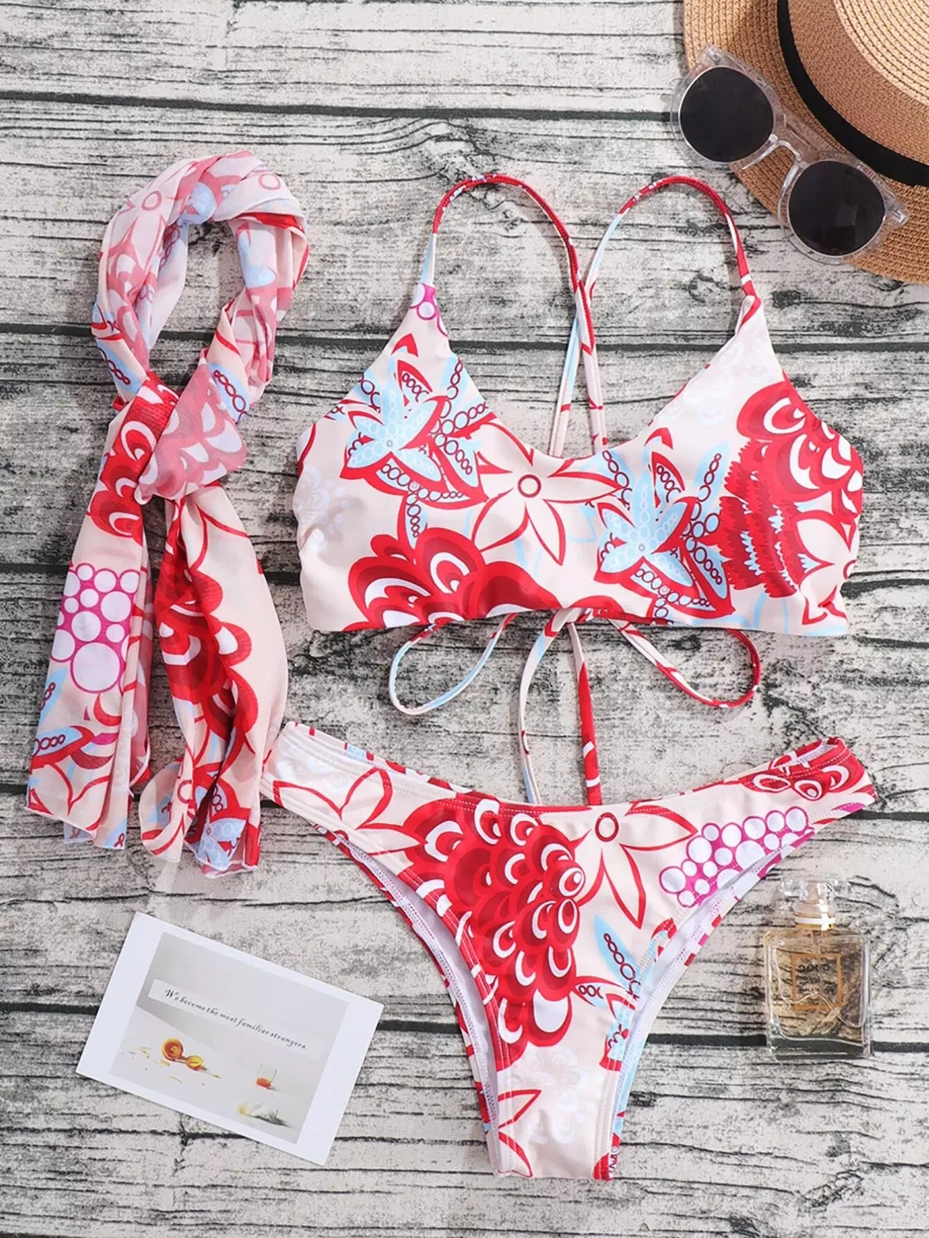 3 عبوات ملابس سباحة بيكيني بطبعة جرافيك ووشاح