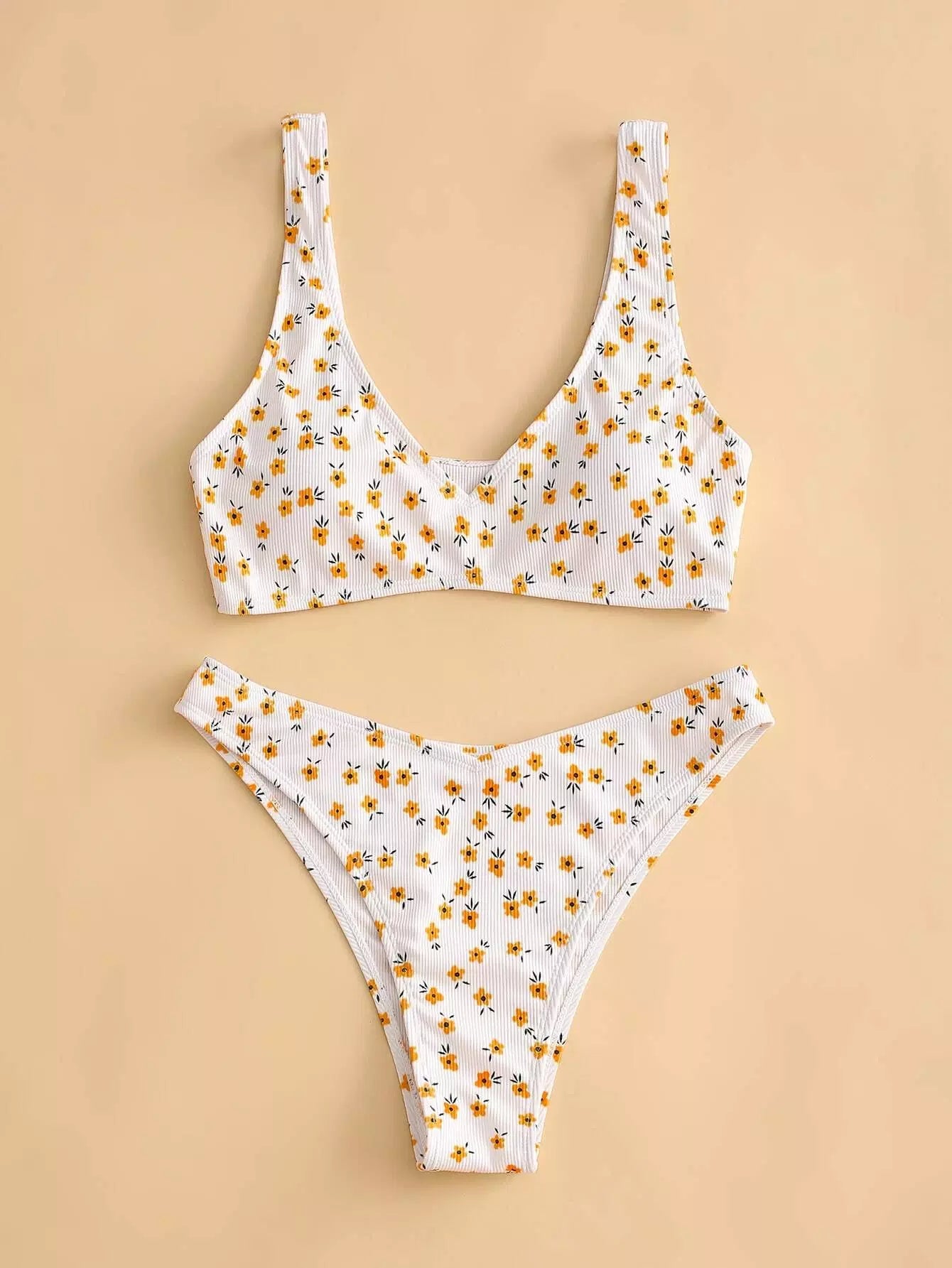 ملابس سباحة بيكيني برقبة على شكل V مطبوع عليها زهور