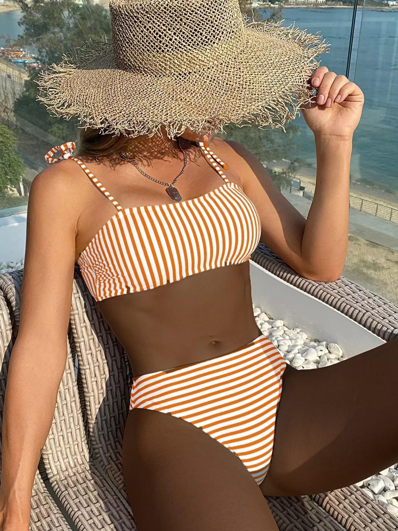ملابس سباحة بيكيني مخطط بربطة كتف بربطة عنق مخططة