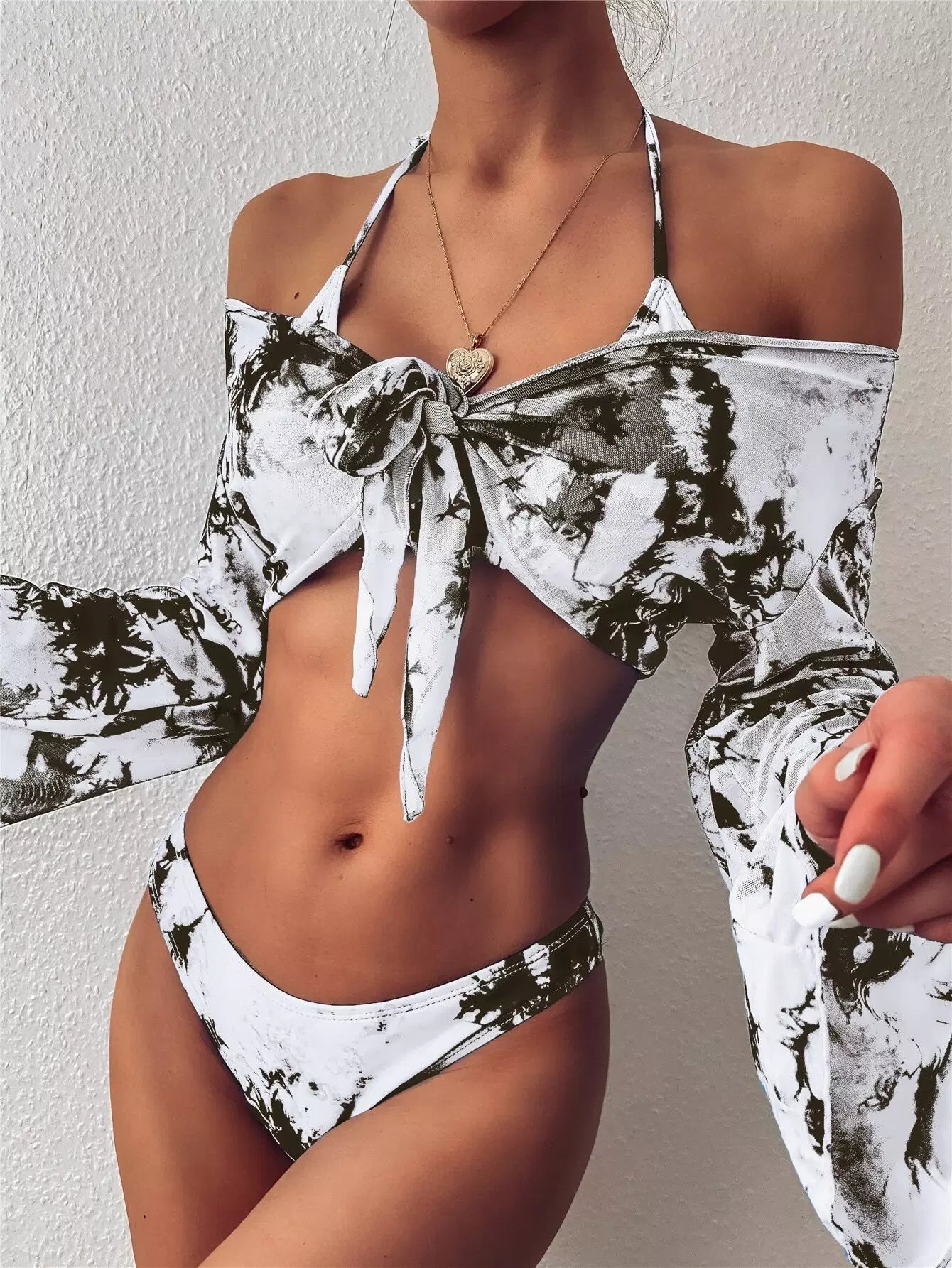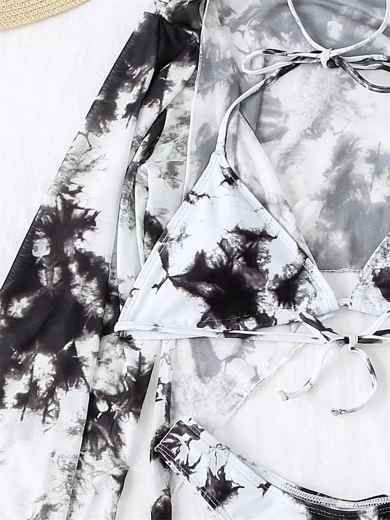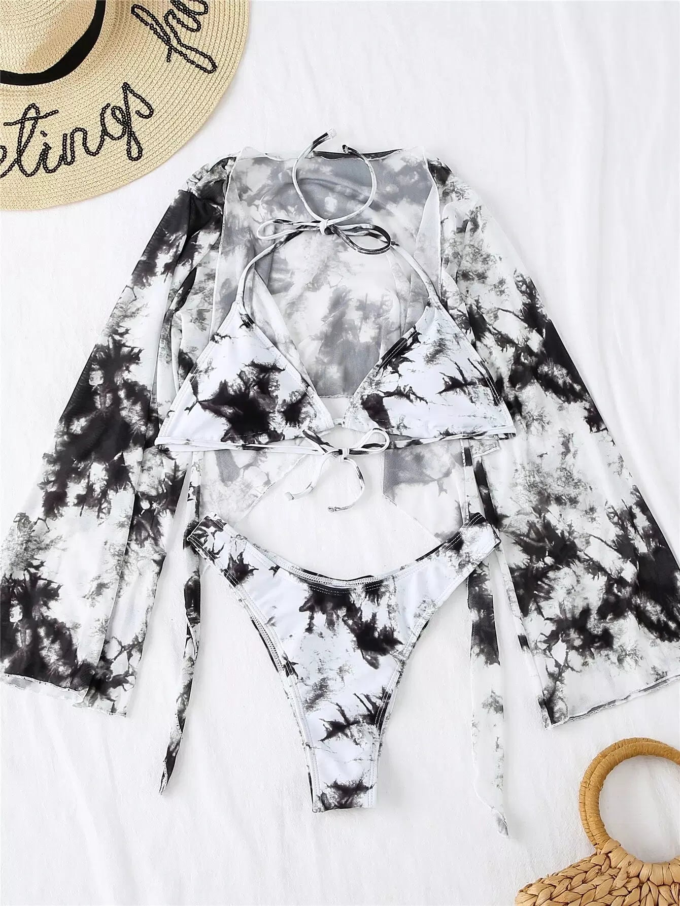 بدلة سباحة بيكيني مثلث مصبوغ بربطة عنق مع كيمونو