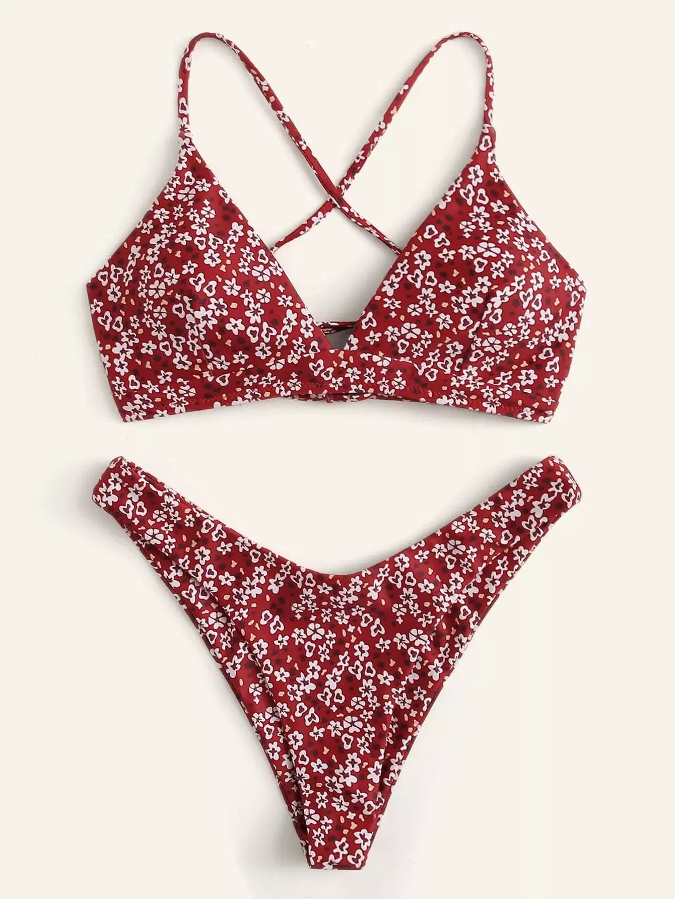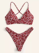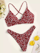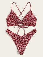 بلوزة علوية بطبعة زهرية عشوائية بأربطة من الخلف مع بيكيني بقصّة عالية