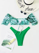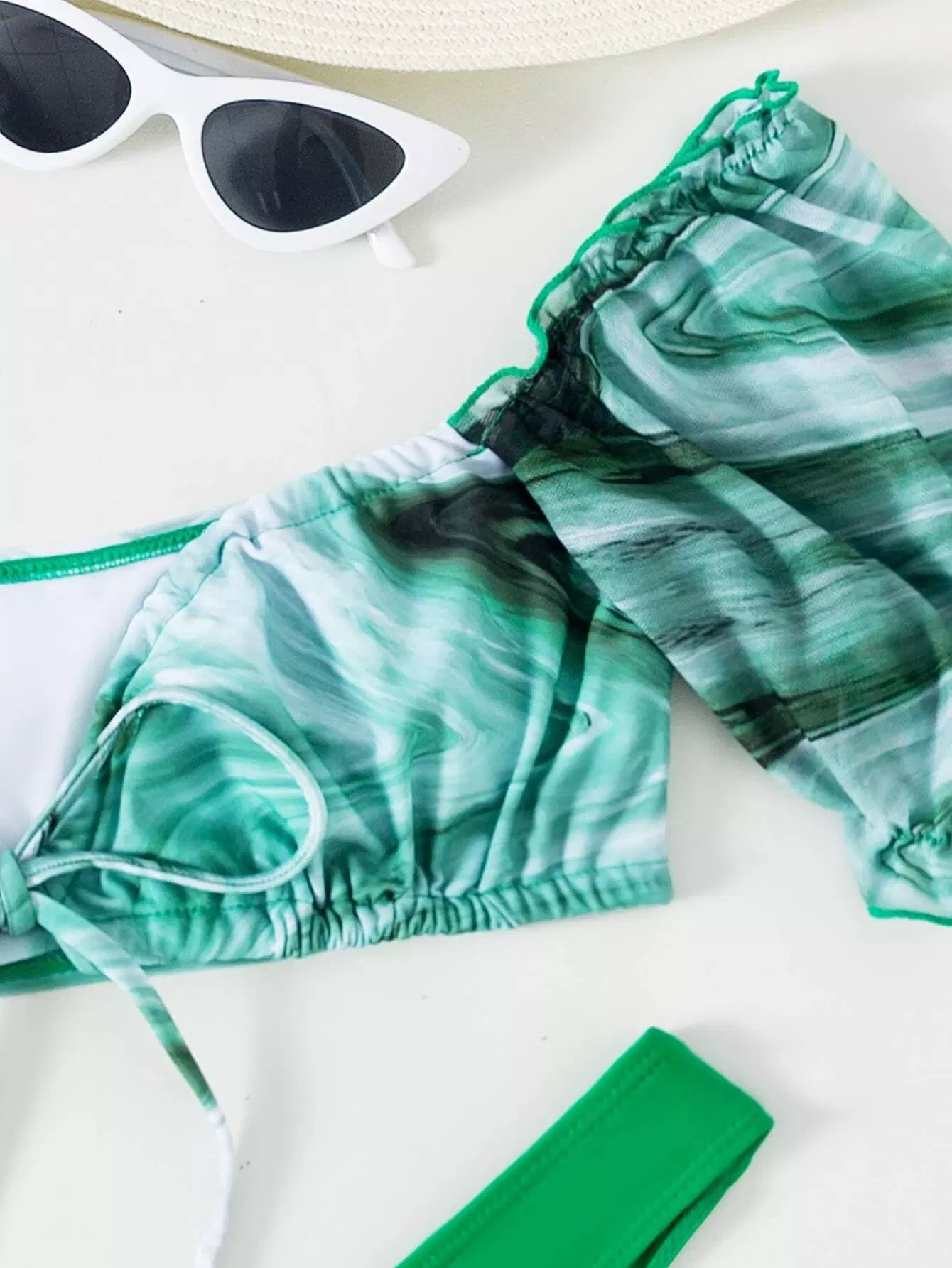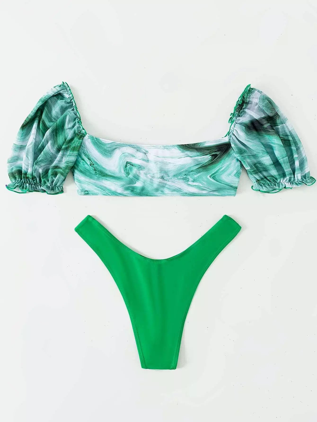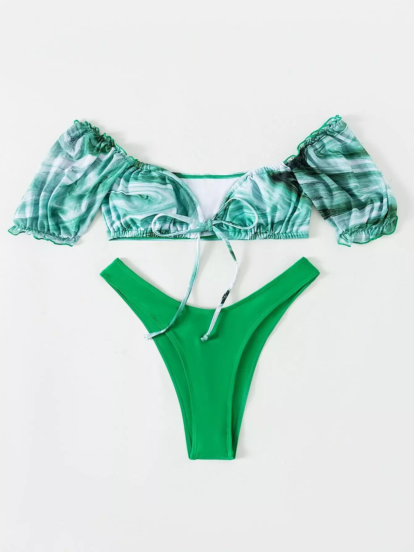بيكيني سباحة بيكيني بطبعة رخامية كشكش أمامي بربطة عنق