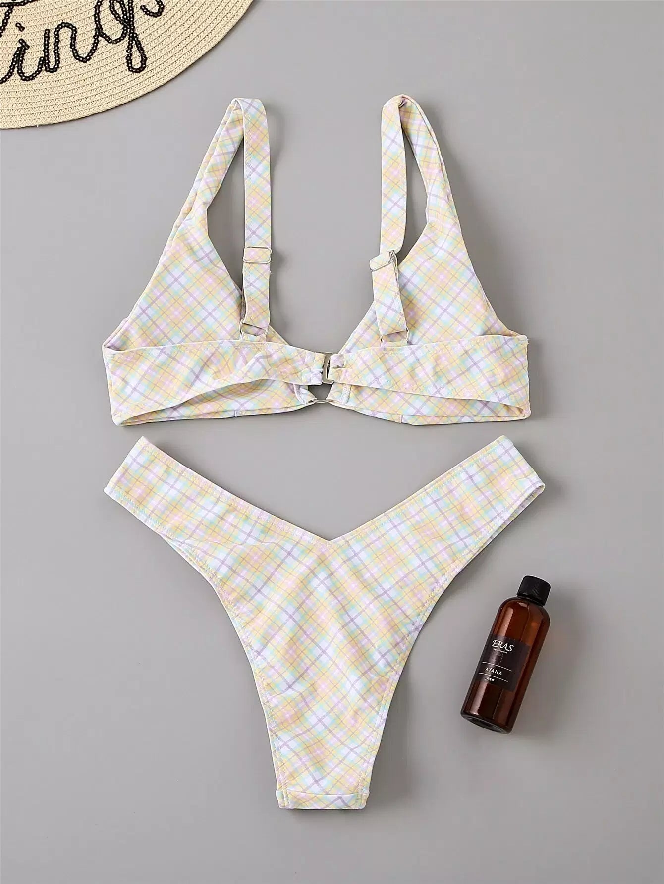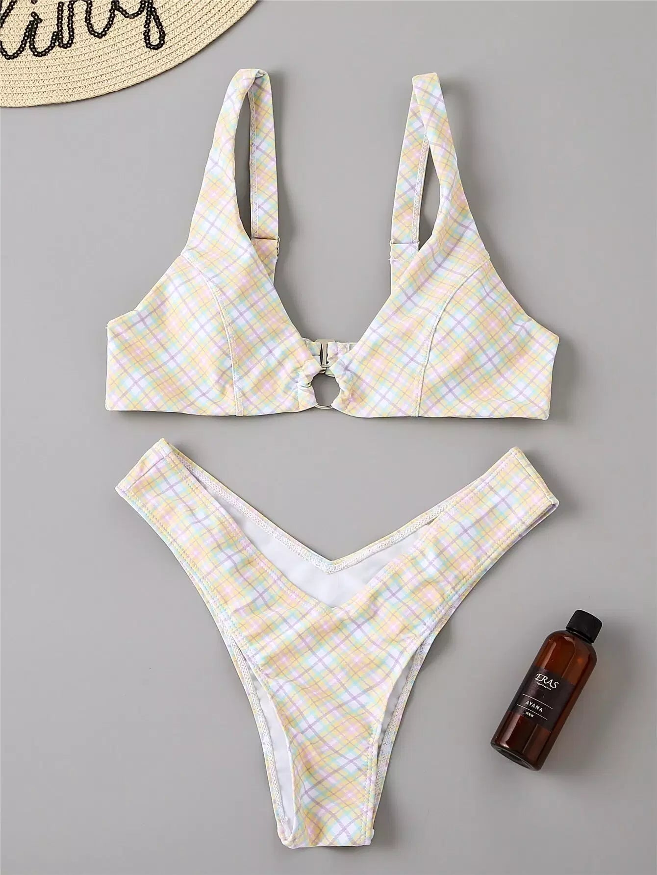 بدلة سباحة بيكيني منقوشة بحلقة منقوشة مربوطة بقصّة عالية